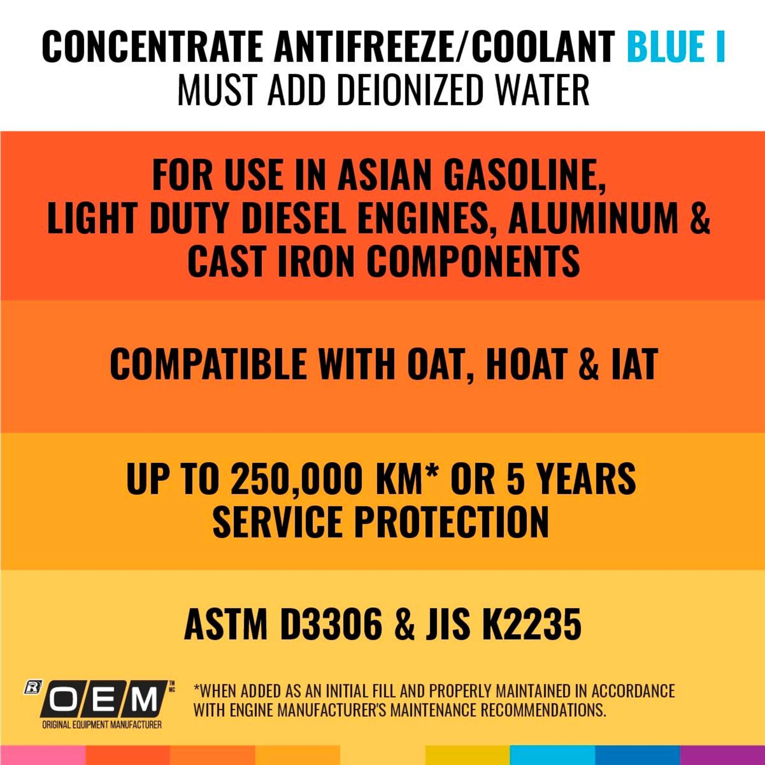 OEM Blue I is specifically made for Asian vehicles and light duty trucks requiring a phosphate-based OAT (Organic Acid Technology) antifreeze/coolant in aluminum engines
