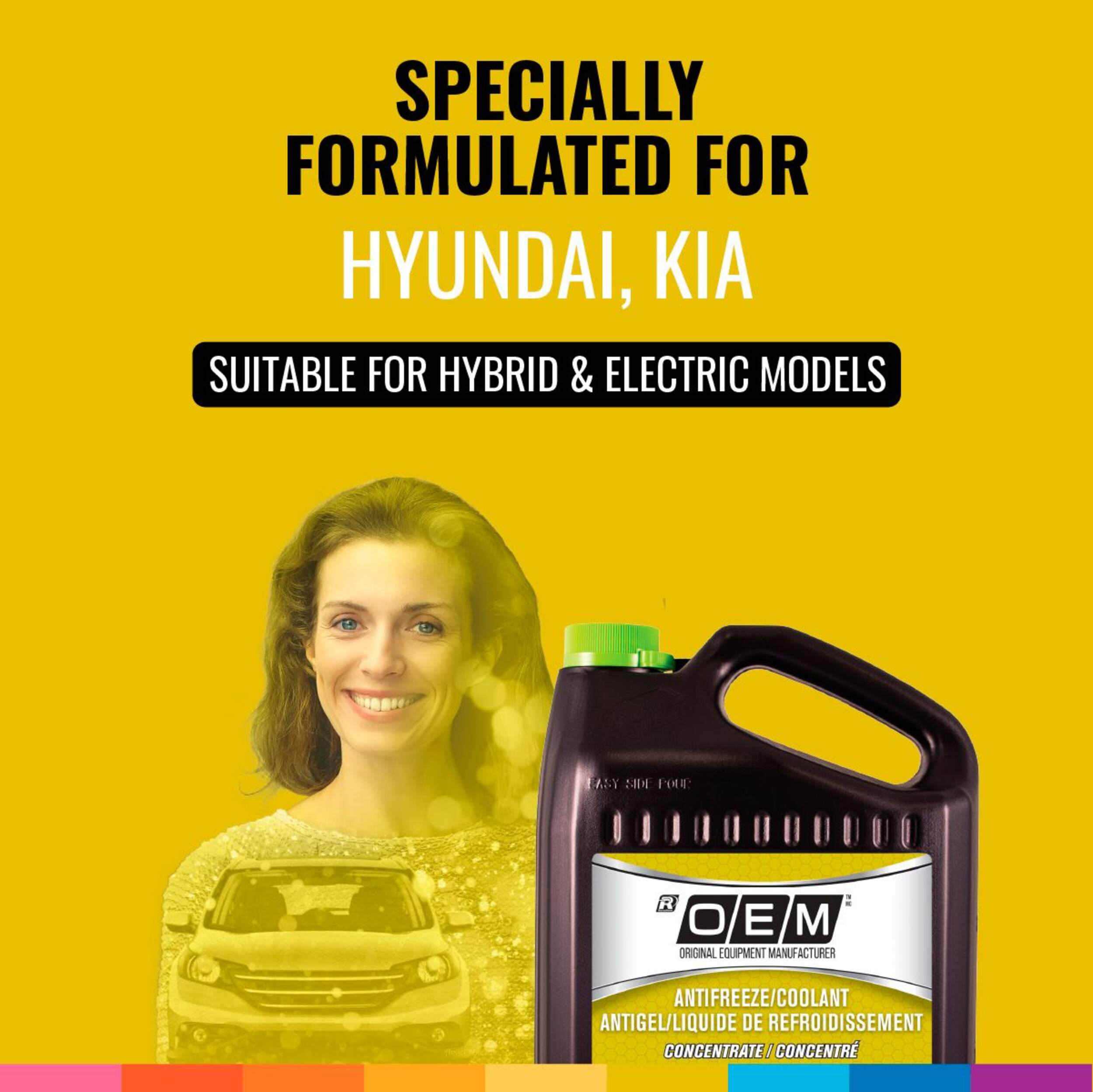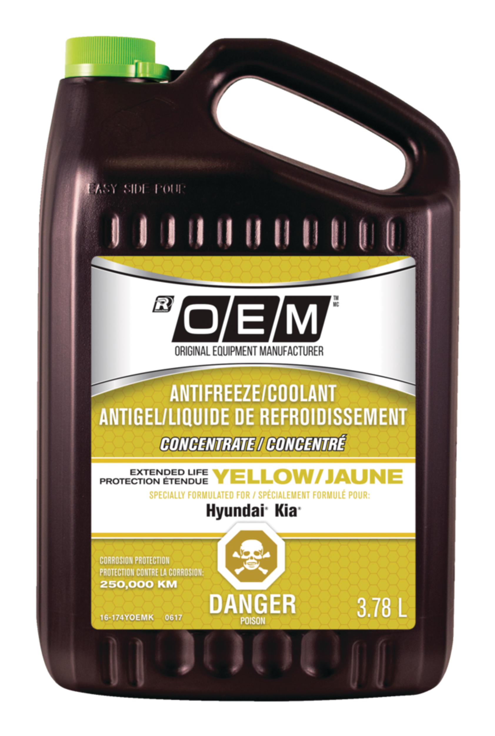 OEM Concentrate Extended Life Antifreeze/Coolant Yellow is specifically formulated for Hyundai and Kia vehicles and is suitable for hybrid & electric models. The engine antifreeze/coolant provides ultimate temperature protection, ranging from -64°C to 136°C*, and prevents summer overheating and winter freezing while providing extended protection against rust, corrosion & pitting caused by cavitation for all coolant system metals. *Temperature range given for 70/30 blend of antifreeze/coolant to deionized water.