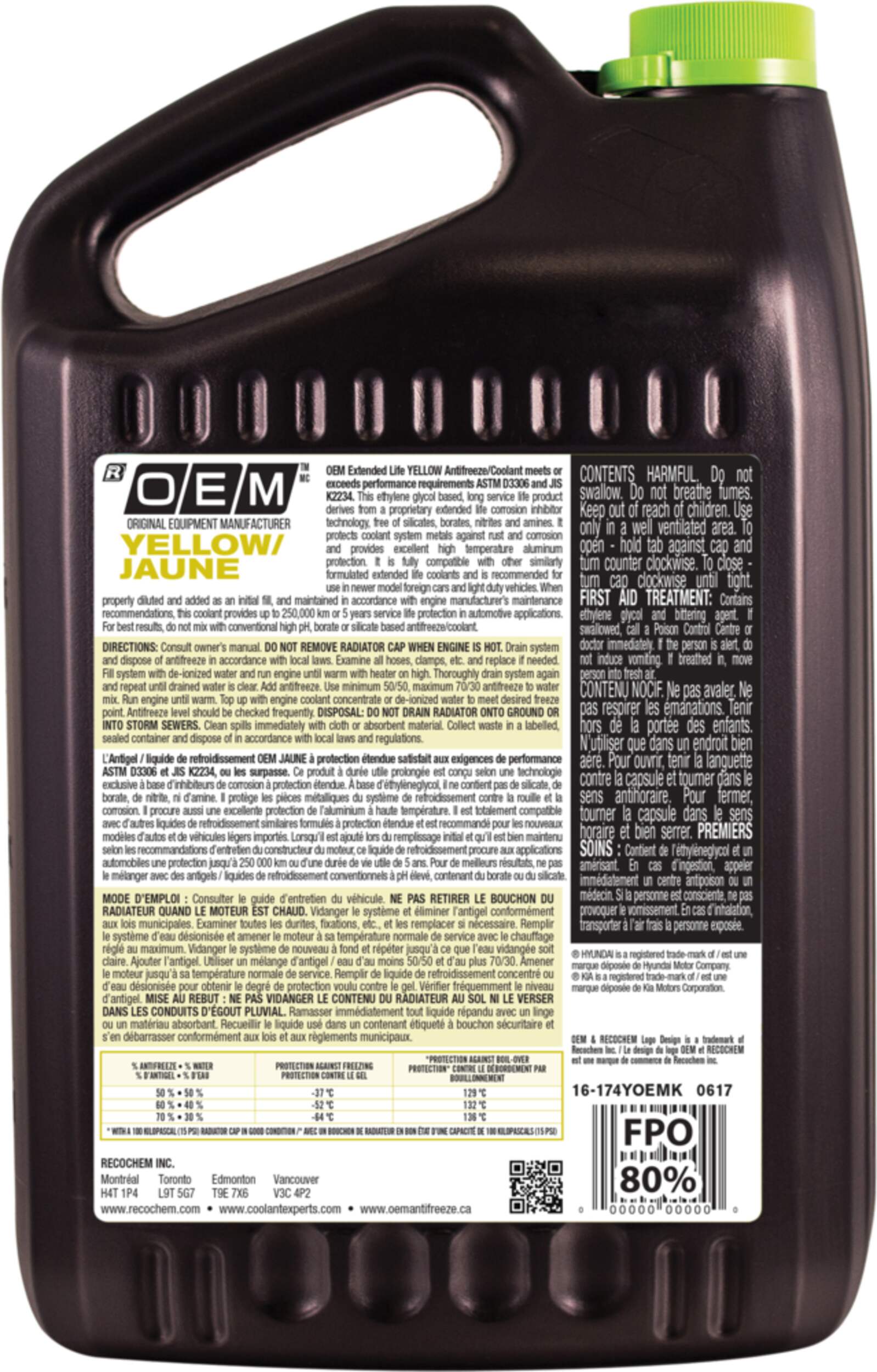 OEM Yellow is specifically made for Asian vehicles and light-duty trucks requiring an OAT (Organic Acid Technology) antifreeze/coolant in aluminum engines
