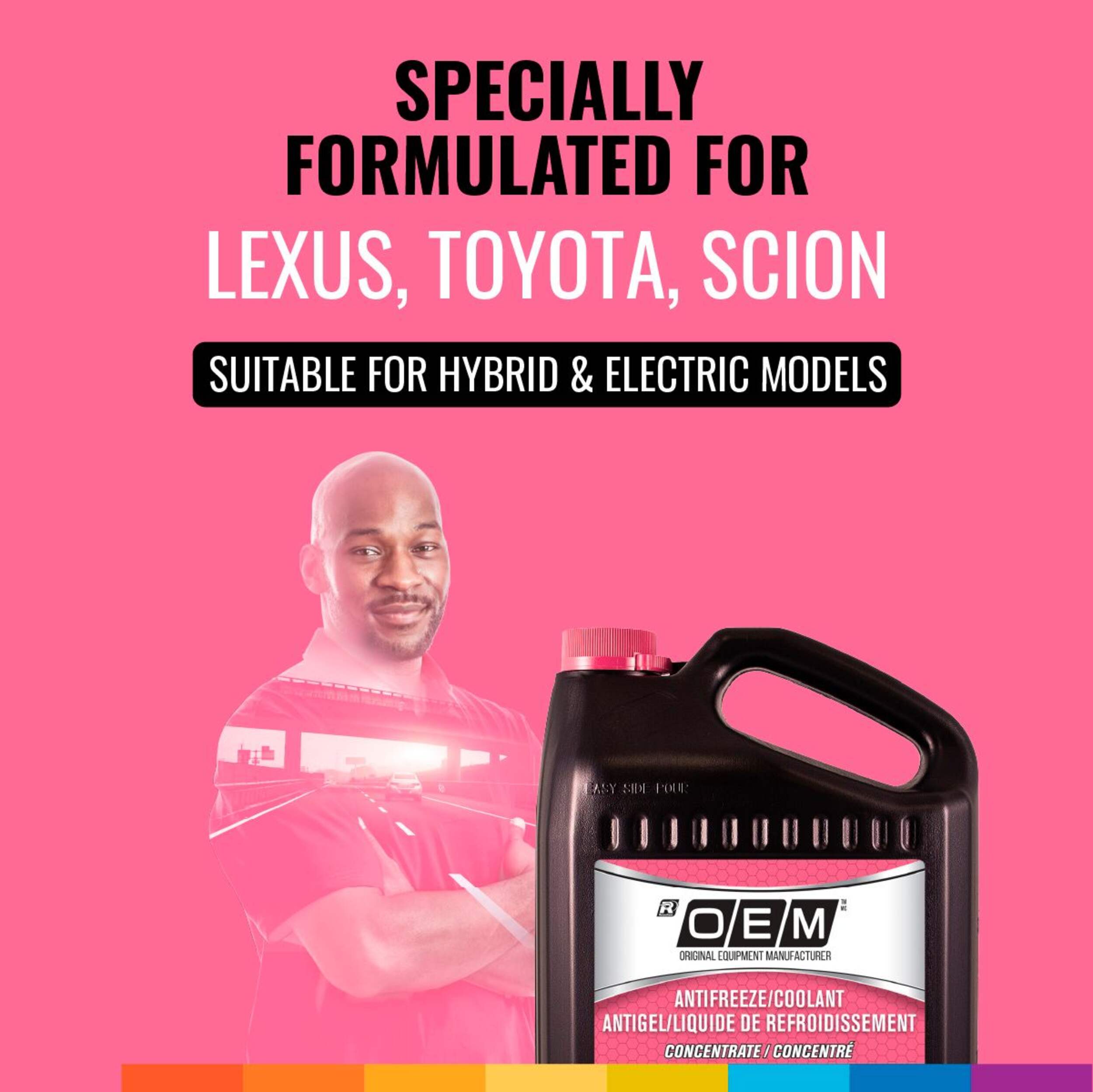 OEM Concentrate Extended Life Antifreeze/Coolant Pink is specifically formulated for Toyota, Scion, and Lexus vehicles and is suitable for hybrid & electric models. The engine antifreeze/coolant provides ultimate temperature protection, ranging from -64°C to 136°C*, and prevents summer overheating and winter freezing while providing extended protection against rust, corrosion & pitting caused by cavitation for all coolant system metals.*Temperature range given for 70/30 blend of antifreeze/coolant to deionized water.