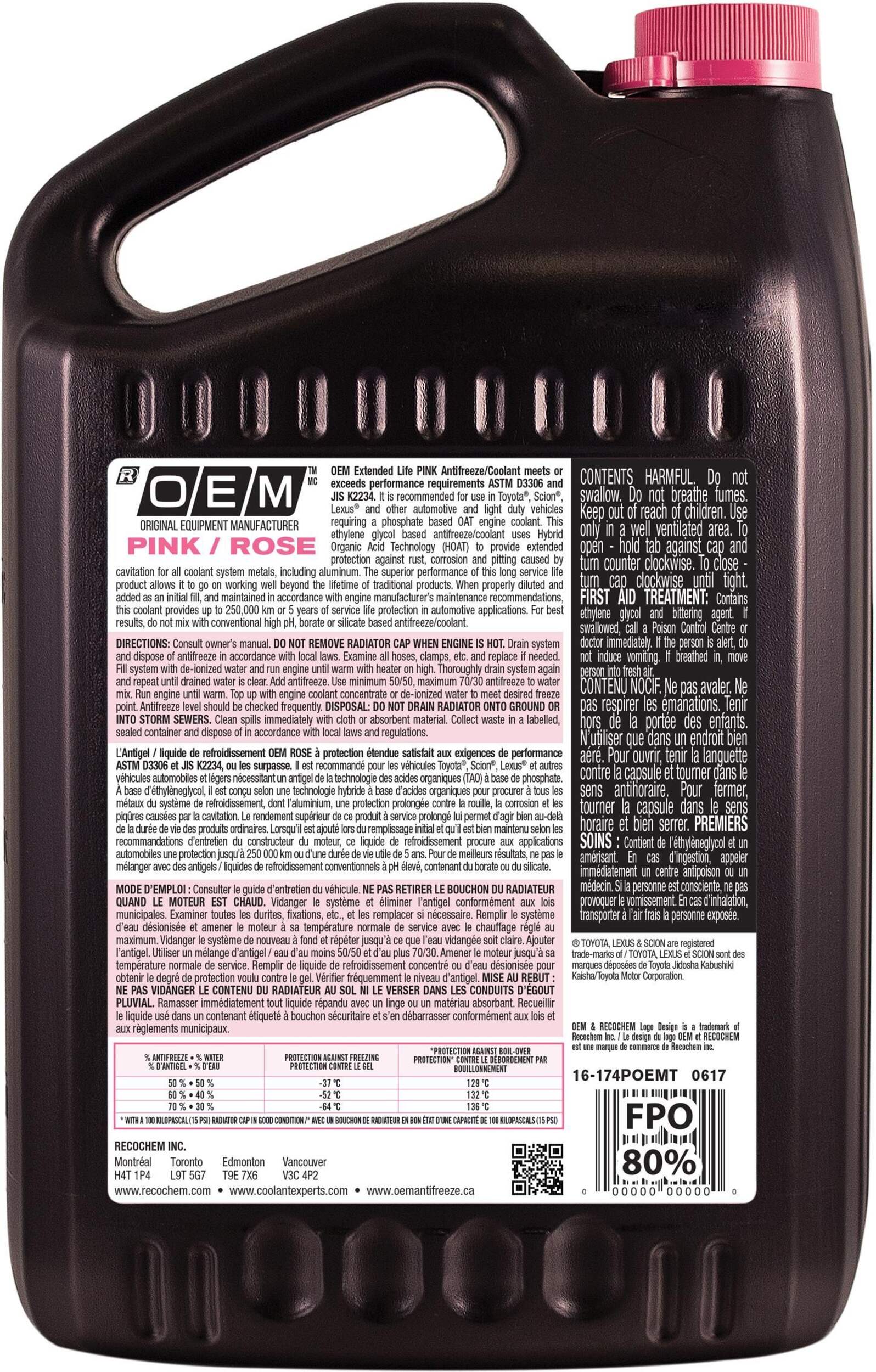 OEM Pink is specifically made for Asian vehicles and light duty trucks requiring a phosphate-based OAT (Organic Acid Technology) antifreeze/coolant in aluminum engines