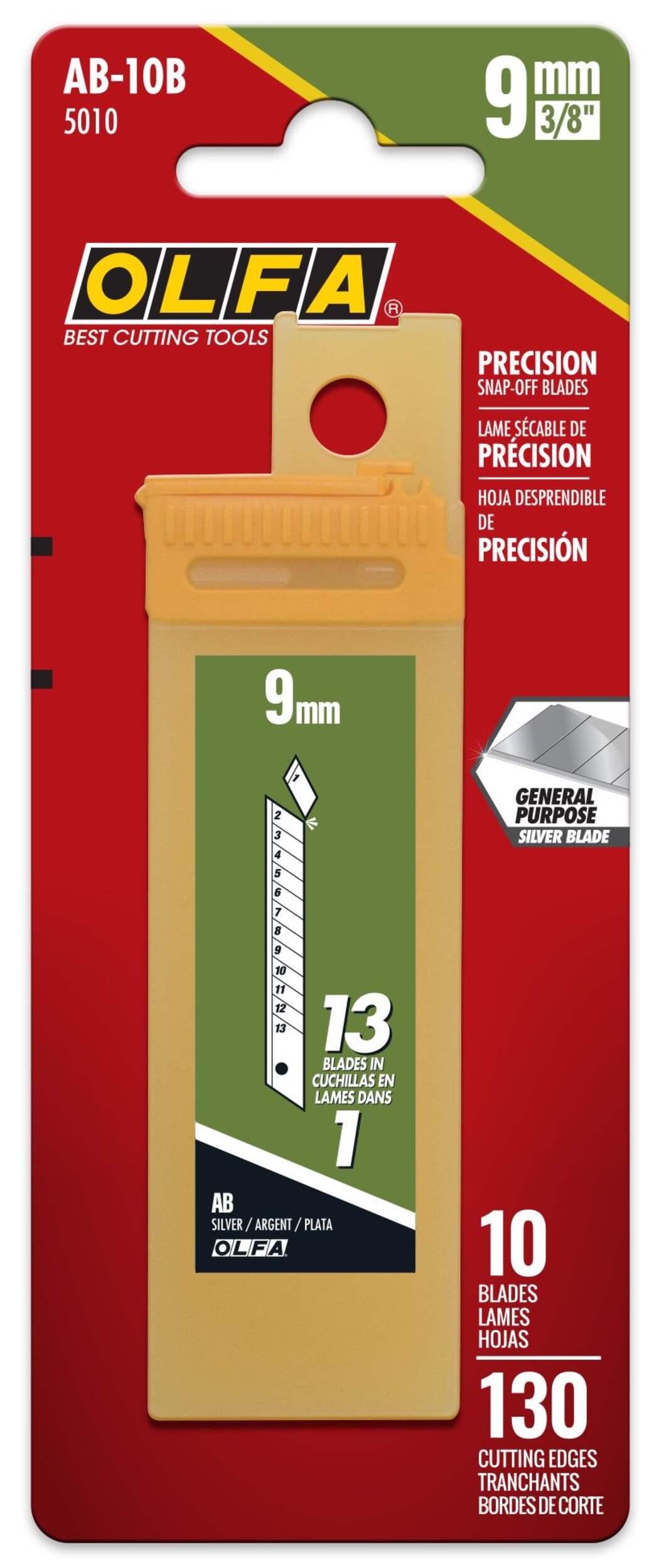 This 10 pack of 9mm standard-duty, snap-off blades is idea for general arts & crafts and just about any other job you point it at. Made in Japan from high quality carbon tool steel, this blade is produced using the OLFA precise multi-step production process for unparalleled sharpness and superior edge retention. Long lasting, durable snap-off blade - a new sharp edge with each snap-off.