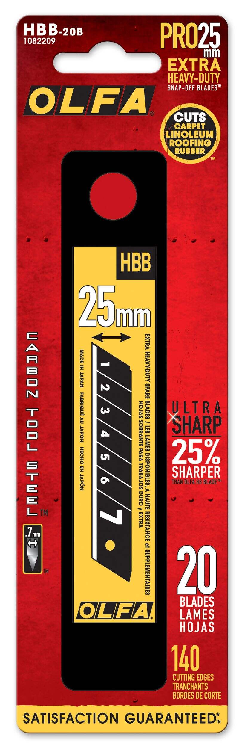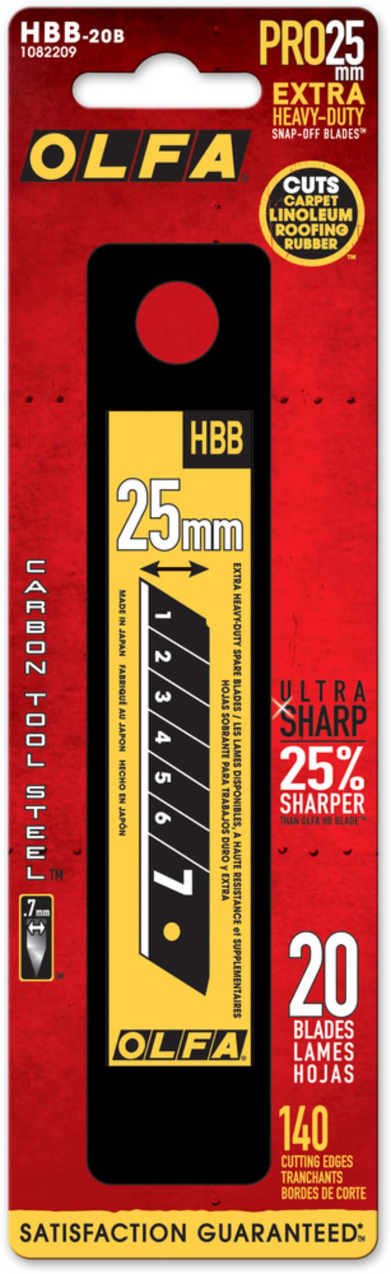 The OLFA -20B Pro Ultra-Sharp Extra Heavy-Duty Snap-Off Blades are crafted for the most demanding tasks. Made from premium Japanese carbon tool steel and dual-honed to be 25% sharper than standard silver blades, these blades are built to handle tough materials like gaskets, conduit, synthetics, and more. Each 1-in wide blade has seven edge segments, ensuring you can quickly snap off a dull section and continue cutting with a fresh edge. Ideal for industrial applications, these ultra-sharp black snap blades provide the extra leverage needed for heavy-duty materials.