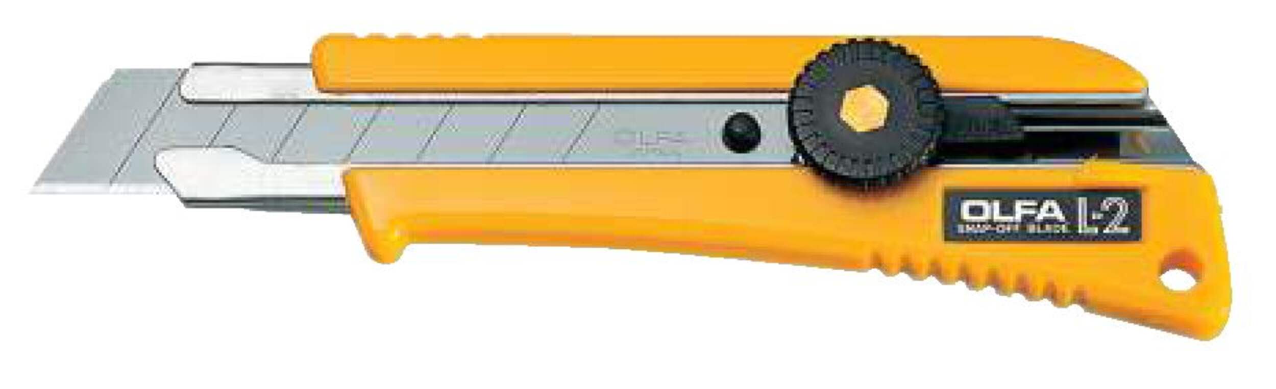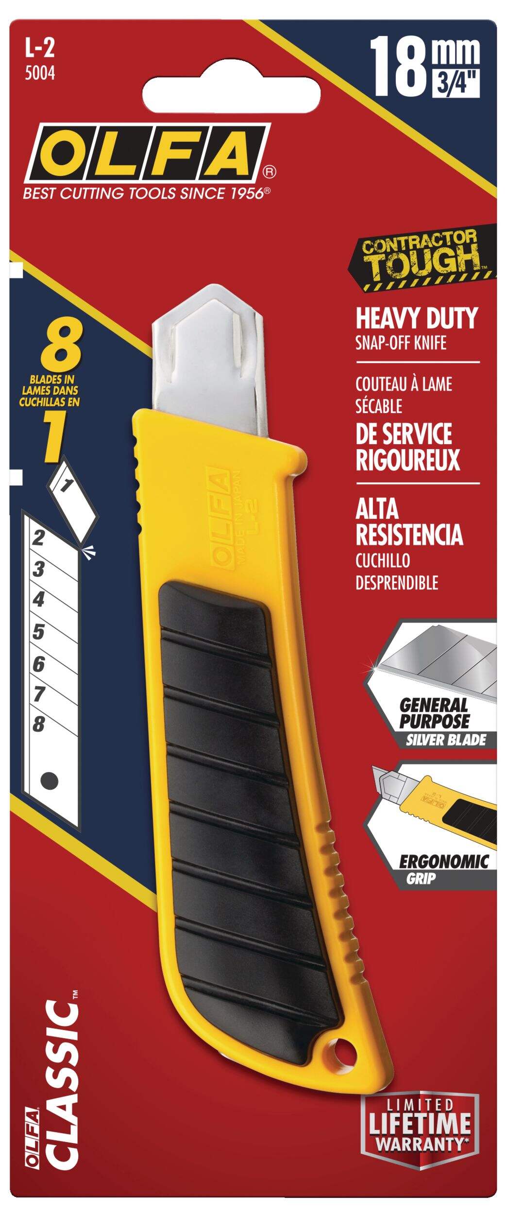 When you need a better grip, select the OLFA 18 mm L-2 Classic Heavy-Duty Utility Knife with Rubber Inset. This knife features a durable ABS handle with an anti-slip rubber inset on the back for secure handling. A ratchet-wheel locking system provides boundless blade positioning in a single touch. Dial the blade to lock it into any cutting position and loosen it to retract. A stainless-steel channel runs the length of the blade to cut with confidence. Preloaded with a tough, silver snap blade, this knife is ready to tackle any job right out of the package. Eight segments per blade coupled with snap-blade technology aid in productivity. When the blade dulls, a quick snap delivers a fresh blade. Simple, tool-free blade changes maintain efficiency.