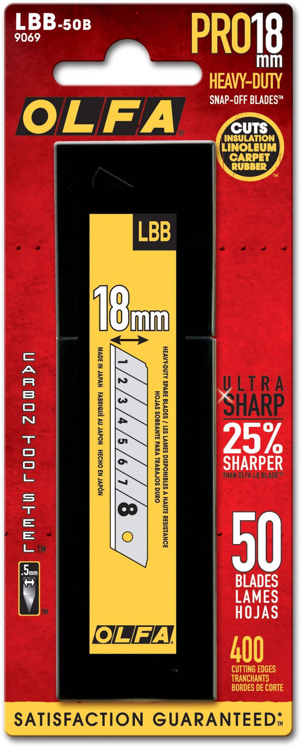 For cutting tasks that demand precision and sharpness, choose OLFA® Ultra-Sharp Snap-Off Blades. Crafted from carbon tool steel and double-honed for maximum sharpness, these black blades deliver exceptional cutting power. Ideal for tough materials like drywall, linoleum, carpet, flooring, insulation, and roofing, they handle construction jobs with ease. With a 25% sharper edge than standard silver blades, they reduce cutting resistance, allowing for smoother, more efficient cuts every time.