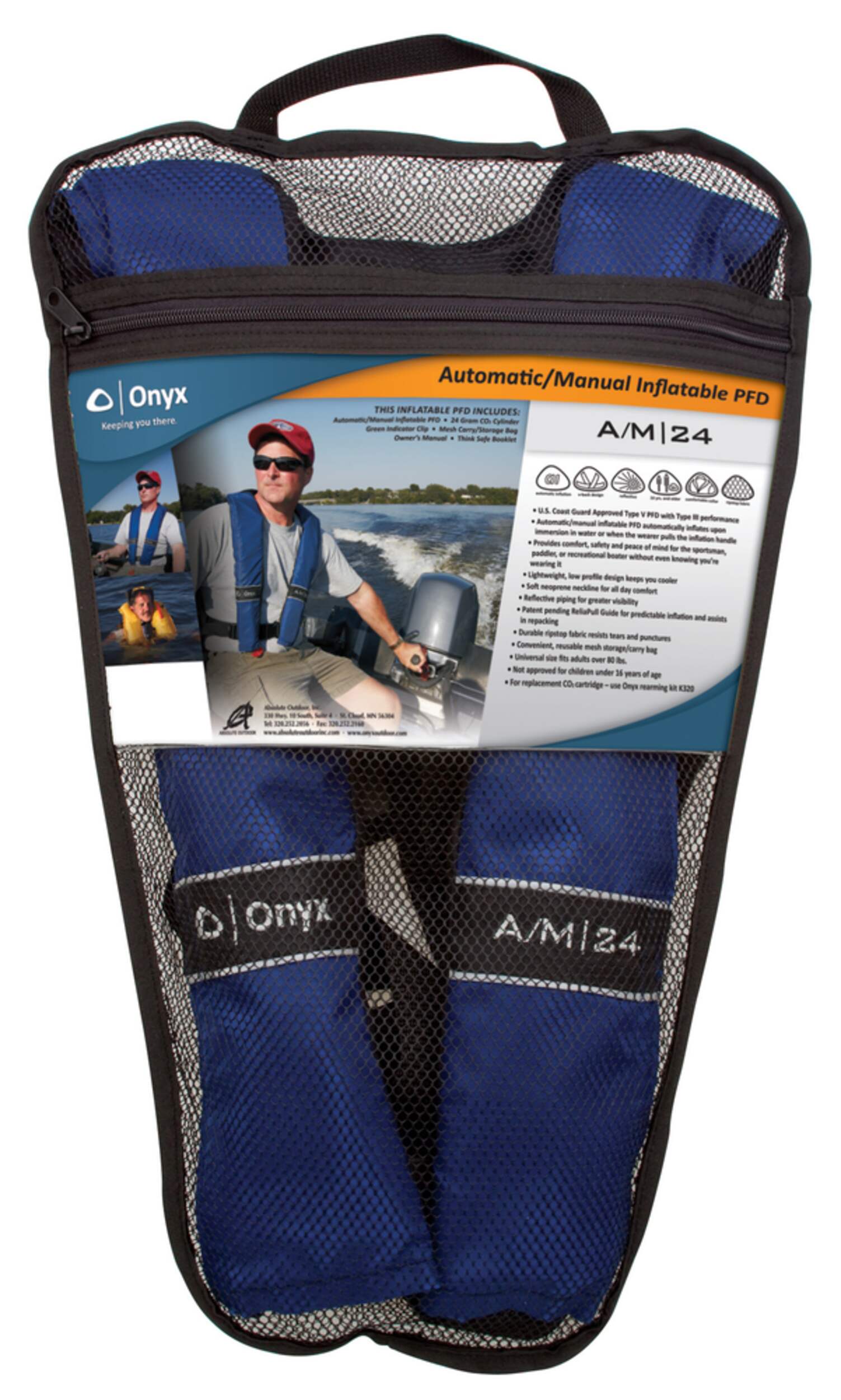 24 g inflatable PFD converts from automatic to manual, and has a lightweight