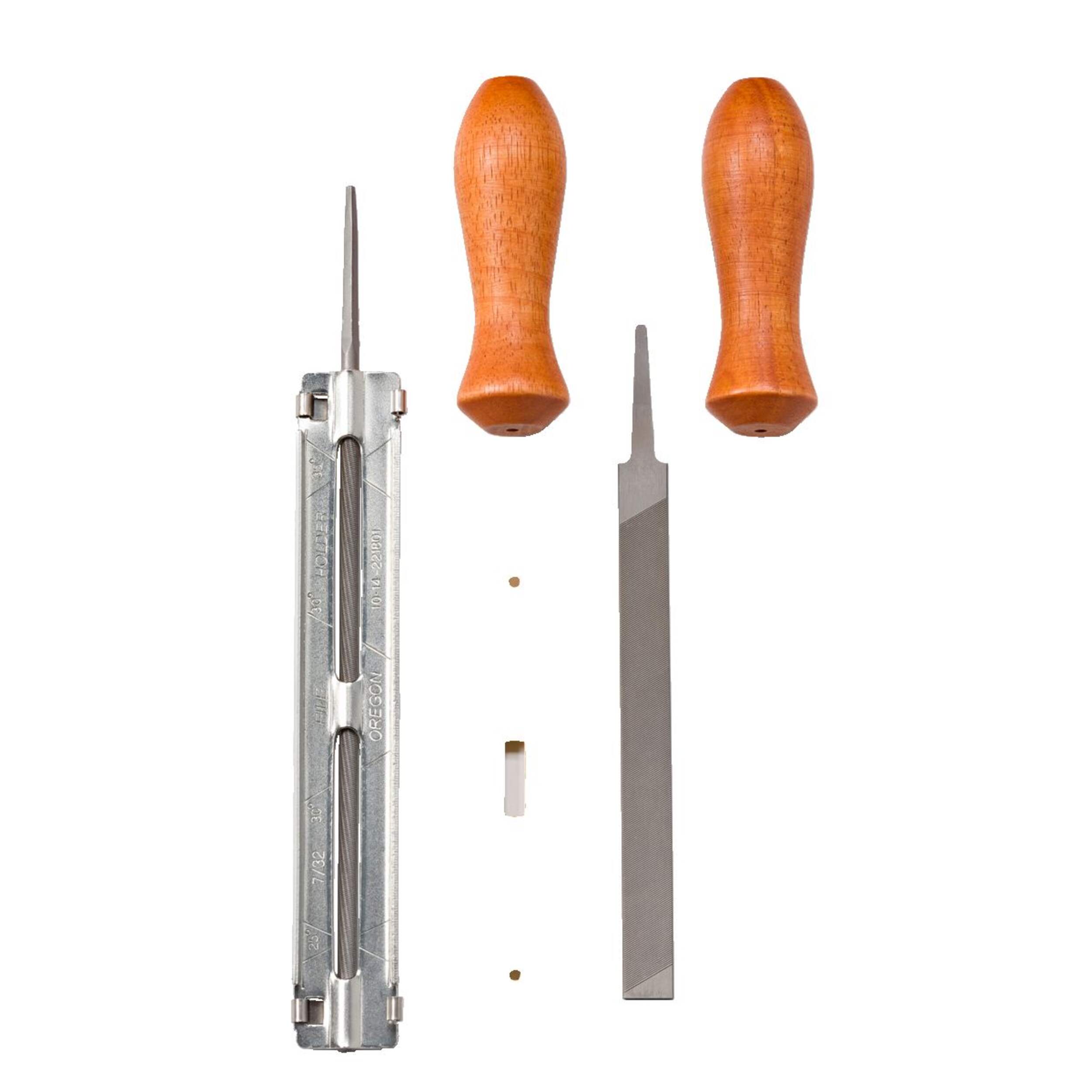 Includes: (1) file guide, (2) wooden file handles, (1) round file, (1) flat file, (1) 0.025" drop-centre depth gauge tool