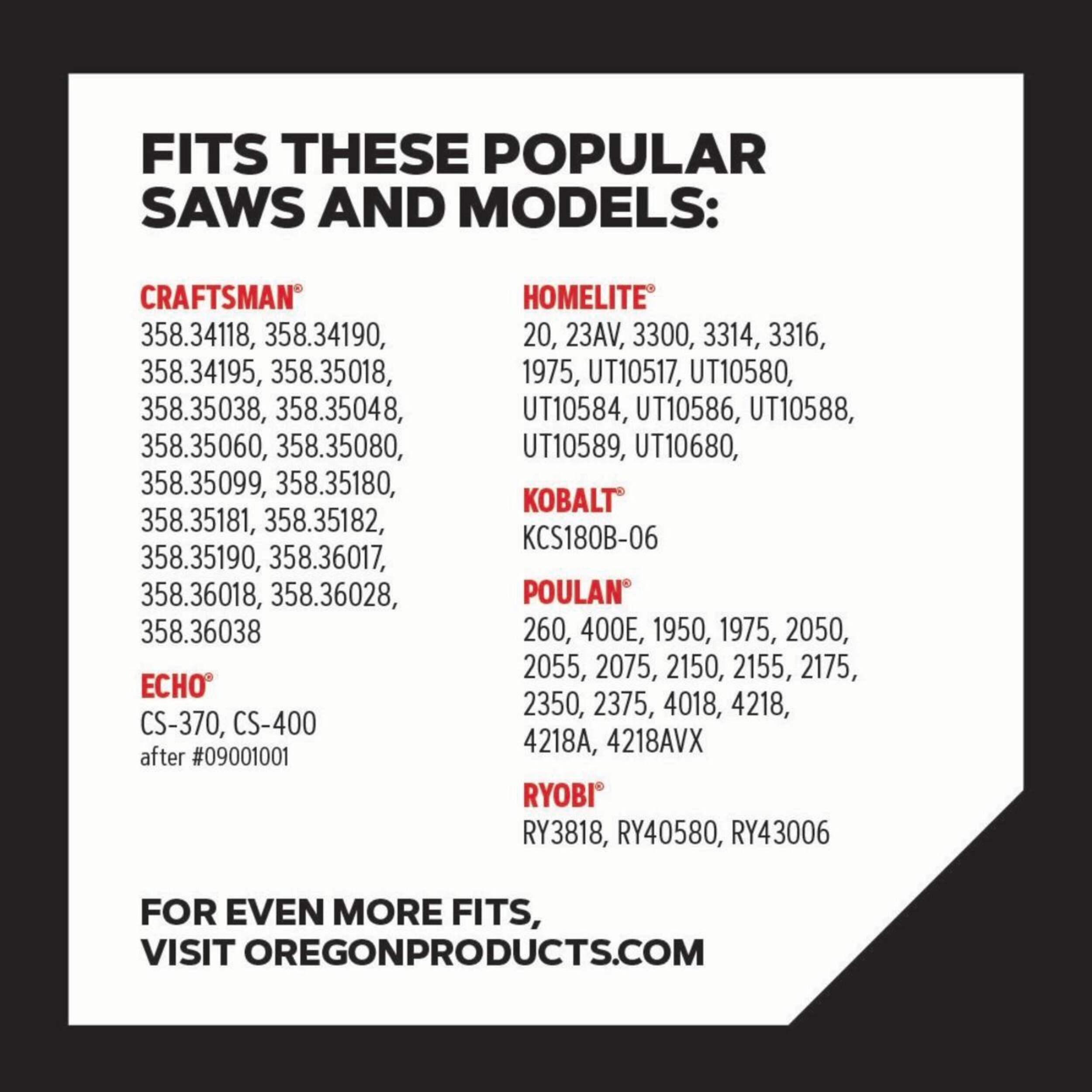 | Fitment Brand-Models | Black & Decker|CS1518, Craftsman|358.34094, Craftsman|CMXGSAMCX4218, Craftsman|944.41801, Craftsman|358.38170, Craftsman|358.38160, Craftsman|358.36218, Craftsman|358.36088, Craftsman|358.36087, Craftsman|358.36085, Craftsman|358.36083, Craftsman|358.36082, Craftsman|358.36080, Craftsman|358.36069, Craftsman|358.36068, Craftsman|358.36038, Craftsman|358.36036, Craftsman|358.34101, Craftsman|358.36028, Craftsman|358.36026, Craftsman|358.36013, Craftsman|358.36018, Craftsman|358.36017, Craftsman|358.36015, Craftsman|358.36010, Craftsman|358.36012, Craftsman|358.35802, Craftsman|358.35736, Craftsman|358.34102, Craftsman|358.35723, Craftsman|358.35718, Craftsman|358.35514, Craftsman|358.35624, Craftsman|358.35506, Craftsman|358.35516, Craftsman|358.35512, Craftsman|358.35508, Craftsman|358.35505, Craftsman|358.34104, Craftsman|358.35504, Craftsman|358.35283, Craftsman|358.35366, Craftsman|358.35367, Craftsman|358.35363, Craftsman|358.35281, Craftsman|358.35280, Craftsman|358.35273, Craftsman|358.35270, Craftsman|358.35269, Craftsman|358.35268, Craftsman|358.35211, Craftsman|358.35267, Craftsman|358.34106, Craftsman|358.35266, Craftsman|358.35263, Craftsman|358.35236, Craftsman|358.35235, Craftsman|358.35231, Craftsman|358.35207, Craftsman|358.35218, Craftsman|358.35216, Craftsman|358.35206, Craftsman|358.35215, Craftsman|358.35205, Craftsman|358.34108, Craftsman|358.35203, Craftsman|358.35202, Craftsman|358.35198, Craftsman|358.35190, Craftsman|358.35160, Craftsman|358.35182, Craftsman|358.35181, Craftsman|358.35180, Craftsman|358.35171, Craftsman|358.35170, Craftsman|358.34109, Craftsman|358.35161, Craftsman|358.35158, Craftsman|358.35156, Craftsman|358.35148, Craftsman|358.35116, Craftsman|358.35146, Craftsman|358.35145, Craftsman|358.35144, Craftsman|358.35138, Craftsman|358.35136, Craftsman|358.35134, Craftsman|358.34110, Craftsman|358.35118, Craftsman|358.35117, Craftsman|358.35115, Craftsman|358.35108, Craftsman|358.35114, Craftsman|358.35106, Craftsman|358.35099, Craftsman|358.35104, Craftsman|358.35093, Craftsman|358.34111, Craftsman|358.35088, Craftsman|358.35083, Craftsman|358.35087, Craftsman|358.35082, Craftsman|358.35081, Craftsman|358.35080, Craftsman|358.35067, Craftsman|358.35066, Craftsman|358.35046, Craftsman|358.35058, Craftsman|358.35060, Craftsman|358.35056, Craftsman|358.35048, Craftsman|358.35044, Craftsman|358.34114, Craftsman|358.35038, Craftsman|358.35026, Craftsman|358.35037, Craftsman|358.35036, Craftsman|358.35028, Craftsman|358.34115, Craftsman|358.35027, Craftsman|358.35024, Craftsman|358.35008, Craftsman|358.3425, Craftsman|358.35018, Craftsman|358.35006, Craftsman|358.3476, Craftsman|358.34195, Craftsman|358.34116, Craftsman|358.34181, Craftsman|358.34190, Craftsman|358.34180, Craftsman|358.34124, Craftsman|358.3412, Craftsman|358.34117, Craftsman|358.34118, DEWALT|DCCS672B, GREENWORKS|2019902, Husqvarna|136, Husqvarna|41, Husqvarna|36, Husqvarna|240E, Husqvarna|235E, Husqvarna|142, Husqvarna|141, Husqvarna|137, Kobalt|KCS 180B-06, Makita|GCU06Z, Makita|EA3500S, Makita|EA3501S, Makita|EA3500SRDB, McCulloch|EB 356, McCulloch|MXC1840DK, McCulloch|MXC1840D, McCulloch|MS 4018, McCulloch|MS 4016, McCulloch|MCC1435A, McCulloch|MS 354a, McCulloch|MCC1840B, McCulloch|MC4218AV, McCulloch|MCC1635A, McCulloch|MC3516, McCulloch|Mac Cat 438, McCulloch|EBC1840DK, McCulloch|EB 358, Poulan|1220, Yardworks|13A Electric, RYOBI|RY43006, RYOBI|RY40580, RYOBI|RY40508, RYOBI|RY3818, Poulan|Woodshark, Poulan|WILD THING, Poulan|Super Micro 25 XXV Series, Poulan|Super Micro 25 XX Series, Poulan|S25, Poulan|1420, Poulan|S23, Poulan|PR4218, Poulan|PPR4218A, Poulan|PPB4218, Poulan|PP4218AVX, Poulan|PATRIOT 1900, Poulan|P3816, Poulan|P3314, Poulan|ES400, Poulan|Micro 25 XXV Series, Poulan|Micro 25 XX Series, Poulan|ELECTRIC PRO 400E, Poulan|1425, Poulan|E16E, Poulan|E14E, Poulan|967607201, Poulan|4218AVX, Poulan|4218A, Poulan|4218, Poulan|4018, Poulan|400E, Poulan|1625, Poulan|3516AVX, Poulan|3816, Poulan|3416, Poulan|3516, Poulan|3314 Woodshark, Poulan|262, Poulan|1630, Poulan|260, Poulan|2555, Poulan|2550, Poulan|255, Poulan|2500, Poulan|2450, Poulan|2375, Poulan|2400, Poulan|250, Poulan|240, Poulan|180, Poulan|2350, Poulan|236, Poulan|235, Poulan|2300, Poulan|2250, Poulan|225, Poulan|222, Poulan|221, Poulan|2200, Poulan|2175, Poulan|220, Poulan|2160, Poulan|1800, Poulan|2150, Poulan|2155, Poulan|2050, Poulan|205, Poulan|210, Poulan|2075, Poulan|2055, Poulan|2025, Poulan|190, Poulan|2000, Poulan|200, Poulan|1975, Poulan|1950, Poulan|1900 |