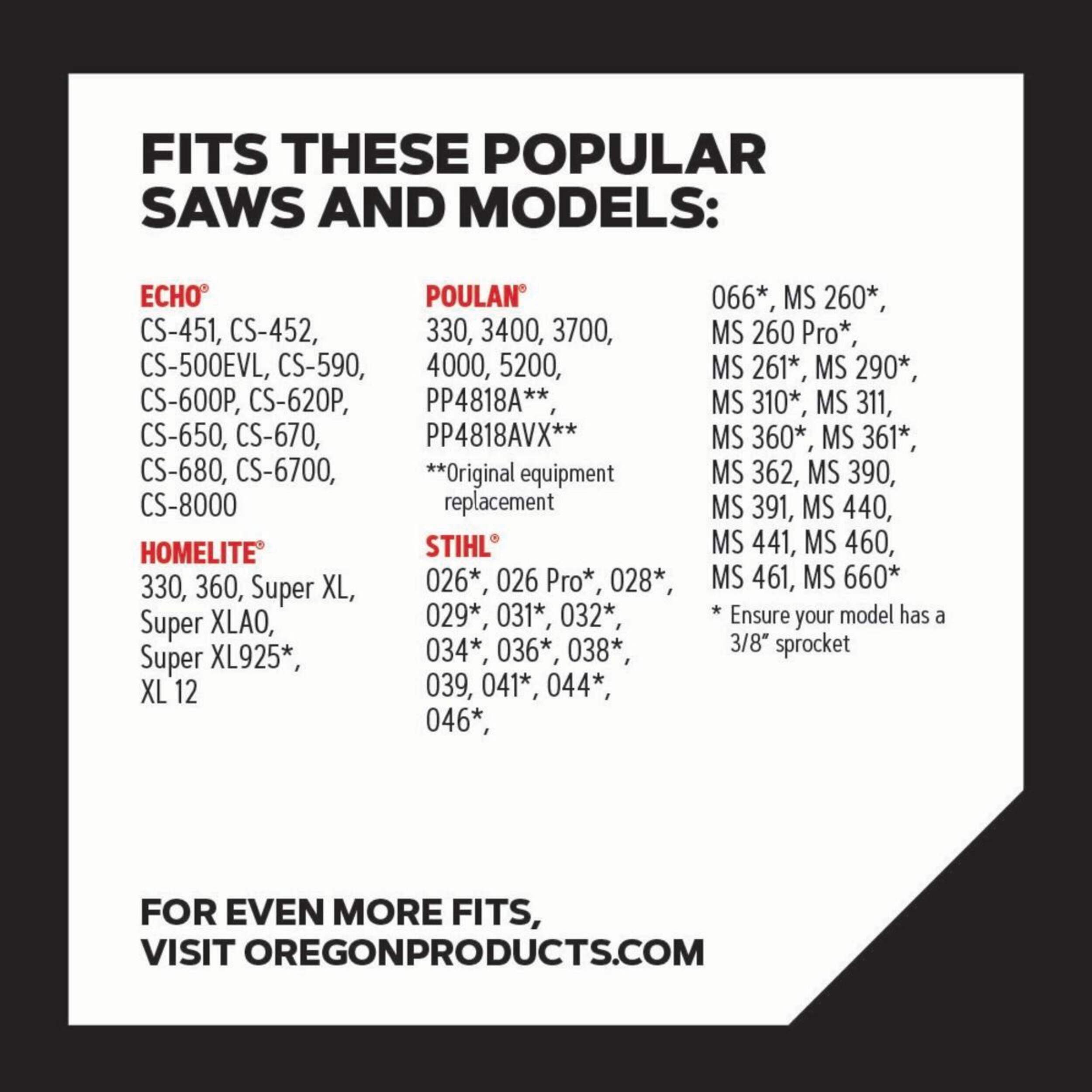 | Fitment Brand-Models | Craftsman|59930, Craftsman|59924, Craftsman|59718, Craftsman|358.35885, Craftsman|358.35889, Craftsman|358.35609, Craftsman|358.35690, Craftsman|358.35887, Craftsman|358.35608, Craftsman|59618, Craftsman|41418, Craftsman|358.35487, Craftsman|358.35483, Craftsman|358.35212, John Deere|50AV, McCulloch|Titan 57, McCulloch|Titan 50, McCulloch|Timber Bear, McCulloch|Super Pro 81, McCulloch|Super Pro 80, McCulloch|Super Pro 70, McCulloch|Super Pro 60, McCulloch|Silver Eagle 3720, McCulloch|Silver Eagle 3420, McCulloch|Pro Mac 850, McCulloch|Pro Mac 805, McCulloch|Pro Mac 800, McCulloch|Pro Mac 700, McCulloch|Pro Mac 650, John Deere|50V, McCulloch|Pro Mac 655, McCulloch|Pro Mac 60, McCulloch|Pro Mac 610, McCulloch|Pro Mac 605, McCulloch|Pro Mac 5700, McCulloch|Pro Mac 55, McCulloch|Pro Mac 570, McCulloch|Pro Mac 555, McCulloch|Pro 10-10A, McCulloch|MAC 7-10, McCulloch|Mac 6-10, McCulloch|MAC 5-10, McCulloch|MAC 4-10, McCulloch|Mac 3-10, McCulloch|MAC 2-10, John Deere|51SV, McCulloch|MAC 1-10, McCulloch|MAC 10-10, McCulloch|Eager Beaver 3.7, McCulloch|Double Eagle 80, McCulloch|Eager Beaver 3.4, McCulloch|Double Eagle 50, McCulloch|CP70, McCulloch|CP55, John Deere|60V, McCulloch|CP 70L, McCulloch|10-10A, John Deere|80EV, John Deere|55SV, John Deere|55V, John Deere|65, John Deere|70V, John Deere|66SV, Poulan|203, Remington|WOODSMAN, Remington|SL-9 Automatic, Remington|SL-16, Remington|SL-4 Automatic, Remington|SL-9, Remington|SL-14, Poulan|245, Remington|SL-11A, Remington|SL-10, Remington|PL-55, Remington|PL-5, Remington|PL-4, Remington|LOGGER, Poulan|7700, Poulan|306, Poulan|PP4818AVX, Poulan|PP4818AV, Poulan|PP4818A, Poulan|8500, Poulan|6900, Poulan|6700, Poulan|5500, Poulan|4900, Poulan|5400, Poulan|5200, Poulan|3400, Poulan|450, Poulan|4400, Poulan|395, Poulan|400, Poulan|4200, Poulan|4000, Poulan|3900, Poulan|3800, Poulan|375, Poulan|3700, Poulan|360, Poulan|361 |