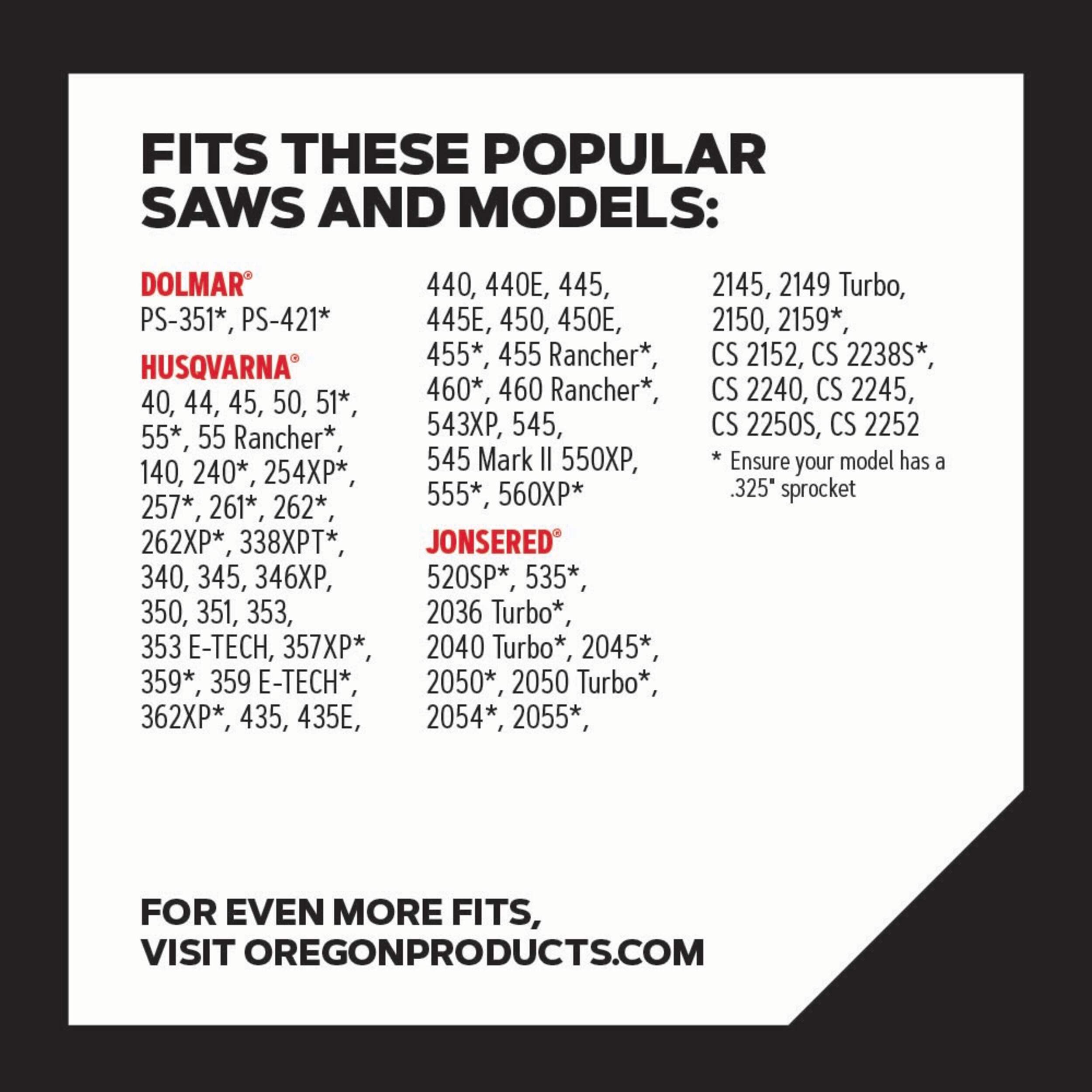 For all chainsaws brands that run 0.325" narrow kerf pitch, 0.050" (1.3 mm) gauge, and 72 drive links