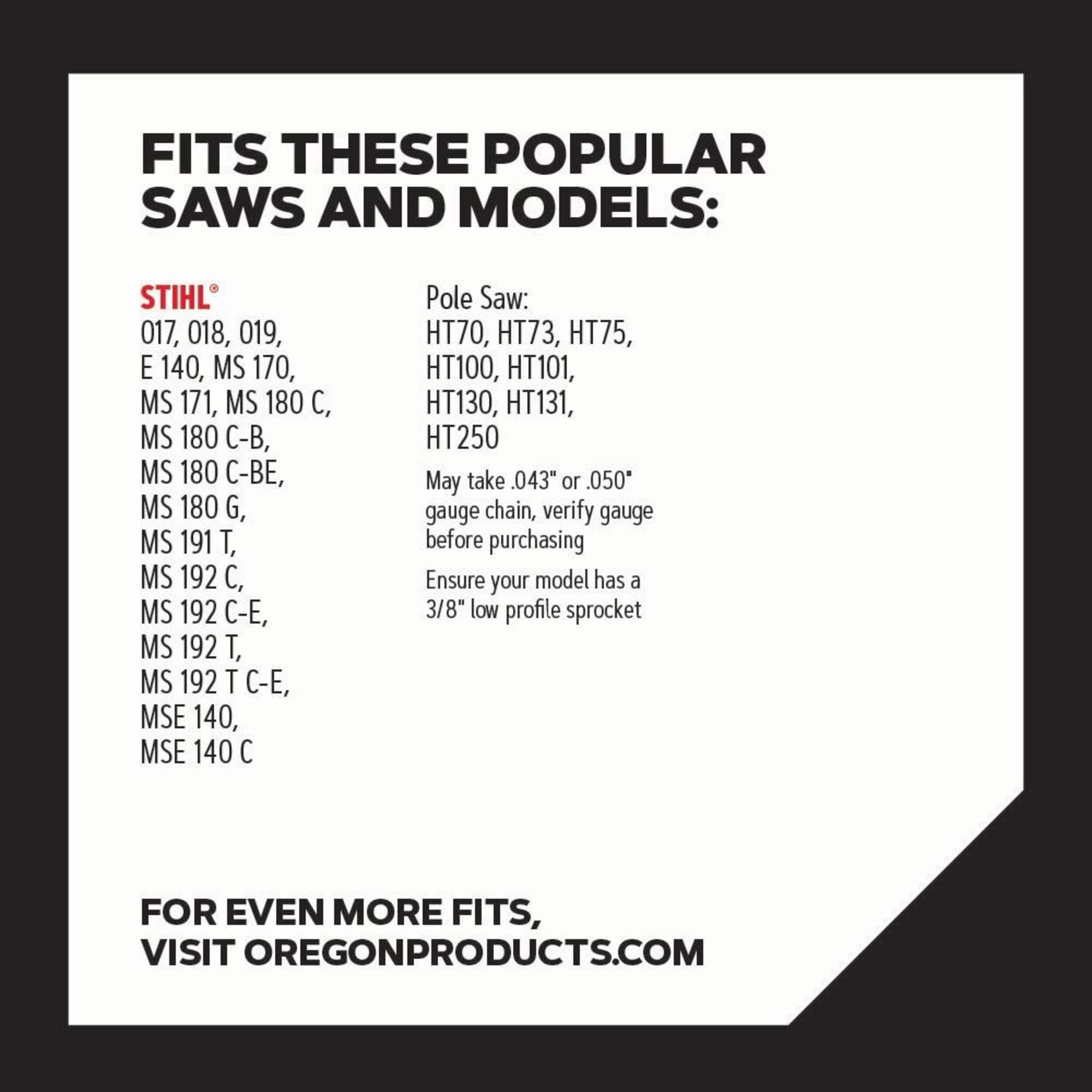 For chainsaw models that run 3/8" low-profile pitch, .043" (1.1 mm) gauge, 55 drive links