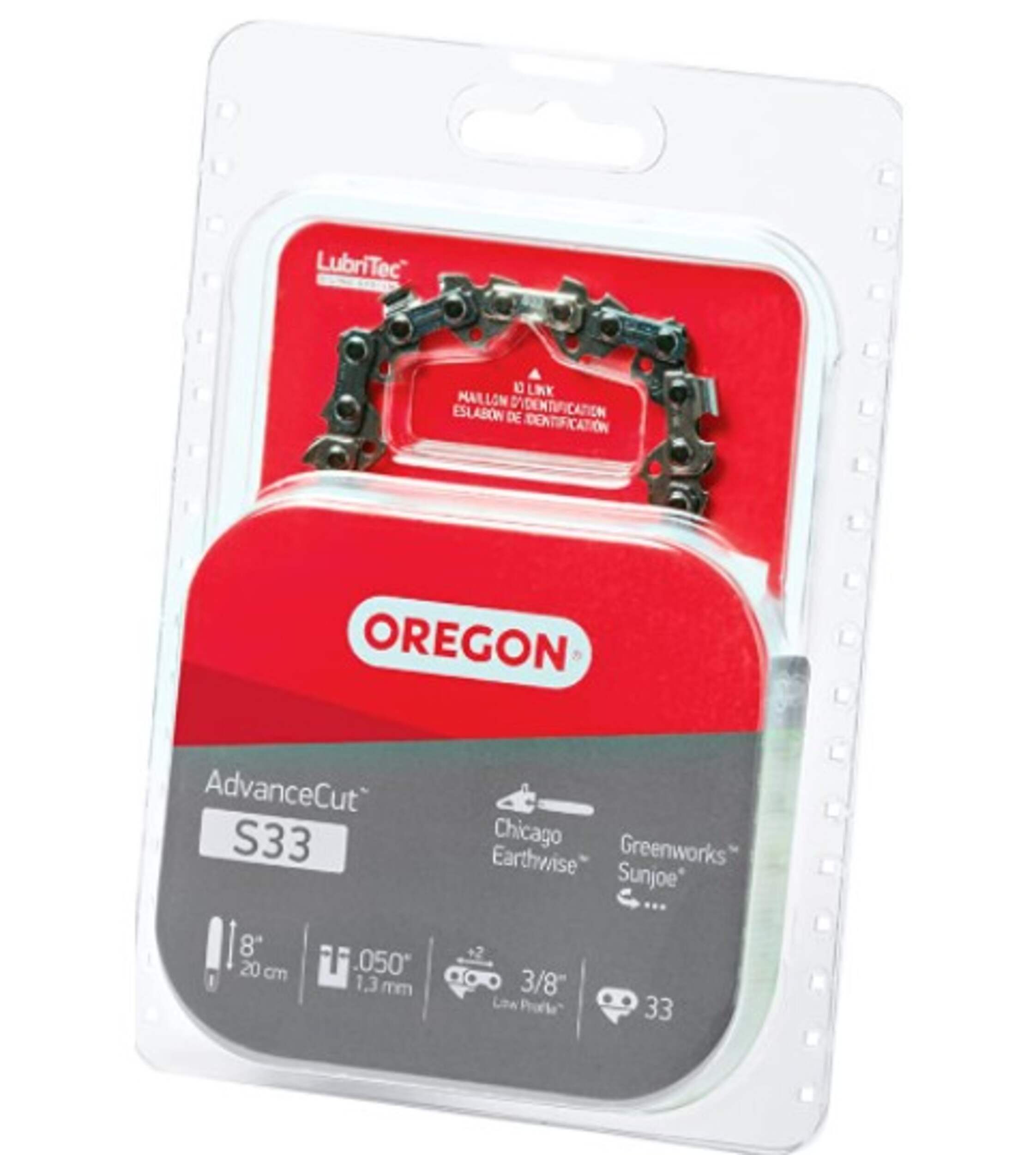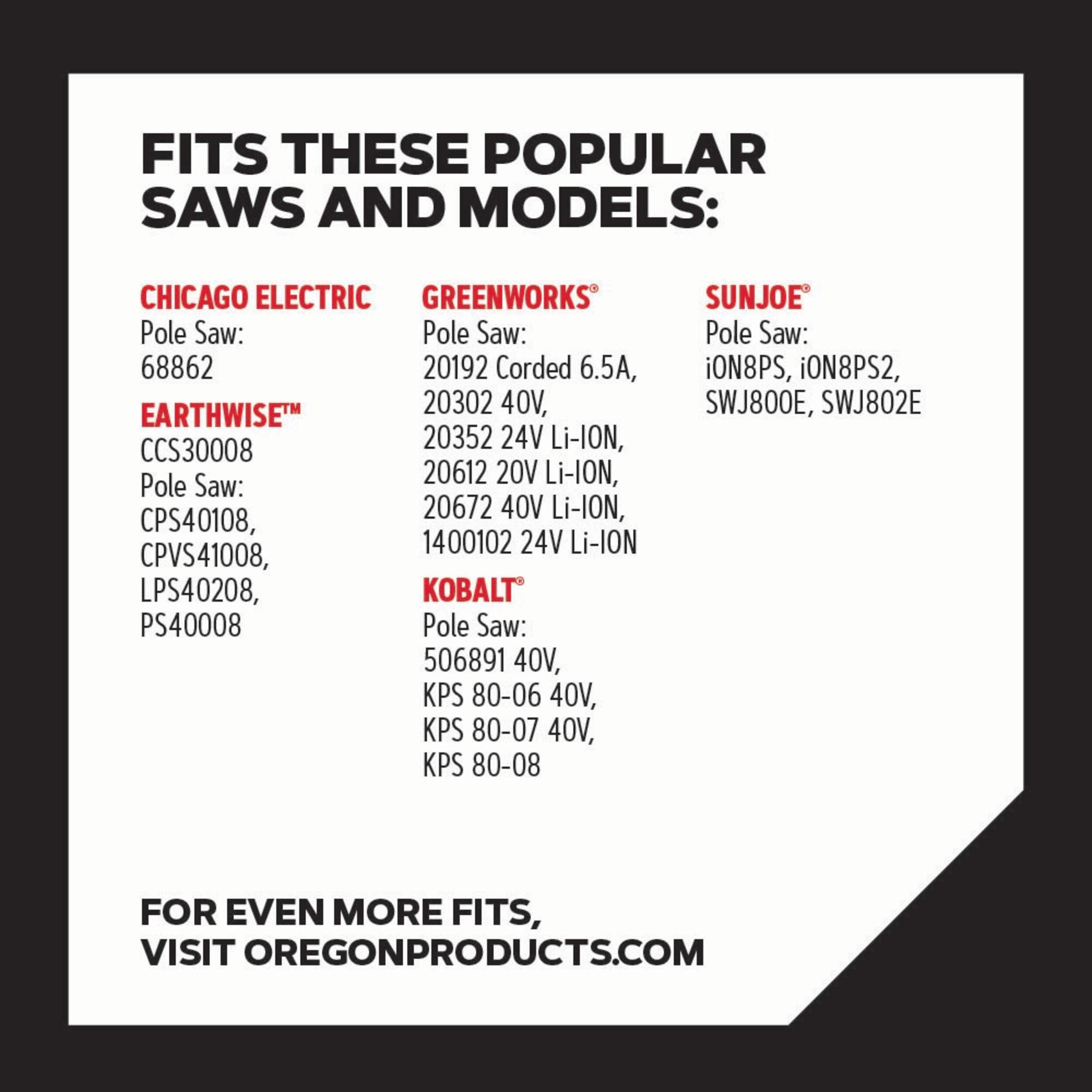 The Oregon S33 is designed to fit all Pole Saw chainsaw brands, with models that require a 3/8 Inch pitch, .050 Inch (1.3 mm) gauge, with 39 drive links. Fits chainsaw models from several brands including Kobalt, Chicago, Earthwise, Greenworks, Sun Joe and more