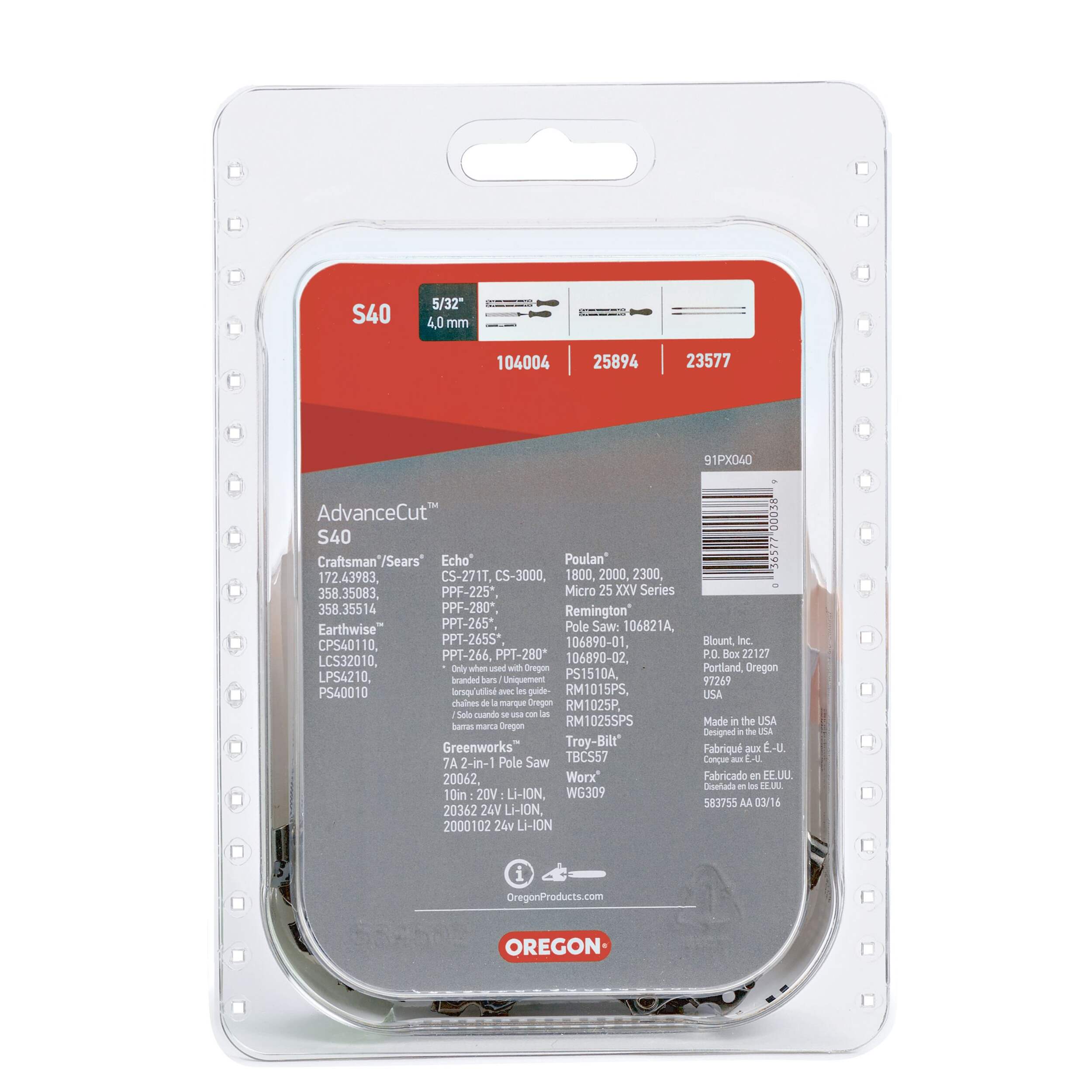 This Oregon S40 AdvanceCut™ Replacement Chainsaw Chain helps ensure you can keep cutting. Designed to fit a range of chainsaw models, this replacement chainsaw chain offers durable, low-kickback performance to reduce fatigue during big jobs at work or around the yard. The built-in, automatic oiling system delivers oil to key parts of the chain for less downtime and maintenance. Highly functional and durable, this replacement chainsaw chain is a great option for professionals on the job site or for those with large yards or projects.
