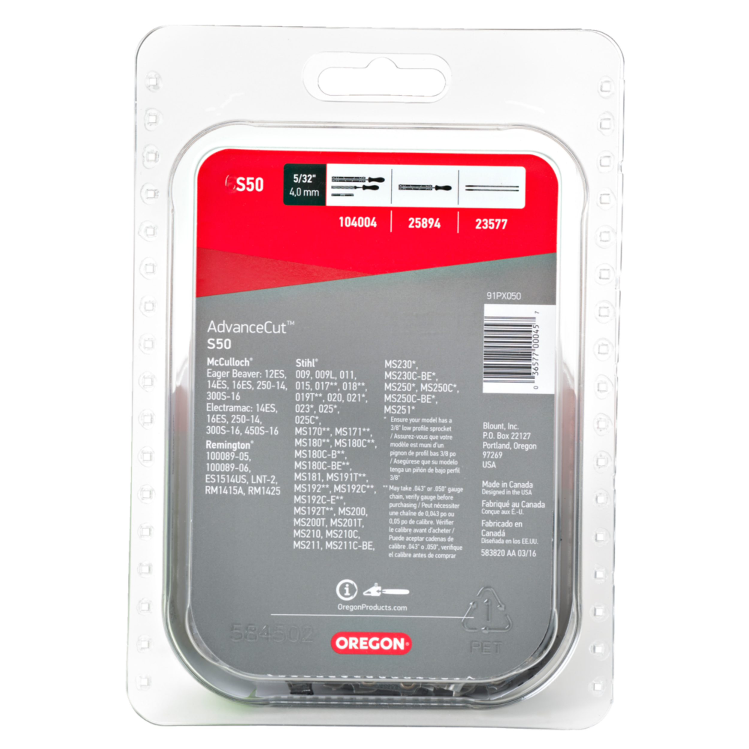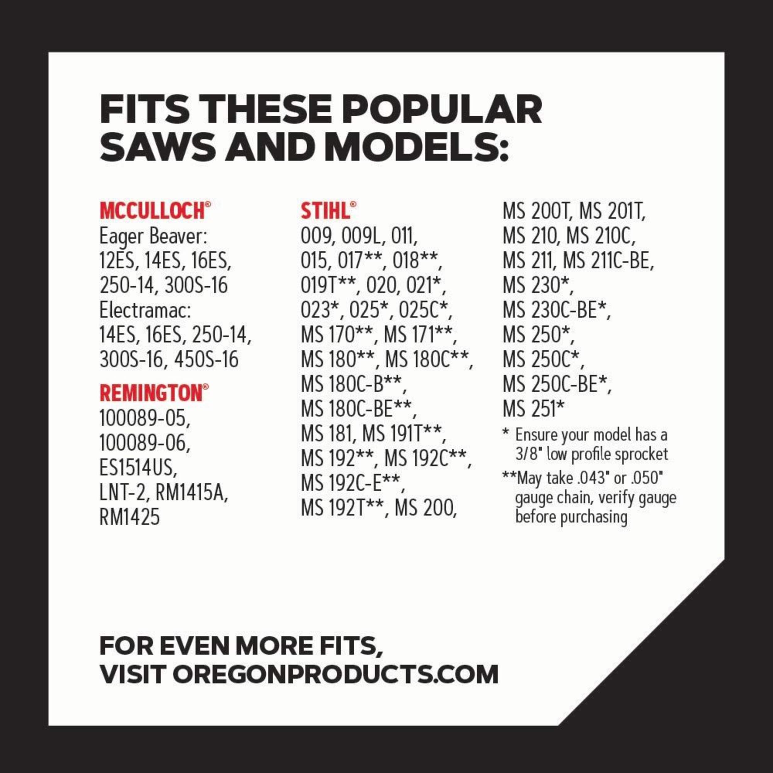 The Oregon S50 is designed to fit all chainsaw brands, with models that require a 3/8 Inch pitch, .050 Inch (1.3 mm) gauge, with 50 drive links. Fits chainsaw models from several brands including Stihl, Remington, McCulloch, Craftsmand Homelite and more