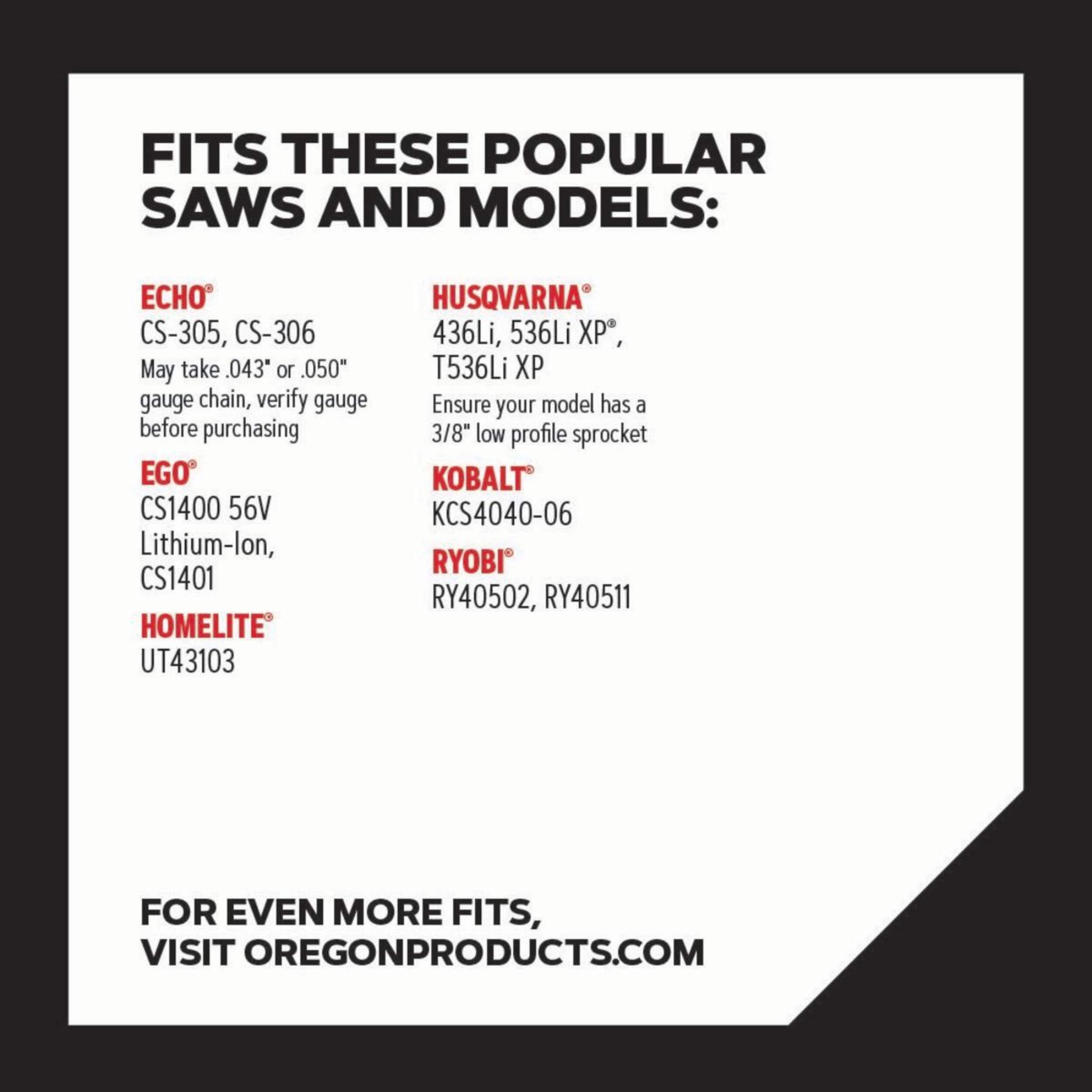The Oregon R52 AdvanceCut™ Saw Chain is ideal for landscapers and homeowners using small, low powered saws, because it offers higher chain efficiency. The .043" gauge narrow kerf cutting systems increase efficiency since they need less power from the saw than standard cutting systems. This chain fits Echo, Makita, Husqvarna, Ryobi Poulan and more