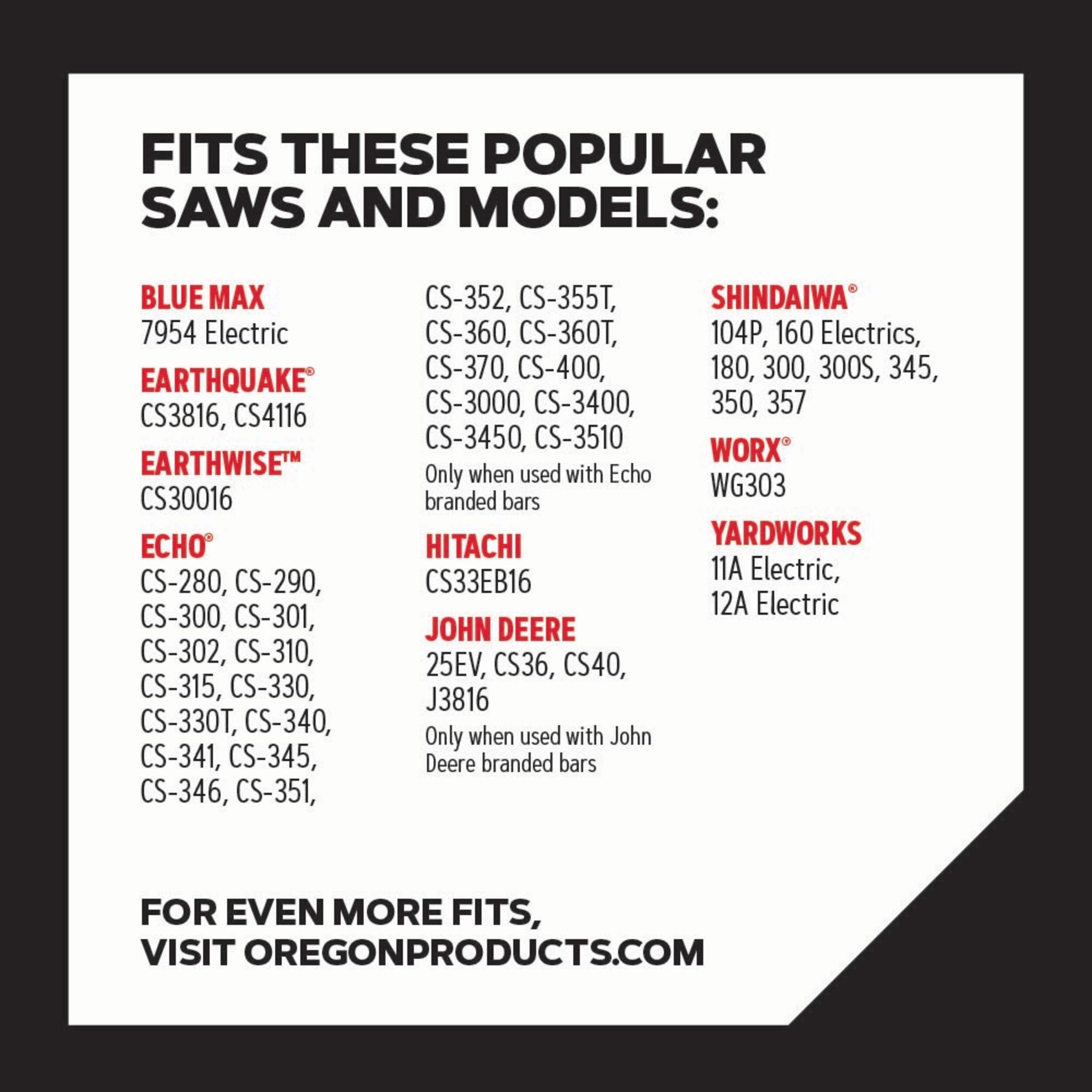 • Fits chainsaw models from several brands including Cub Cadet, Echo, John Deere, Shindaiwa and more