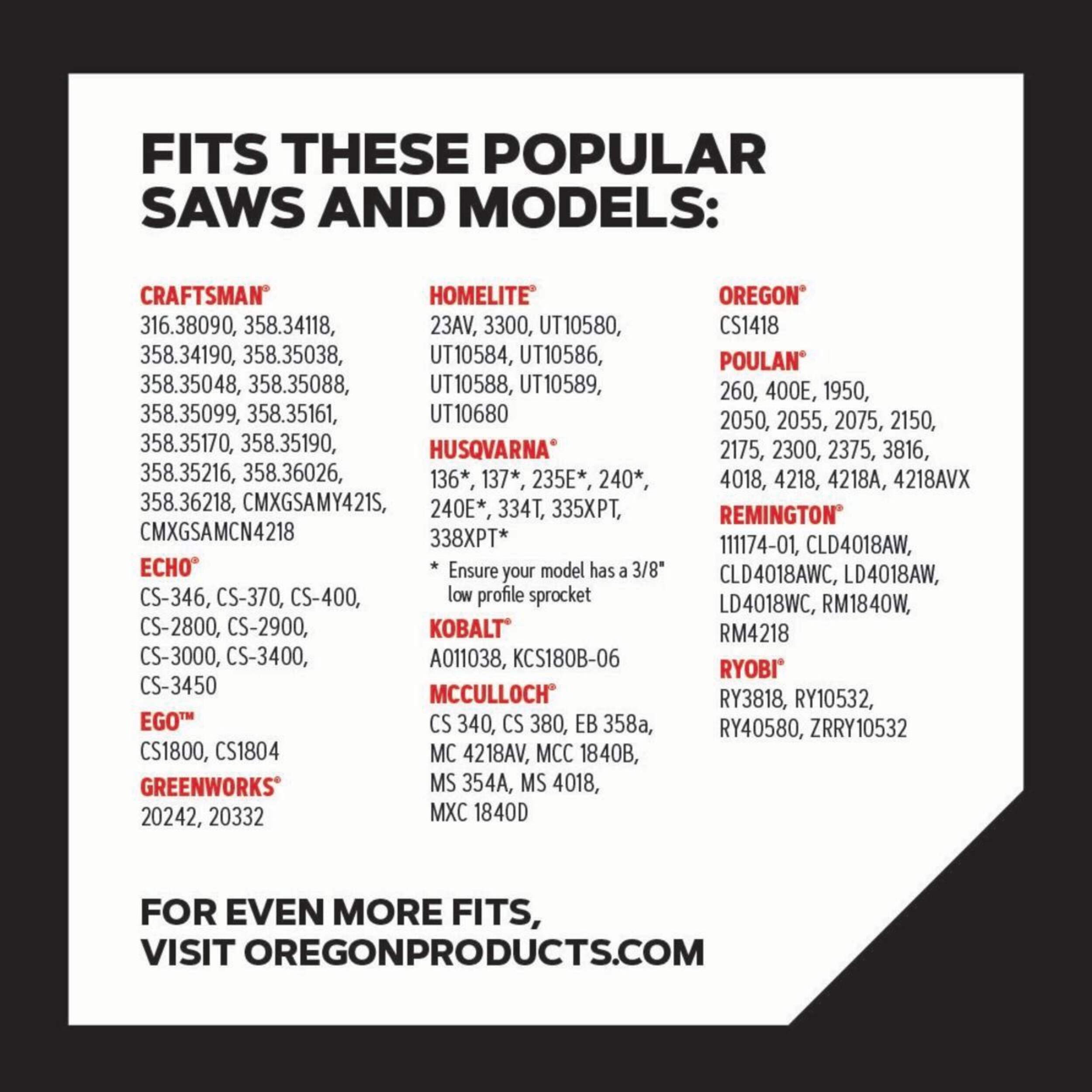 | Fitment Brand-Models | Black & Decker|CS1518, Craftsman|316.38018, Craftsman|S185, Craftsman|CMXGSAMY421S, Craftsman|CMXGSAMCX4218, Craftsman|CMXGSAMCN4218, Craftsman|944.41801, Craftsman|944.41543, Craftsman|944.41443, Craftsman|41AY421S793, Craftsman|41952, Craftsman|41748, Craftsman|41443, Craftsman|41142, Craftsman|358.740180, Craftsman|358.38170, Craftsman|358.38160, Craftsman|358.36218, Craftsman|358.36148, Craftsman|358.36088, Craftsman|358.36087, Craftsman|316.38090, Craftsman|358.36085, Craftsman|358.36083, Craftsman|358.36082, Craftsman|358.36080, Craftsman|358.36069, Craftsman|358.36068, Craftsman|358.34094, Craftsman|358.36038, Craftsman|358.36036, Craftsman|358.36028, Craftsman|358.36026, Craftsman|358.36018, Craftsman|358.36017, Craftsman|358.36015, Craftsman|358.34101, Craftsman|358.36013, Craftsman|358.36012, Craftsman|358.36010, Craftsman|358.35802, Craftsman|358.35736, Craftsman|358.35723, Craftsman|358.35718, Craftsman|358.35624, Craftsman|358.35623, Craftsman|358.35618, Craftsman|358.35516, Craftsman|358.35514, Craftsman|358.34102, Craftsman|358.35512, Craftsman|358.35508, Craftsman|358.35506, Craftsman|358.35505, Craftsman|358.35504, Craftsman|358.35367, Craftsman|358.35366, Craftsman|358.34104, Craftsman|358.35363, Craftsman|358.35283, Craftsman|358.35270, Craftsman|358.35281, Craftsman|358.35280, Craftsman|358.35273, Craftsman|358.35269, Craftsman|358.35268, Craftsman|358.35267, Craftsman|358.35266, Craftsman|358.35263, Craftsman|358.35238, Craftsman|358.35236, Craftsman|358.35231, Craftsman|358.35235, Craftsman|358.34106, Craftsman|358.35218, Craftsman|358.35216, Craftsman|358.35215, Craftsman|358.35207, Craftsman|358.35211, Craftsman|358.35206, Craftsman|358.35205, Craftsman|358.35203, Craftsman|358.35202, Craftsman|358.35198, Craftsman|358.35191, Craftsman|358.35190, Craftsman|358.35180, Craftsman|358.35182, Craftsman|358.35181, Craftsman|358.34108, Craftsman|358.35171, Craftsman|358.35170, Craftsman|358.35160, Craftsman|358.35161, Craftsman|358.35158, Craftsman|358.35148, Craftsman|358.35156, Craftsman|358.35146, Craftsman|358.35145, Craftsman|358.35144, Craftsman|358.35138, Craftsman|358.35116, Craftsman|358.35136, Craftsman|358.35134, Craftsman|358.35118, Craftsman|358.35117, Craftsman|358.34109, Craftsman|358.35115, Craftsman|358.35114, Craftsman|358.35099, Craftsman|358.35106, Craftsman|358.35104, Craftsman|358.34110, Craftsman|358.35093, Craftsman|358.35088, Craftsman|358.35087, Craftsman|358.35083, Craftsman|358.35082, Craftsman|358.35081, Craftsman|358.35080, Craftsman|358.35067, Craftsman|358.35058, Craftsman|358.35066, Craftsman|358.35060, Craftsman|358.35056, Craftsman|358.35048, Craftsman|358.35028, Craftsman|358.34111, Craftsman|358.35046, Craftsman|358.35044, Craftsman|358.35038, Craftsman|358.35037, Craftsman|358.35036, Craftsman|358.35027, Craftsman|358.35026, Craftsman|358.35024, Craftsman|358.34114, Craftsman|358.35018, Craftsman|358.35008, Craftsman|358.35006, Craftsman|358.3476, Craftsman|358.34195, Craftsman|358.3425, Craftsman|358.34190, Craftsman|358.34181, Craftsman|358.34180, Craftsman|358.3412, Craftsman|358.34124, Craftsman|358.34118, Craftsman|358.34116, Craftsman|358.34117, Craftsman|358.34115, GREENWORKS|2000002 80V, GREENWORKS|GS180 2001902, GREENWORKS|GCS80421, GREENWORKS|GCS80420, GREENWORKS|CSC404, GREENWORKS|CS60L03, GREENWORKS|20332, GREENWORKS|2019902, Husqvarna|120 MARK II, Husqvarna|T540XP, Husqvarna|41, Husqvarna|38, Husqvarna|36, Husqvarna|339XP, Husqvarna|338XPT, Husqvarna|336, Husqvarna|33, Husqvarna|240E, Husqvarna|240, Husqvarna|235E, Husqvarna|142, Husqvarna|136, Husqvarna|141, Husqvarna|137, John Deere|25EV, Mastercraft|54-5722 post Apr 99, Makita|UC4551A, Kobalt|KCS 4080-06, Makita|UC4550A, Makita|GCU06Z, Makita|EA3501S, Makita|EA3500SRDB, Makita|EA3500S, Kobalt|KCS 180B-06, John Deere|J3816, John Deere|28V, John Deere|CS40V, John Deere|CS40LE, John Deere|CS40, John Deere|CS36LE, John Deere|CS36, John Deere|40V, John Deere|28, John Deere|30V, John Deere|30, McCulloch|CS 340, Oregon|CS1418, McCulloch|MXC1840DK, McCulloch|MS 4016, McCulloch|MXC1840D, McCulloch|MS 4018, McCulloch|MS 354a, McCulloch|MCC1840B, McCulloch|MCC1635A, McCulloch|MCC1435A, McCulloch|MC4218AV, McCulloch|MC3516, McCulloch|CS 380, McCulloch|EBC1840DK, McCulloch|EB 358, McCulloch|EB 356, Poulan|1220, Poulan|Woodshark, Poulan|WILD THING, Poulan|Super Micro 25 XXV Series, Poulan|Super Micro 25 XX Series, Poulan|S25, Poulan|S23, Poulan|PR4218, Poulan|PPR4218A, Poulan|PPB4218, Poulan|PP4218AVX, Poulan|PATRIOT 1900, Poulan|P3816, Poulan|P3314, Poulan|Micro 25 XXV Series, Poulan|Micro 25 XX Series, Poulan|ES400, Poulan|ELECTRIC PRO 400E, Poulan|E16E, Poulan|E14E, Poulan|967607201, Poulan|1420, Poulan|4218AVX, Poulan|4218AV, Poulan|4218A, Poulan|3314 Woodshark, Poulan|4218, Poulan|4018, Poulan|400E, Poulan|3816, Poulan|3516AVX, Poulan|3516, Poulan|3416, Poulan|262, Poulan|1425, Poulan|2600, Poulan|260, Poulan|2550, Poulan|255, Poulan|250, Poulan|2500, Poulan|2450, Poulan|1625, Poulan|2400, Poulan|2250, Poulan|240, Poulan|2375, Poulan|236, Poulan|2350, Poulan|235, Poulan|2300, Poulan|225, Poulan|222, Poulan|221, Poulan|1630, Poulan|2200, Poulan|220, Poulan|2175, Poulan|2160, Poulan|2155, Poulan|180, Poulan|2150, Poulan|210, Poulan|2055, Poulan|2000, Poulan|2050, Poulan|205, Poulan|2025, Poulan|200, Poulan|1800, Poulan|1950, Poulan|1900, Poulan|190, Remington|107624-01, Yardworks|9A Electric, Yardworks|13A Electric, Yardworks|11A Electric, Yardworks|10A Electric, Troy-Bilt|TB4218, Troy-Bilt|TB4018, Troy-Bilt|TB3516CC Gas, Troy-Bilt|TB3518CC Gas, RYOBI|ZRRY10532, RYOBI|RY40580, RYOBI|RY43006, RYOBI|RY40508, RYOBI|RY3818, RYOBI|RY10532, Remington|RM4218, Remington|107624-02, Remington|RM1840W, Remington|RM1645, Remington|RM1640W, Remington|RM1640B, Remington|RM1635W, Remington|LD4018WC, Remington|RM1632A, Remington|LD4018AW, Remington|LD4016AW, Remington|CLD4018AW, Remington|107625-01, Remington|EL-8, Remington|CLD4018AWC, Remington|LD3516AWB, Remington|CL