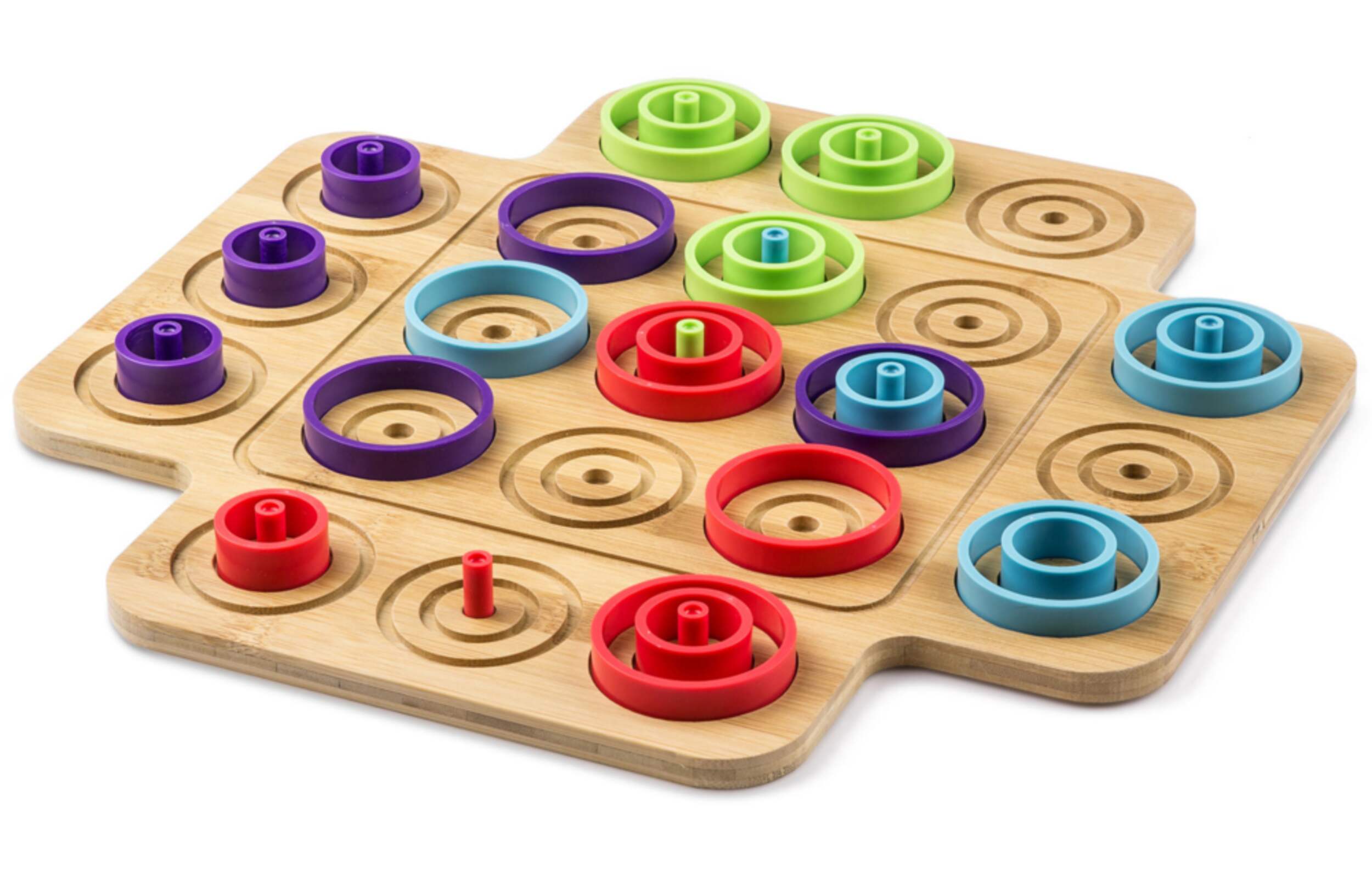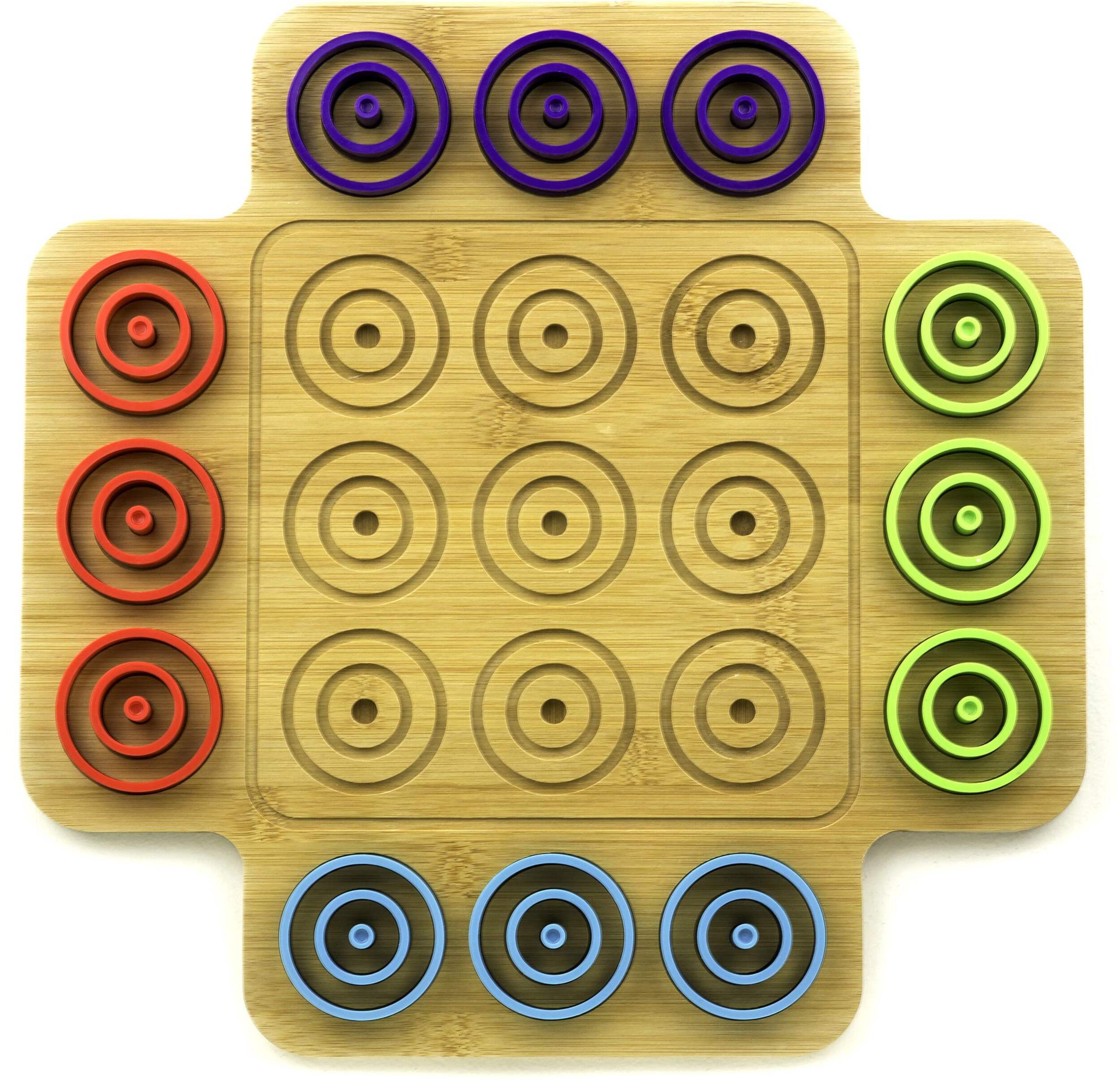 To win, line up three pieces of the same colour by similar size; in ascending or descending order; or within the same space