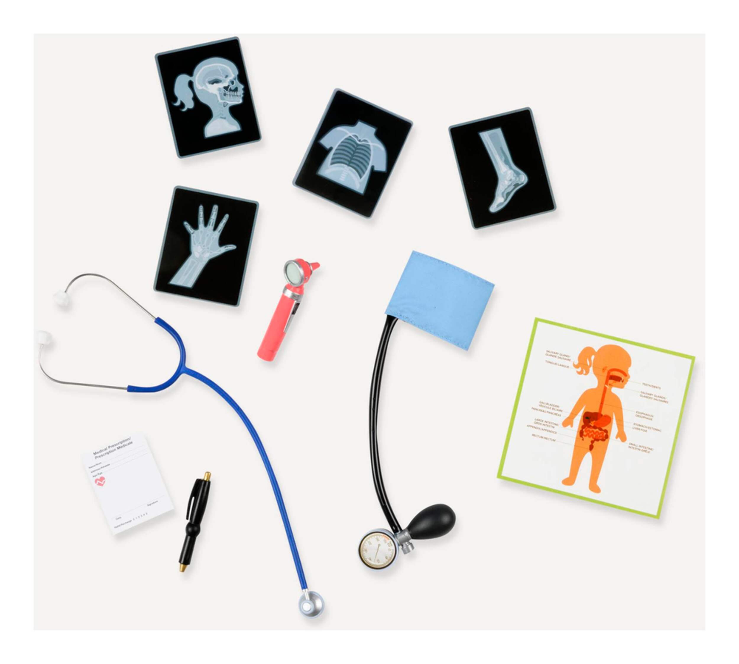 Includes doll, pair of undies, pair of pants, sweater, coat, pair of shoes, Stethoscope, Otoscope, Sphygmomanometer, pen, prescription pad, 4 x-rays and poster