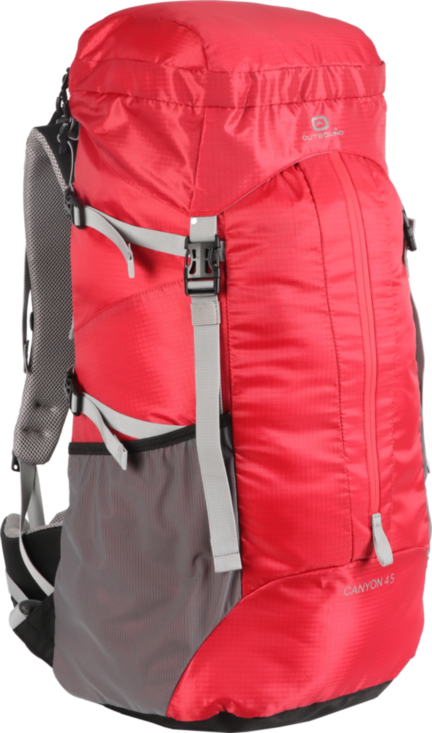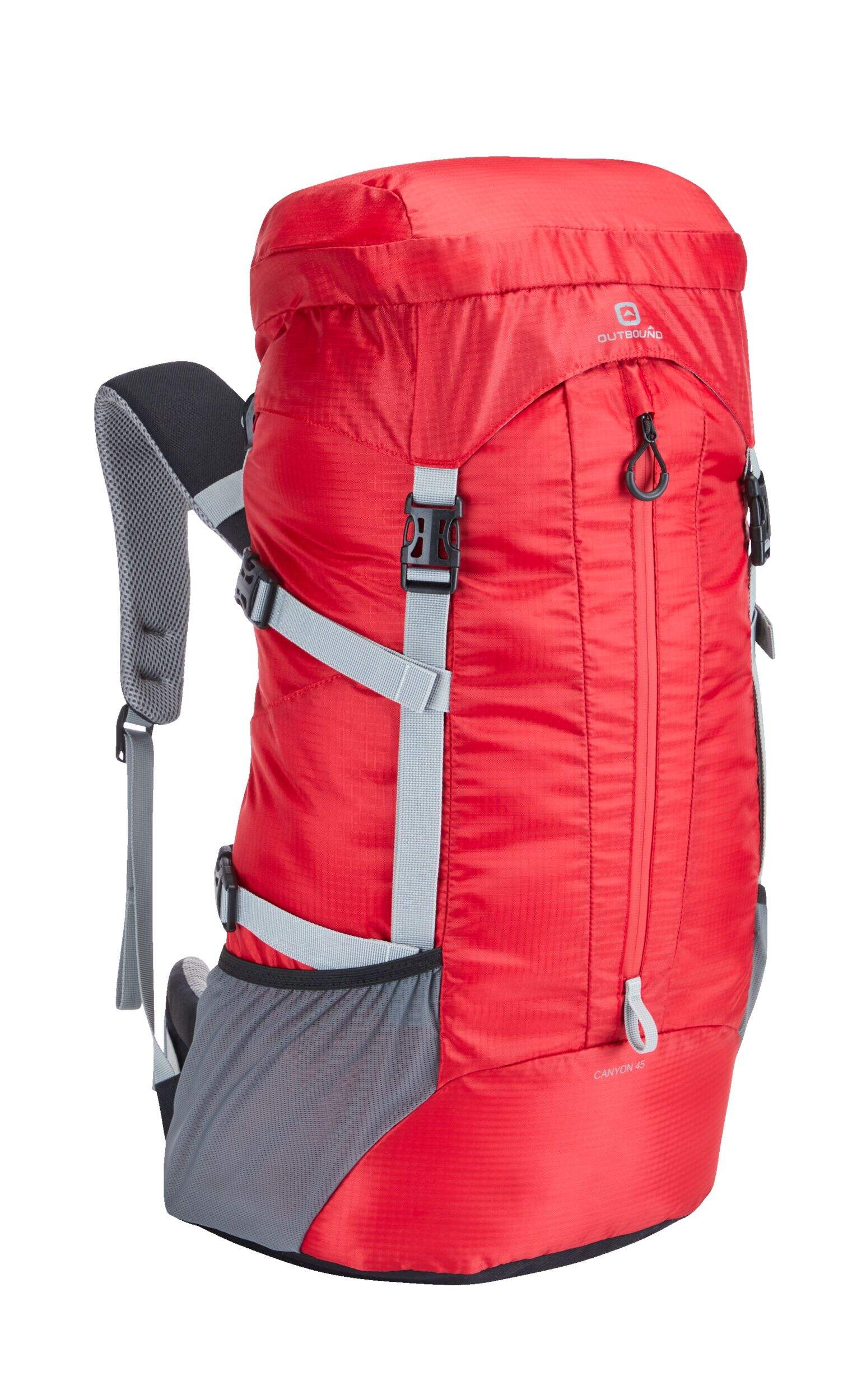 The Outbound Canyon Backpack is comfortable to carry even when loaded with a lot of gear. Boasting a spacious 45 L internal compartment, this durable travel backpack is engineered to handle rugged terrain and ambitious overnighters. Strong padded shoulder straps, internal aluminum stays, and a hip strap help this Outbound hiking backpack stay snug and comfortable. Two mesh side pockets ensure that hydration is never far away, while a handy rain cover helps keep your contents dry.