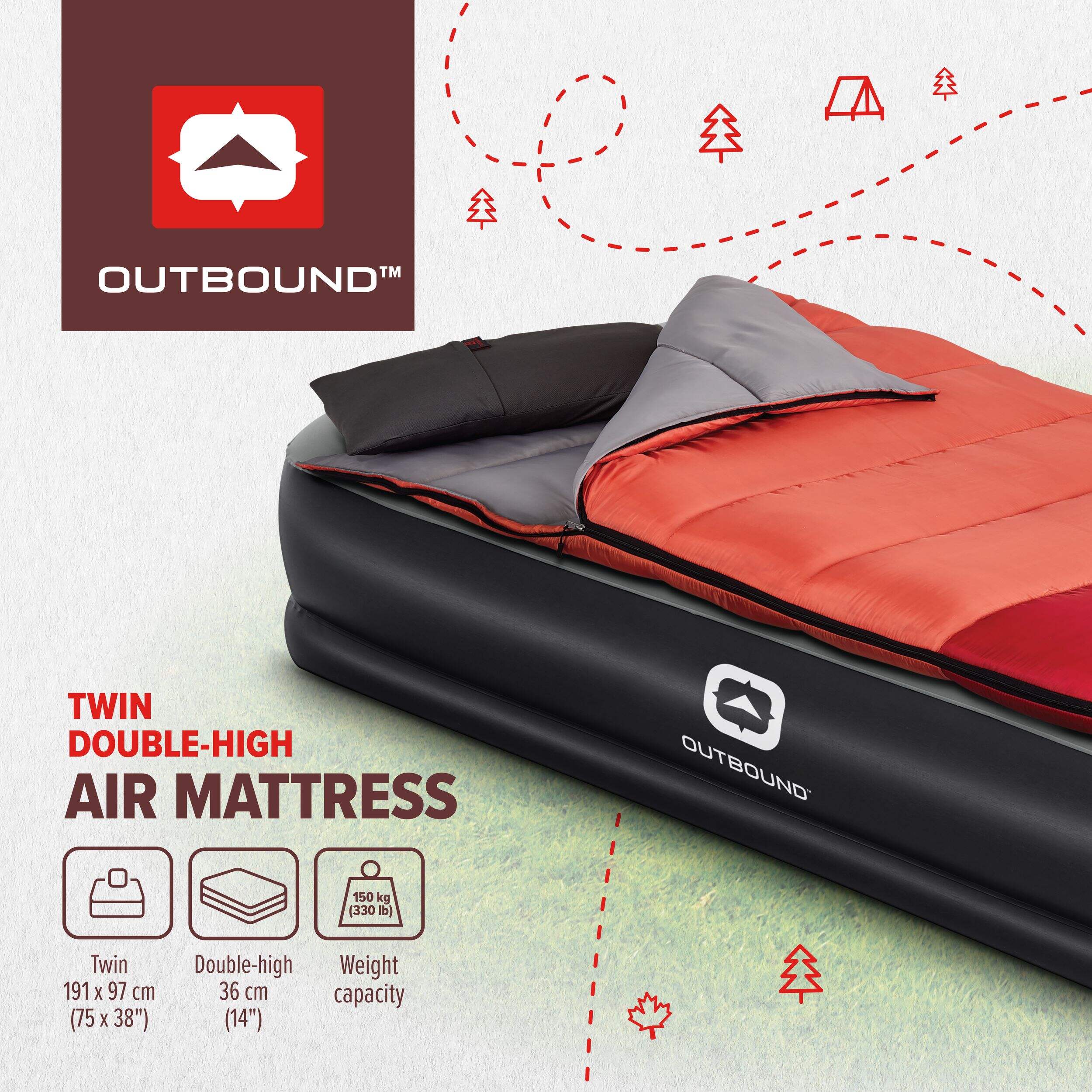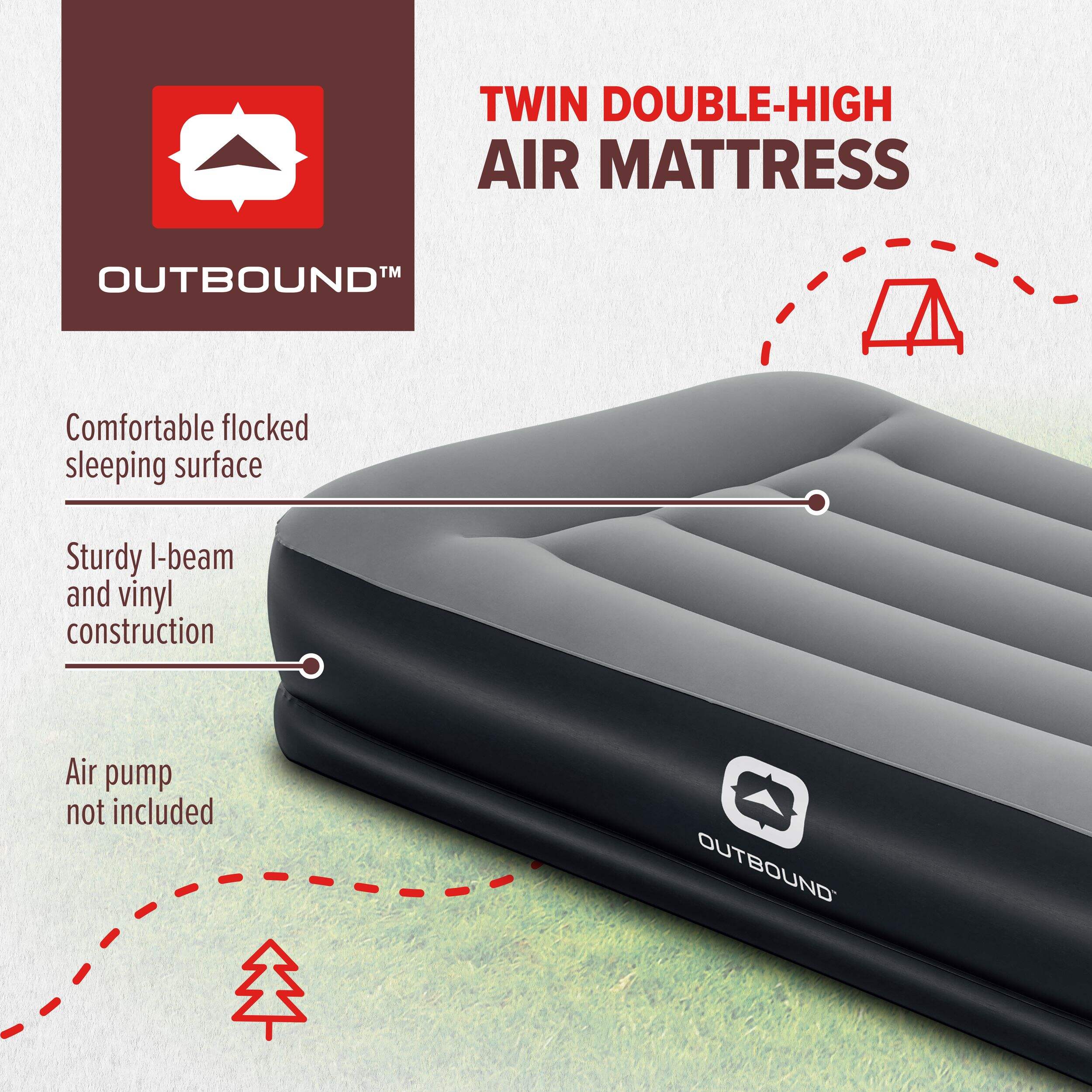 Experience comfort and convenience with the Outbound Double High Flocked Airbed, Twin, in Grey. Designed with a weight capacity of 150 kg (330 lb), this air mattress provides a supportive sleeping surface. The integrated pillow enhances your sleeping experience, making it ideal for camping trips or guest accommodations. To maintain its quality, simply wipe the air mattress with clean water and allow it to air dry in a cool, shady place. Enjoy restful nights wherever you are.
