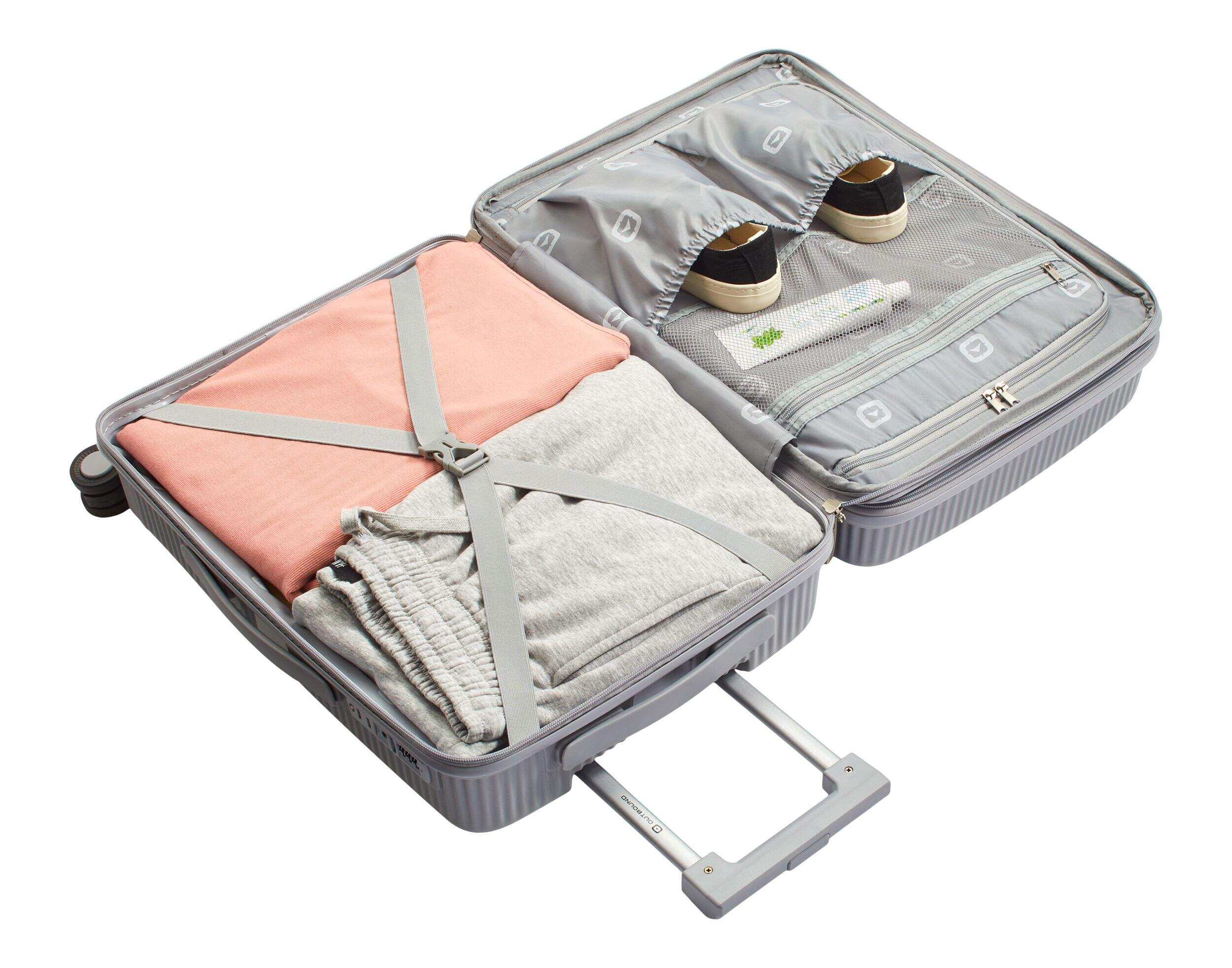 Zippered divider featuring a mesh organizer pocket and 2 shoe pockets
