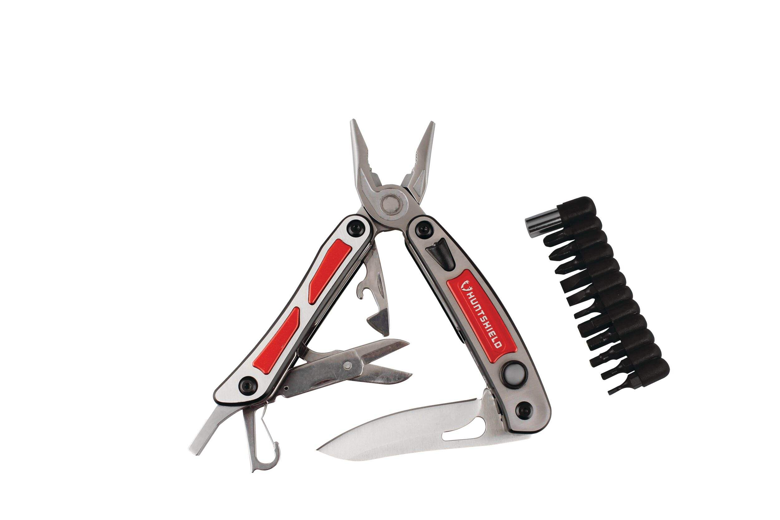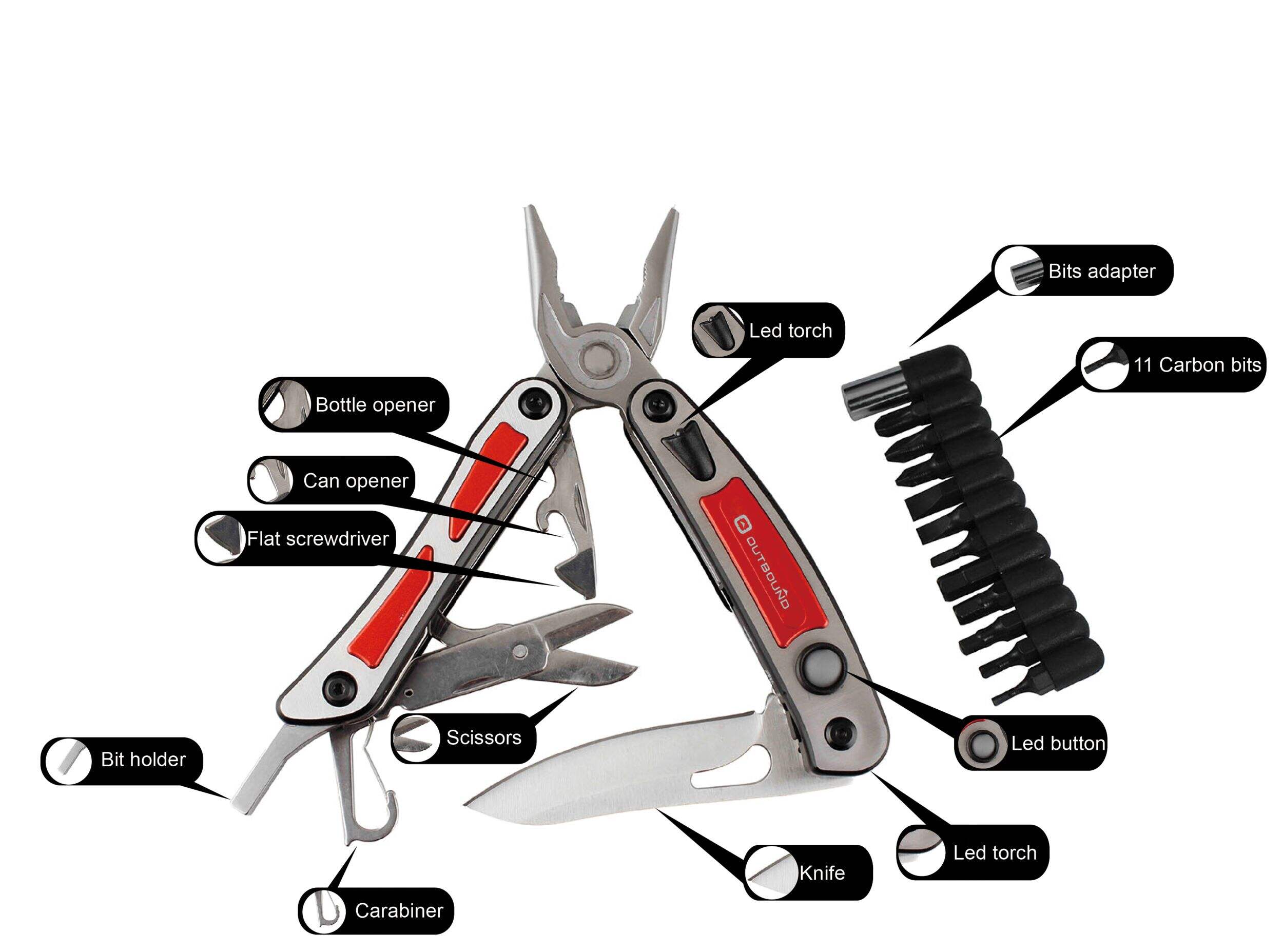 Includes needle nose pliers with regular pliers, wire cutters, wire stripper, sharp knife, bottle opener with can opener, carabineer, scissors, 2 LED lights (front & rear) and bits holder with 11 carbon bits