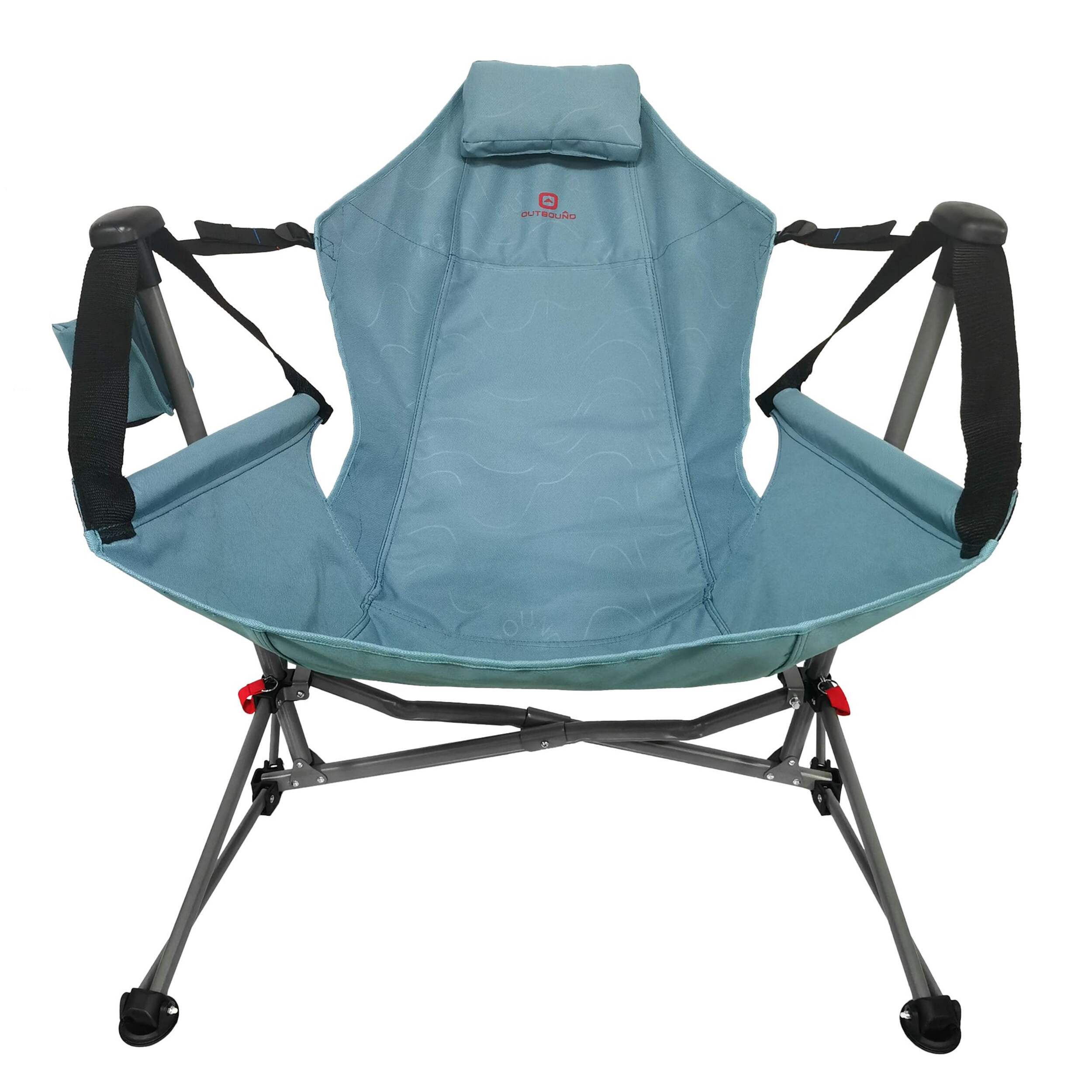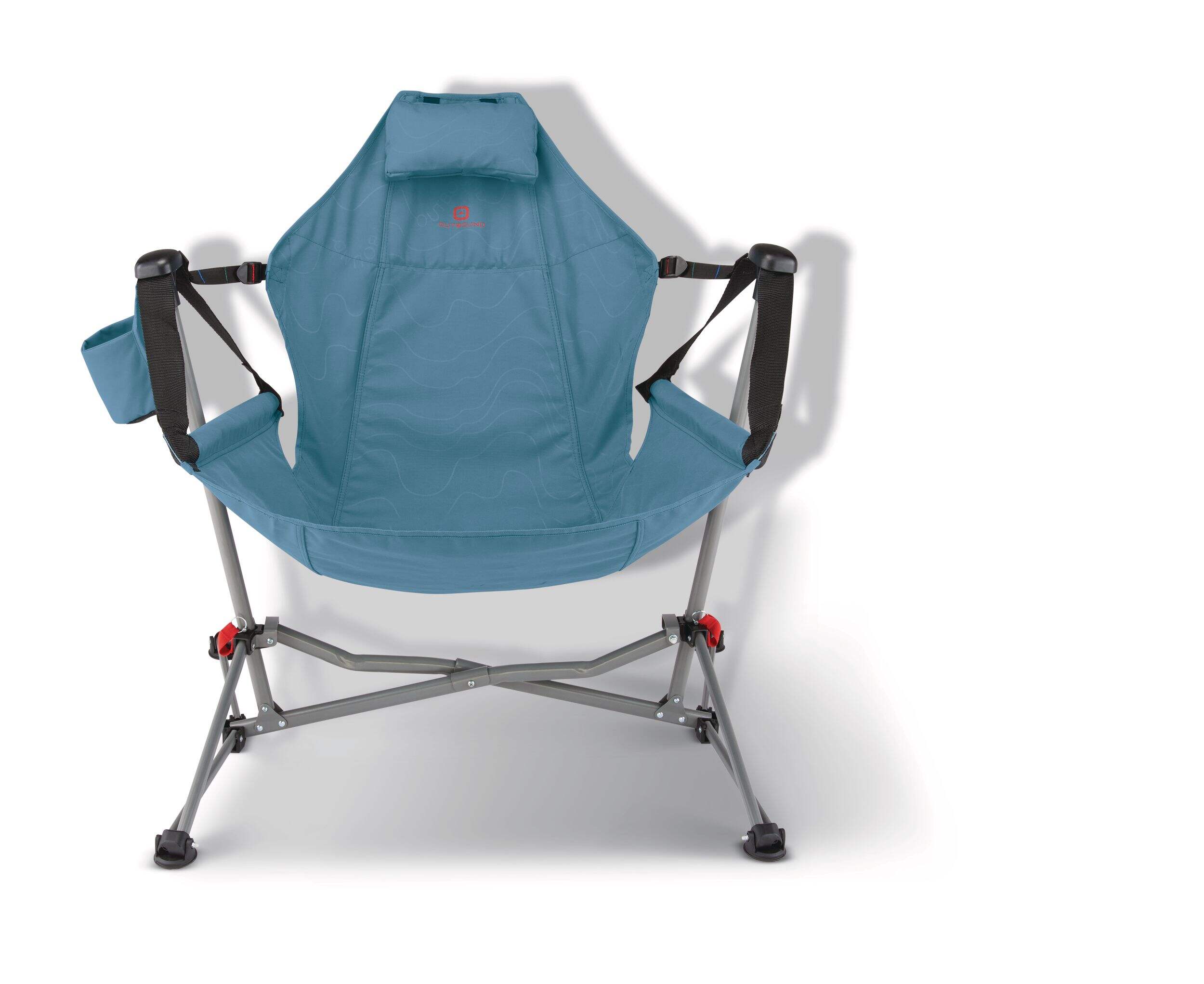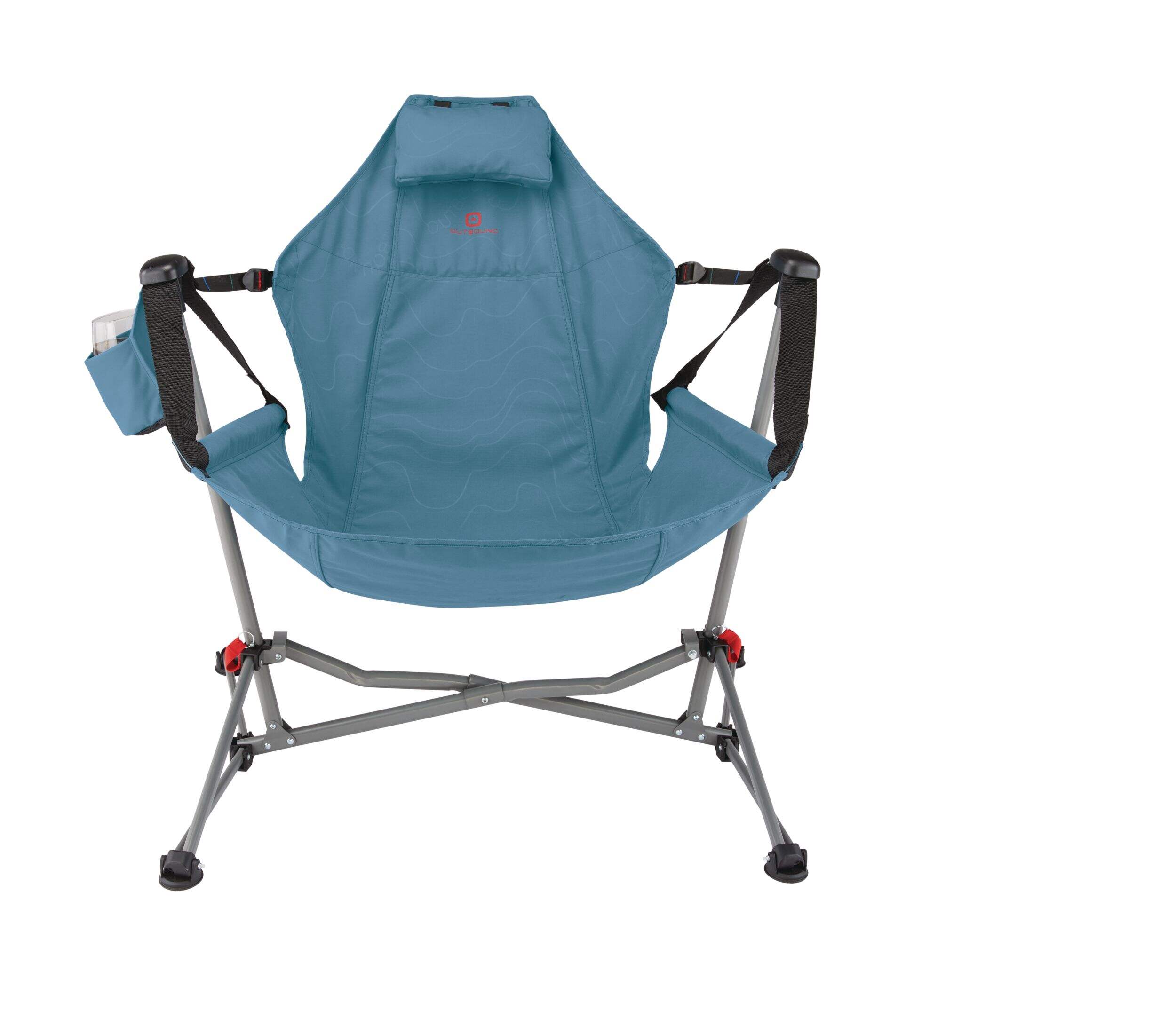 The Outbound Panorama Full Size Swing Chair with Headrest features a wide seat with an attached headrest for optimal comfort and neck support. Made from water-resistant polyester fabric, this folding camp chair is well-suited for outdoor use. It offers a convenient choice for camping trips, sporting events, and other outdoor activities.