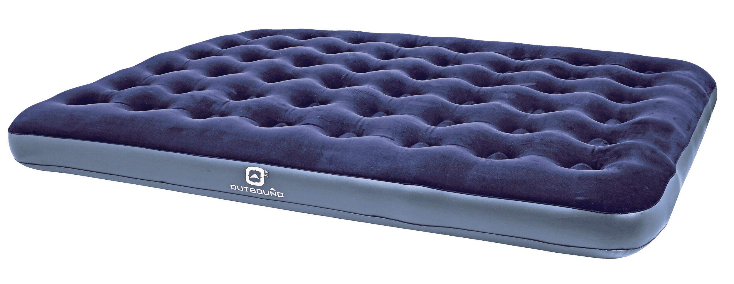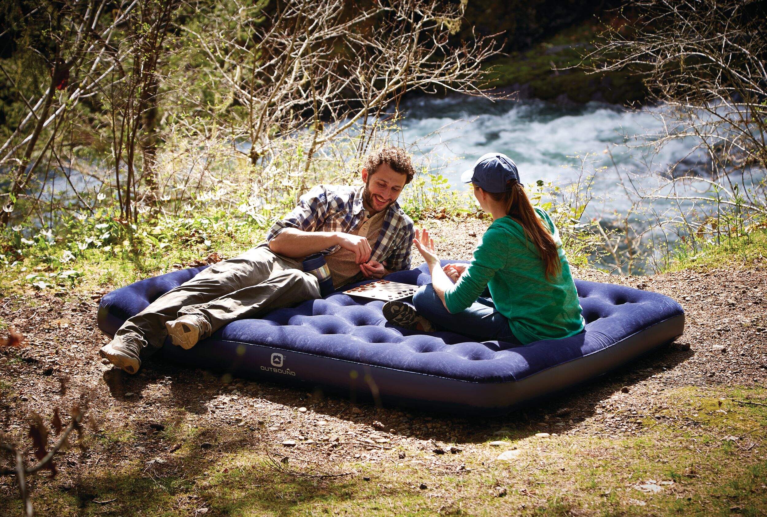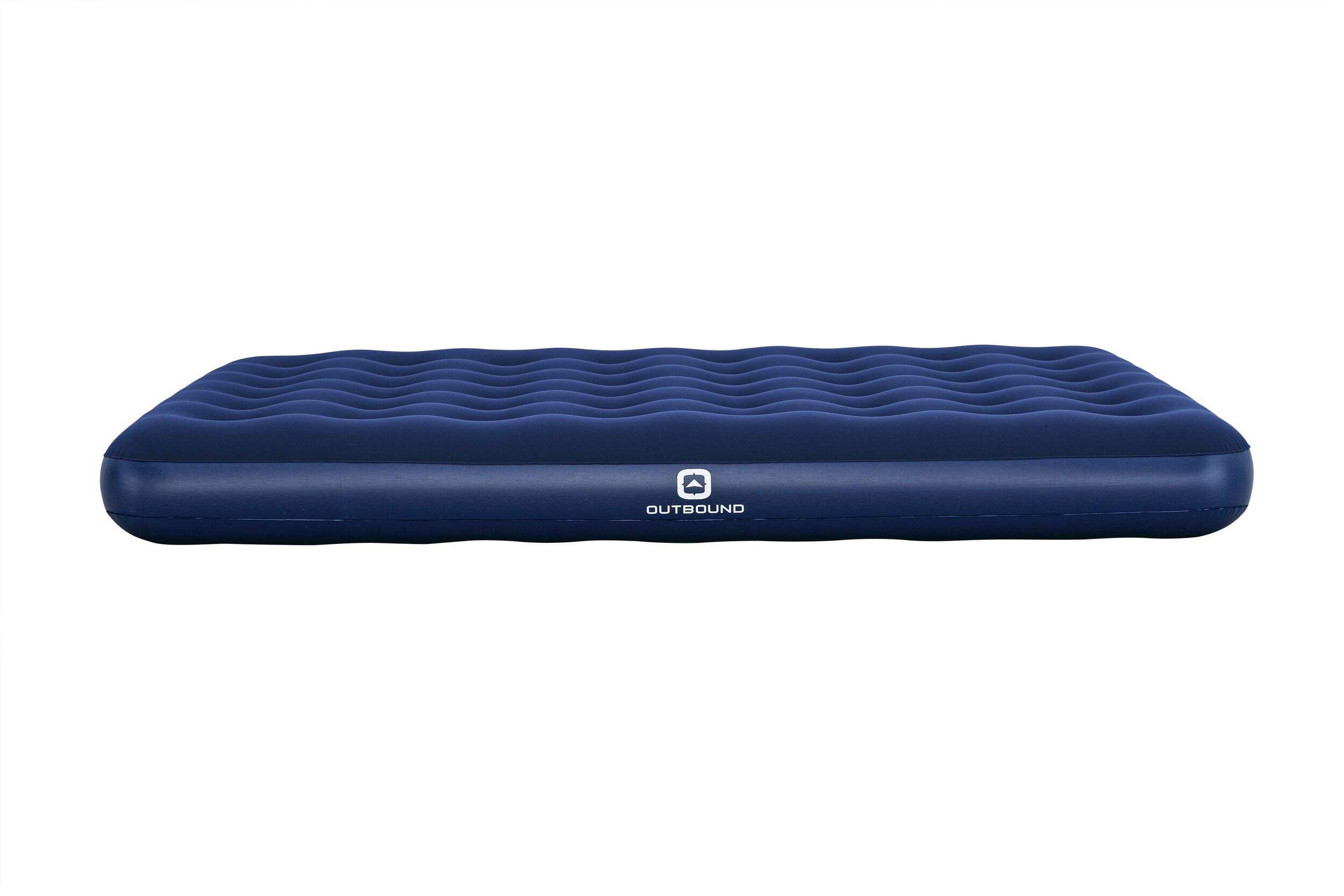 The Outbound Queen Single-High Flocked Air Bed offers comfort, stability, and support, making it ideal for camping trips, sleepovers, and more. Its durable coil beam construction ensures even weight distribution and prevents sagging. Made from water-resistant vinyl, it features a screw valve for quick inflation and deflation and easily rolls up for convenient storage. With a weight capacity of 650 lb (295 kg), it's a reliable choice for any occasion.