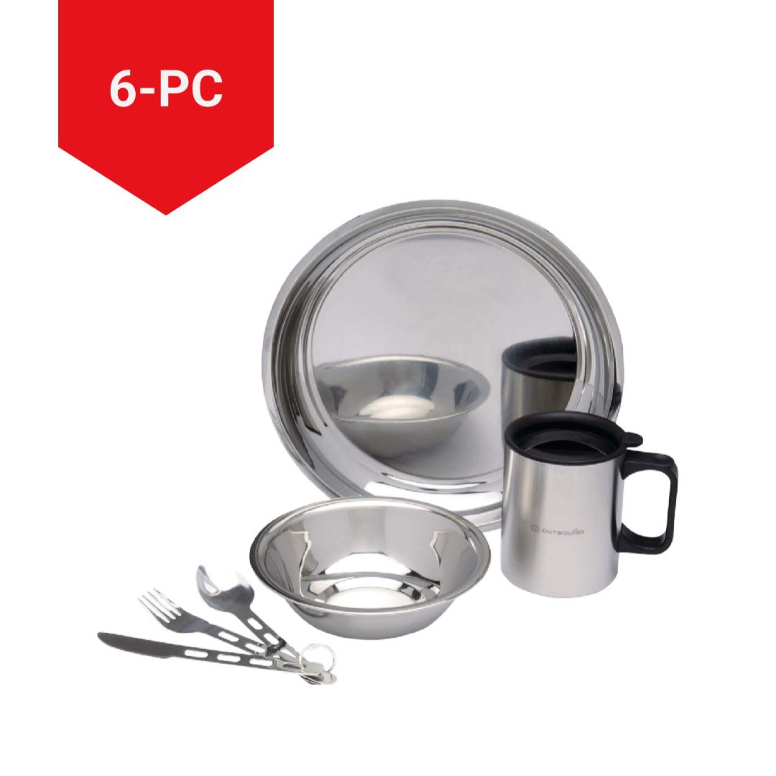 Includes: 25.4 cm (10") dinner plate, 15.2 cm (6") bowl, double walled mug with lid, fork, spoon, knife, and a mesh carry bag