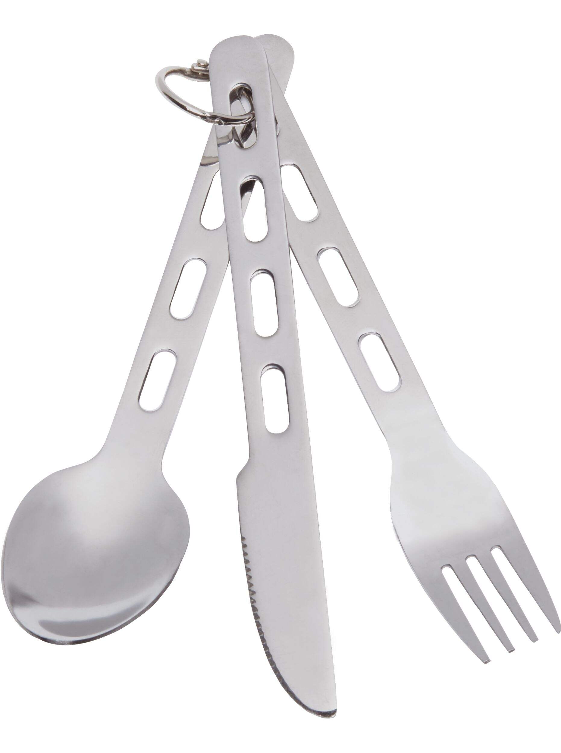 The Outbound Individual Stainless Steel Table Set is perfect for outdoor meals. It includes a knife, fork, and spoon with a minimalist design and keyring to prevent loss. The set also features a steel bowl and plate, both sized for single servings, and a double-walled thermal mug to keep drinks at the right temperature. Made from heavy gauge stainless steel, this set is durable and convenient for camping.