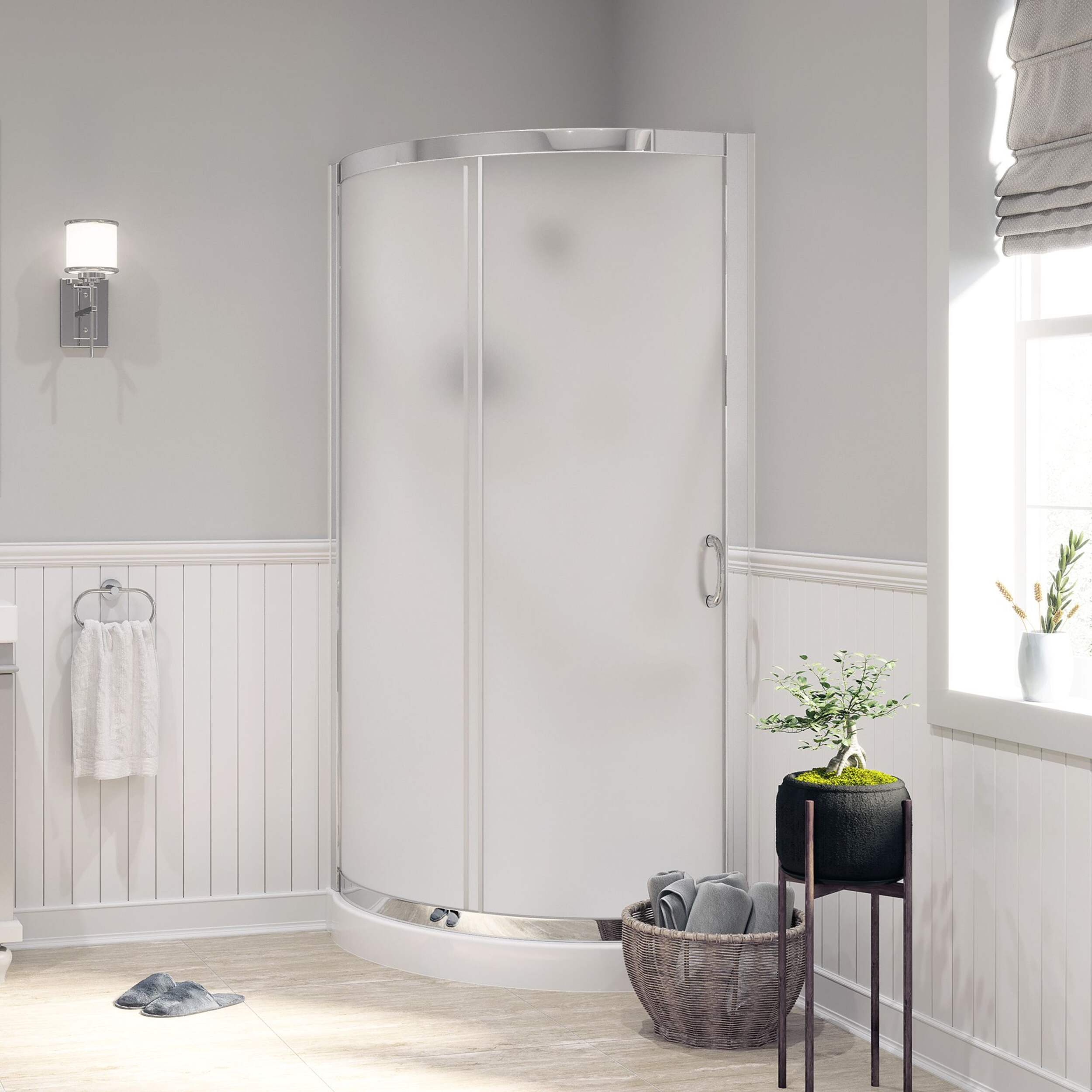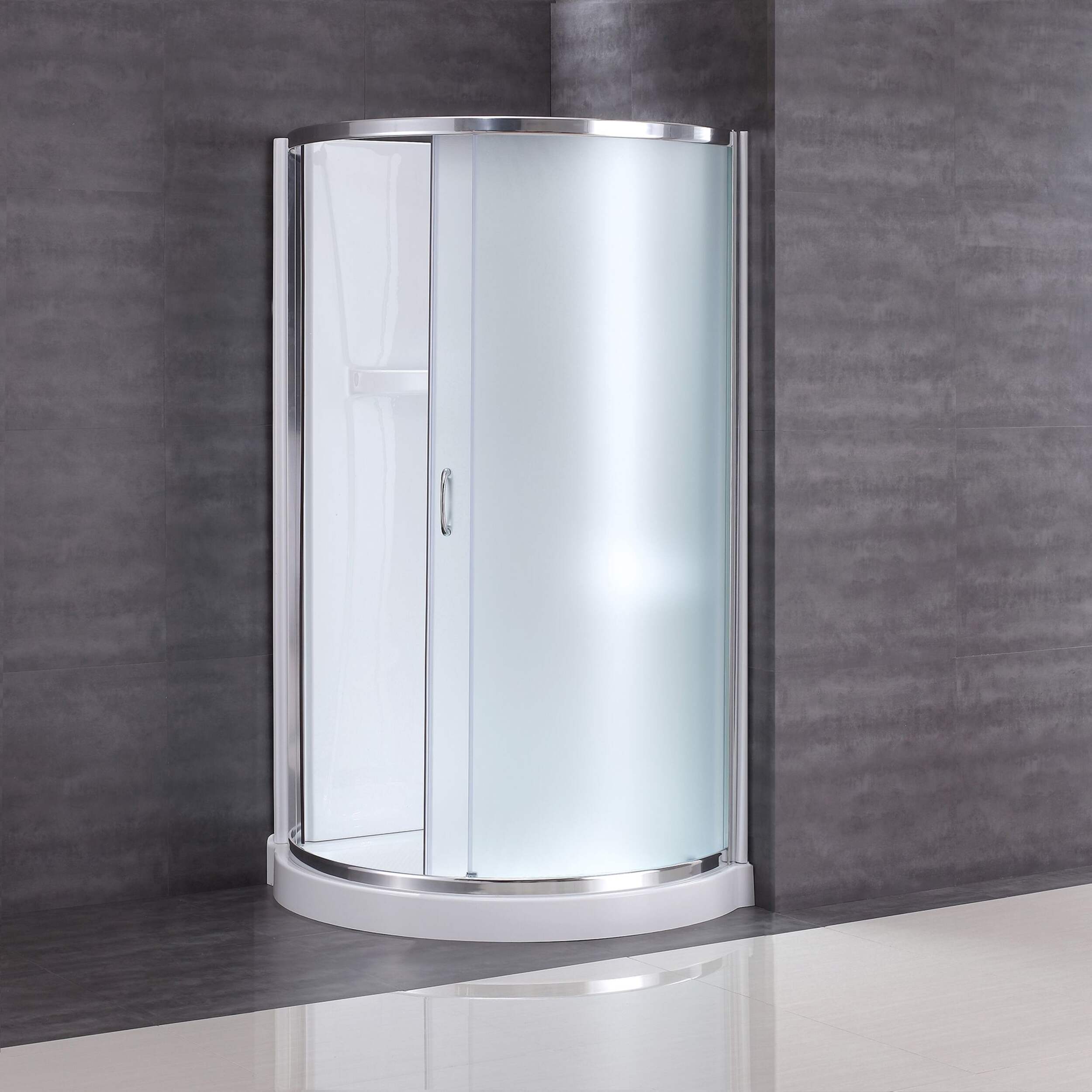 Premium shower kit includes acrylic base, sliding intimacy patterned shower door and acrylic walls