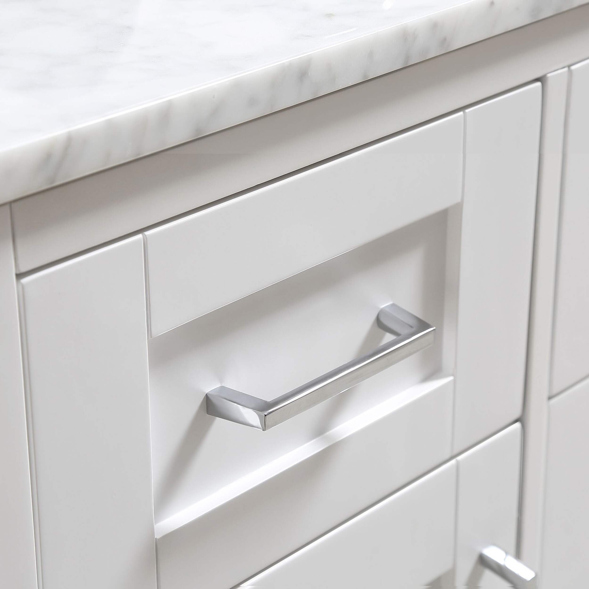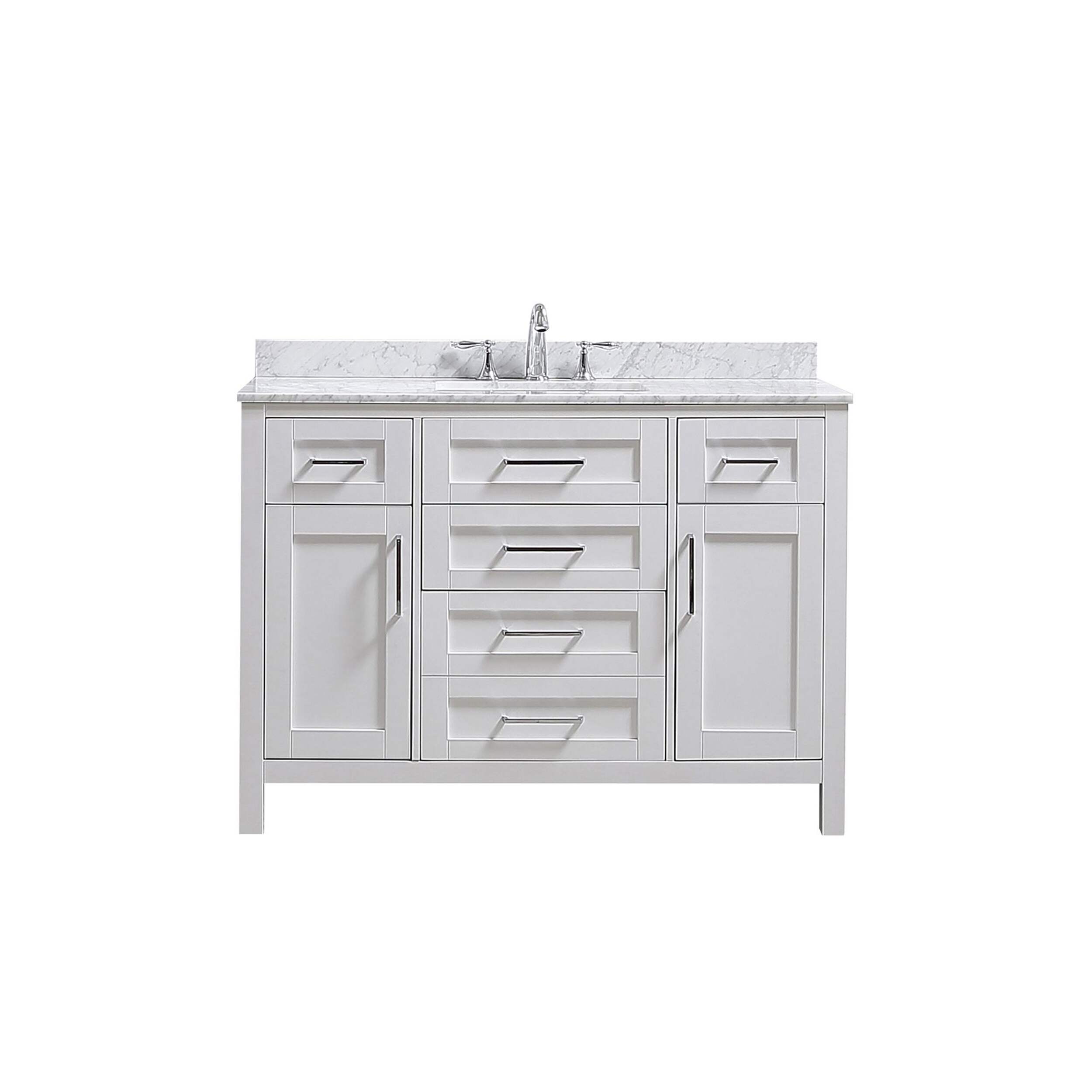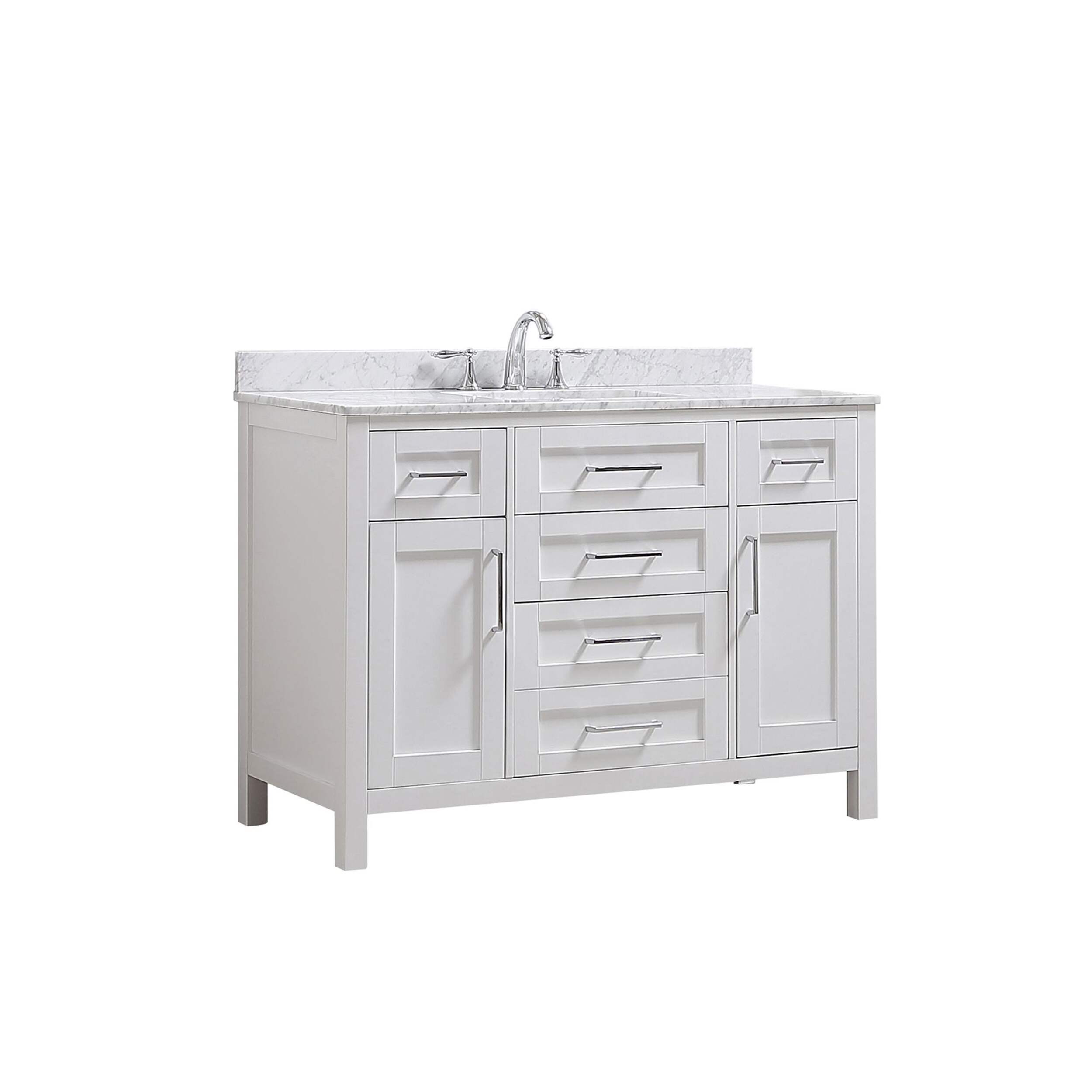 The 48 in. Tahoe vanity is the epitome of sophisticated simplicity. The drawers include integrated organizers and a tilt down front drawer for added convenience. The Tahoe family is offered in pure white and dove grey finishes and includes soft close hinges as well as the clean chrome pulls, ensuring any size a beautiful addition to any bathroom in your home. The Carrara Marble white marble top and a beautiful under mount ceramic sink come pre-attached, making your Tahoe vanity both functional and beautiful.
