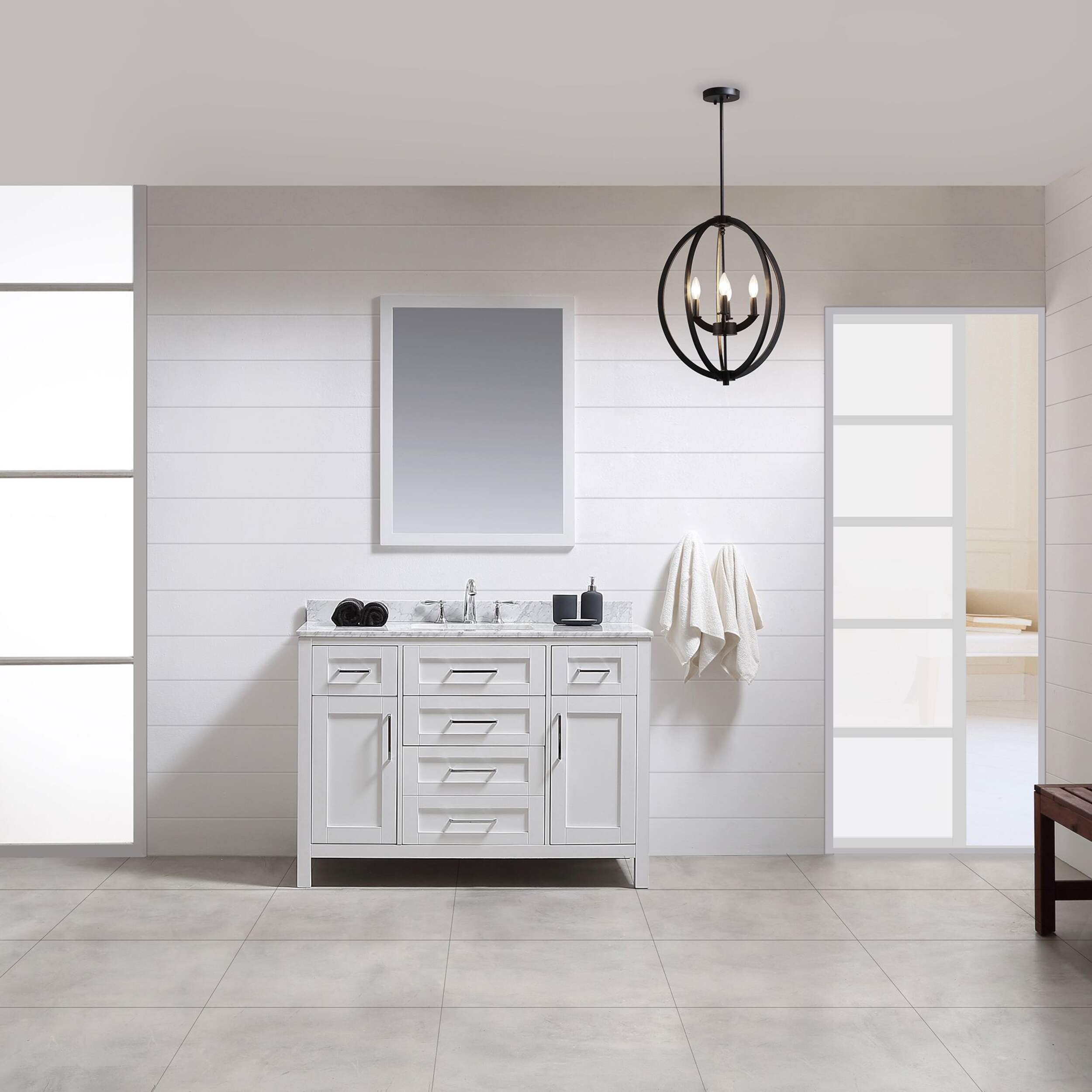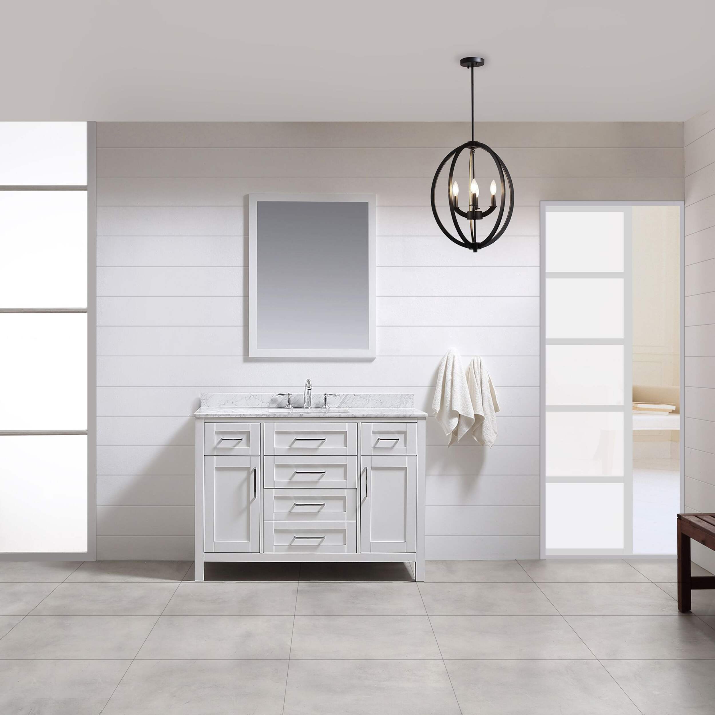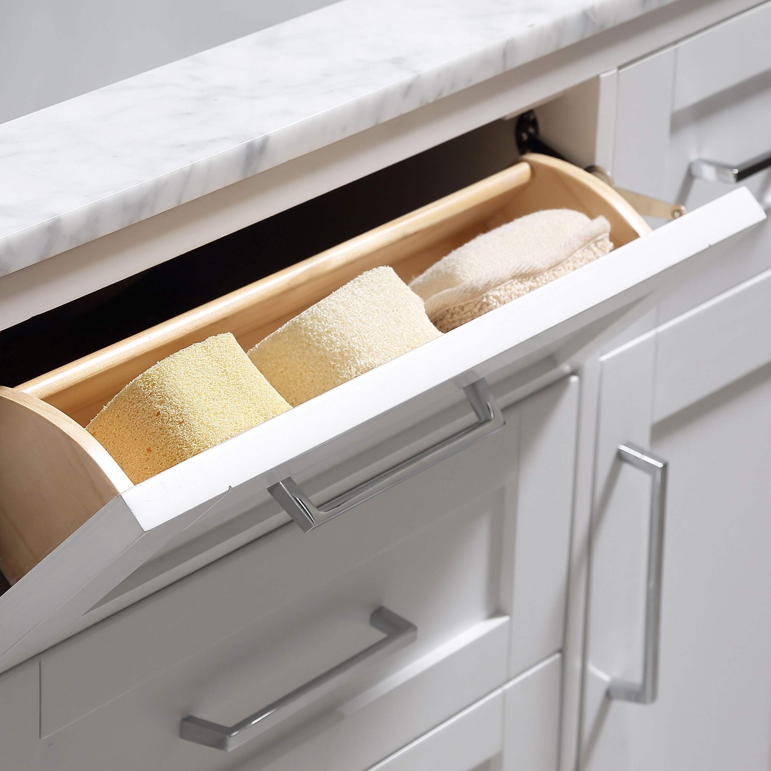The 48 in. Tahoe vanity is the epitome of sophisticated simplicity. The drawers include integrated organizers and a tilt down front drawer for added convenience. The Tahoe family is offered in pure white and dove grey finishes and includes soft close hinges as well as the clean chrome pulls, ensuring any size a beautiful addition to any bathroom in your home. The Carrara Marble white marble top and a beautiful under mount ceramic sink come pre-attached, making your Tahoe vanity both functional and beautiful.