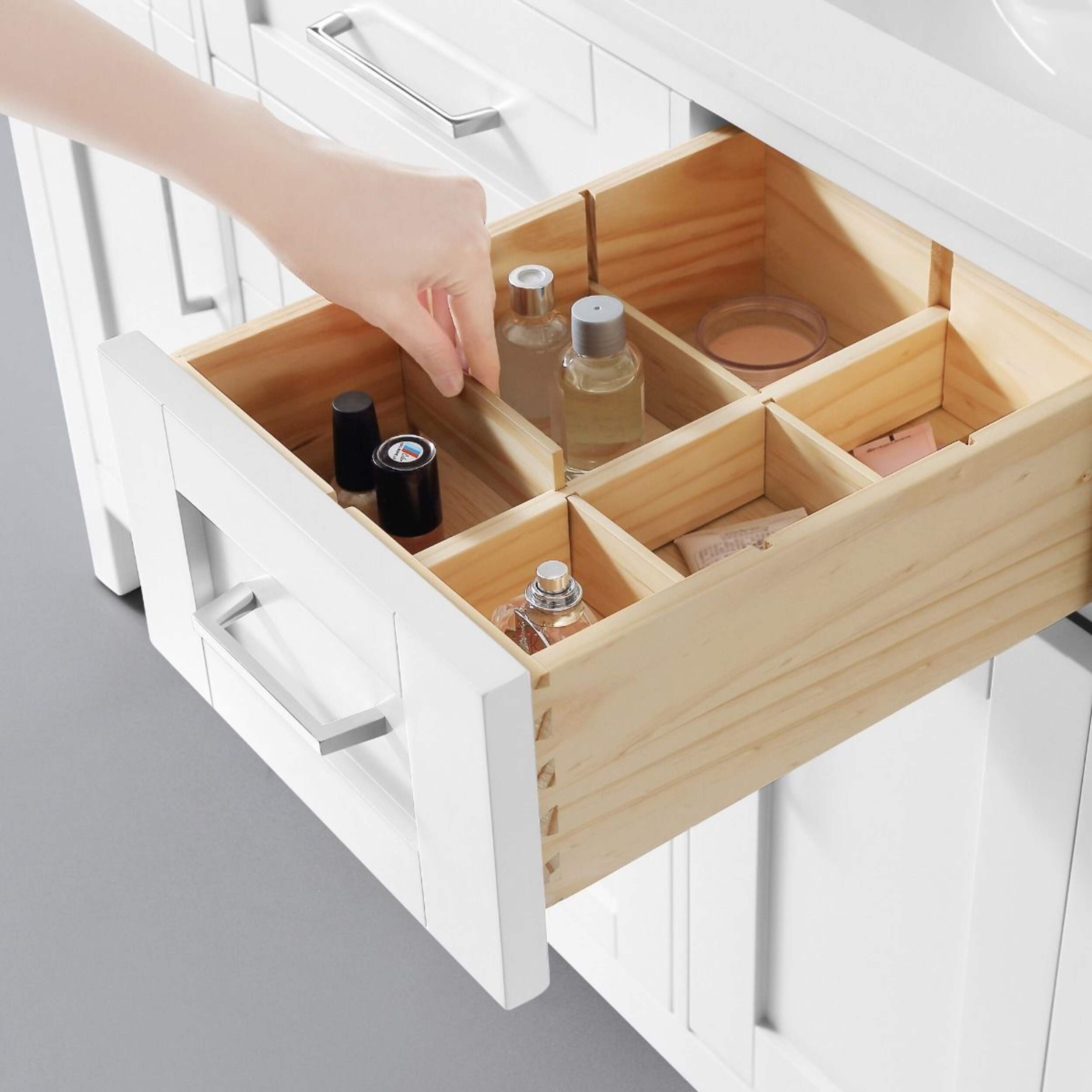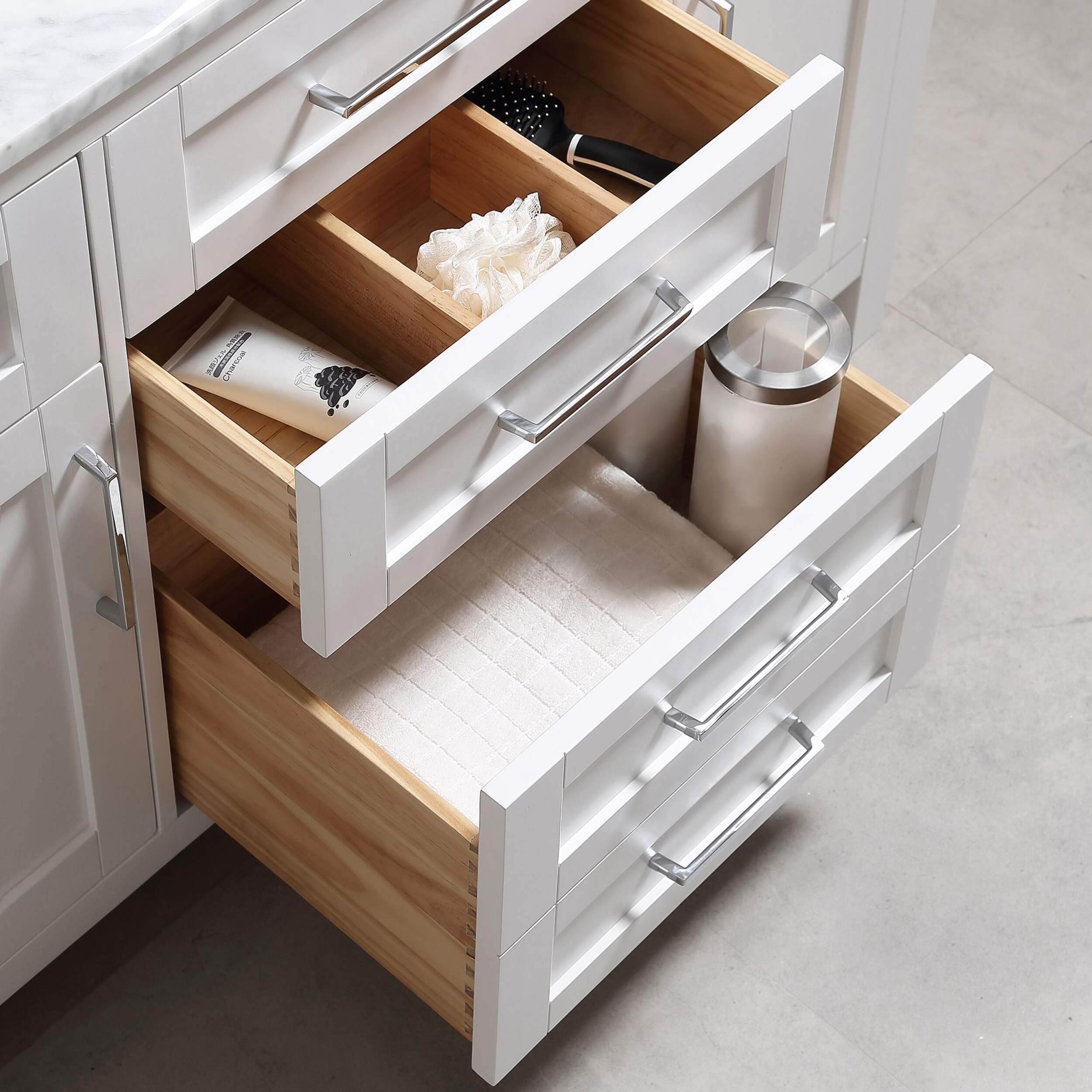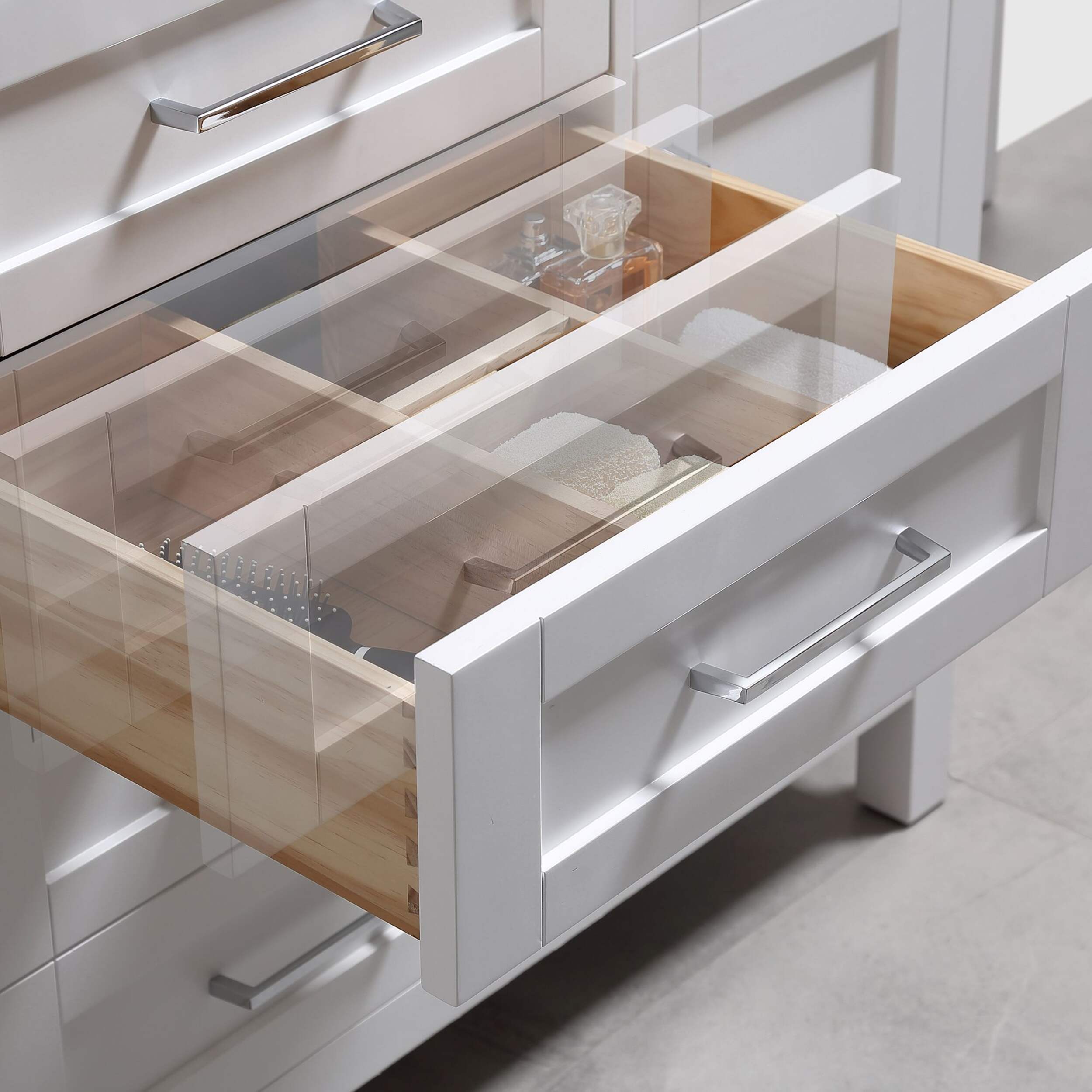 The drawers include integrated organizers and a tilt down front drawer for added convenience