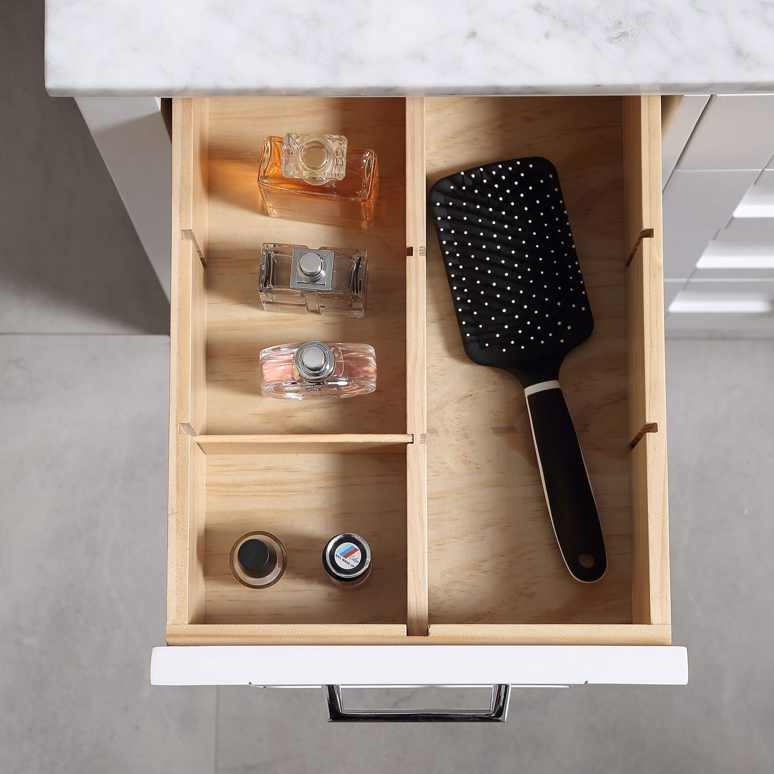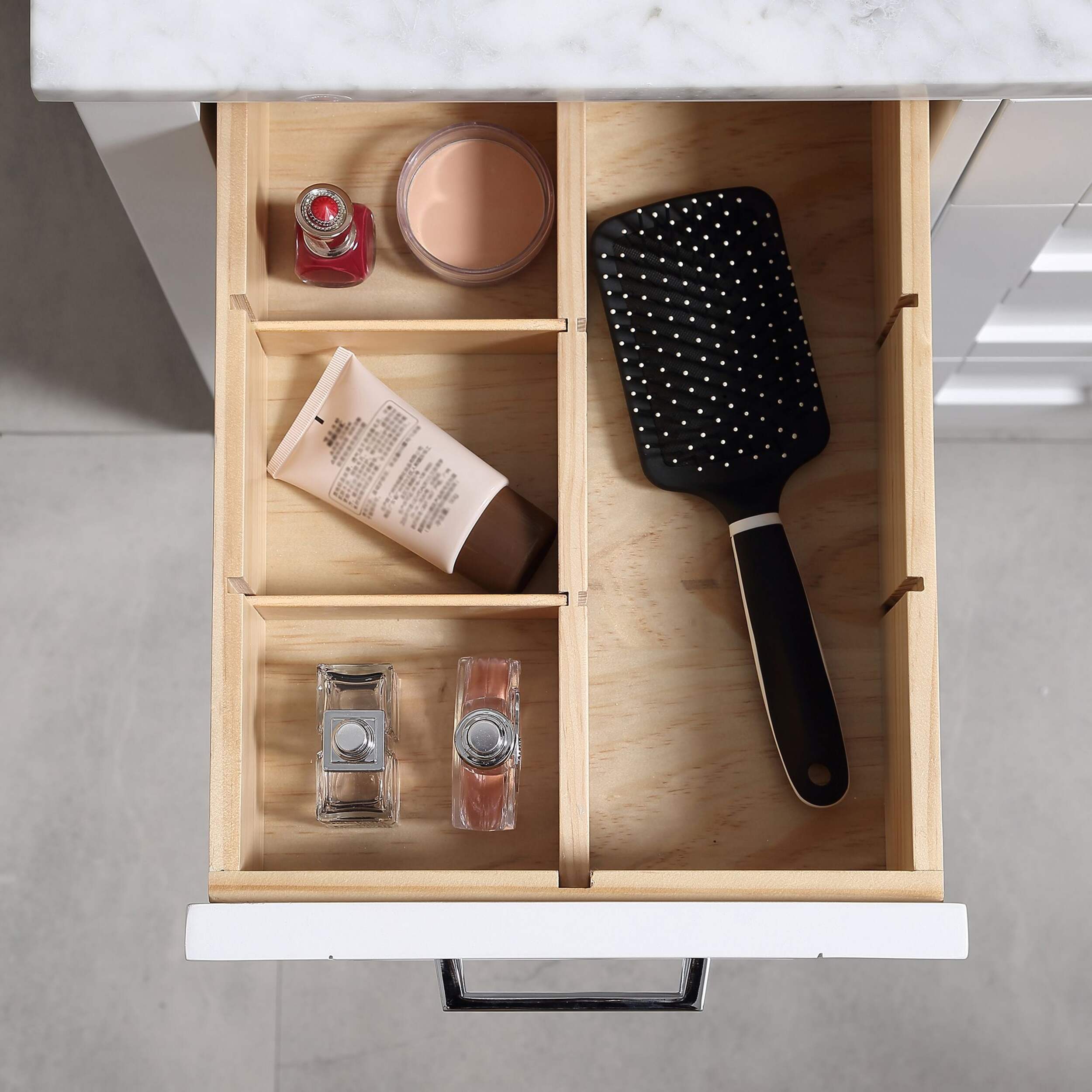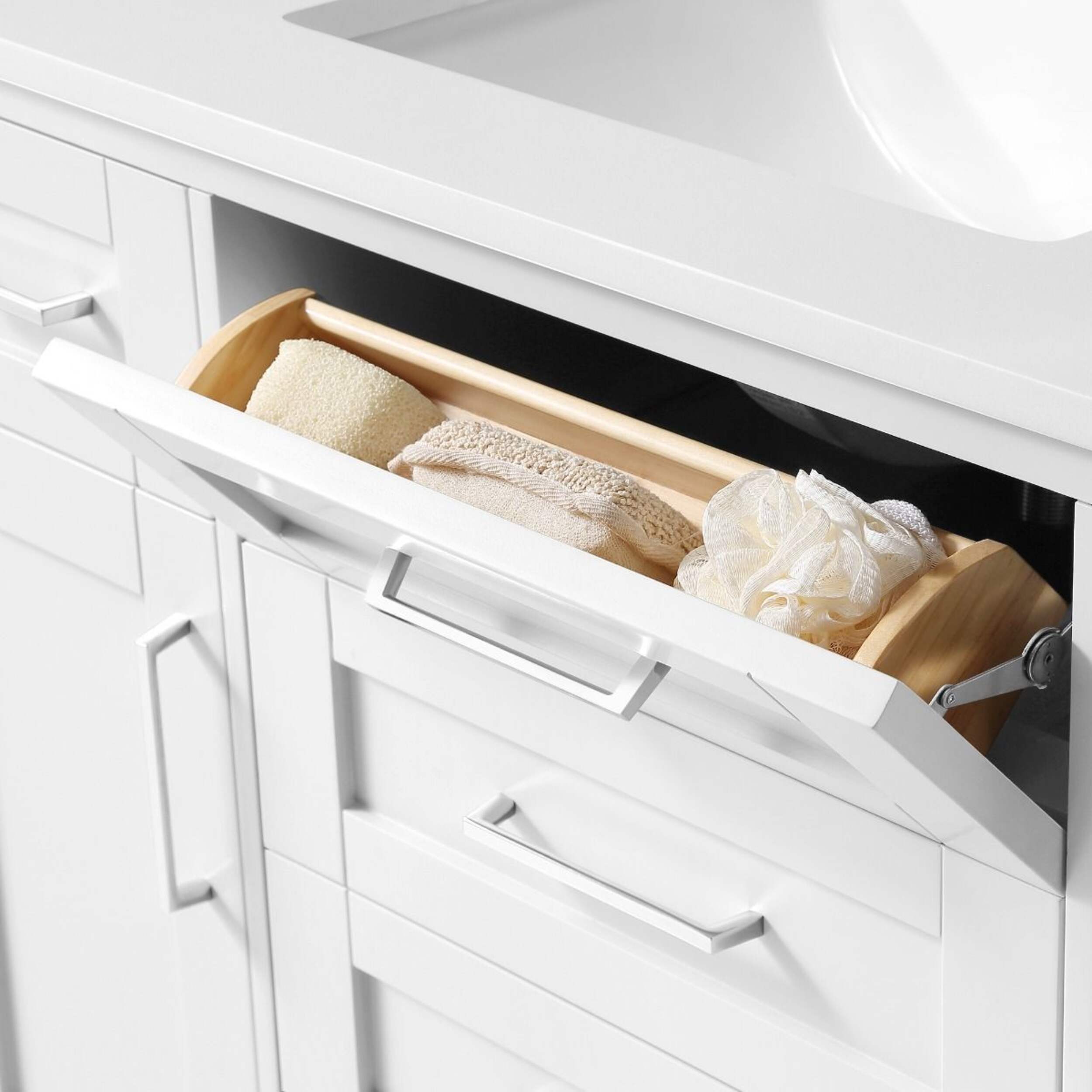 The drawers include integrated organizers and a tilt down front drawer for added convenience