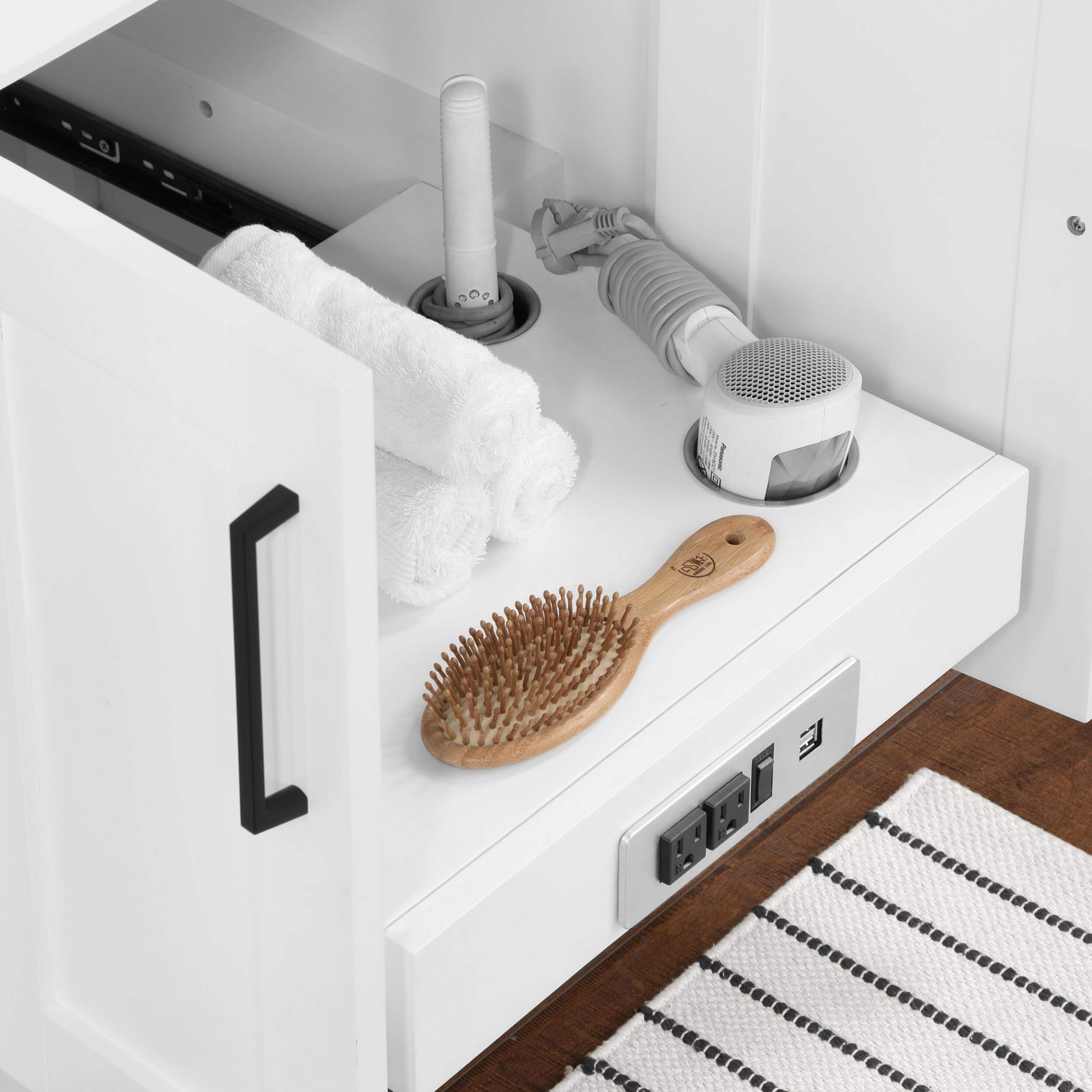 Pull-out shelf with integrated power bar includes USB ports, power sockets, and hair accessories holders