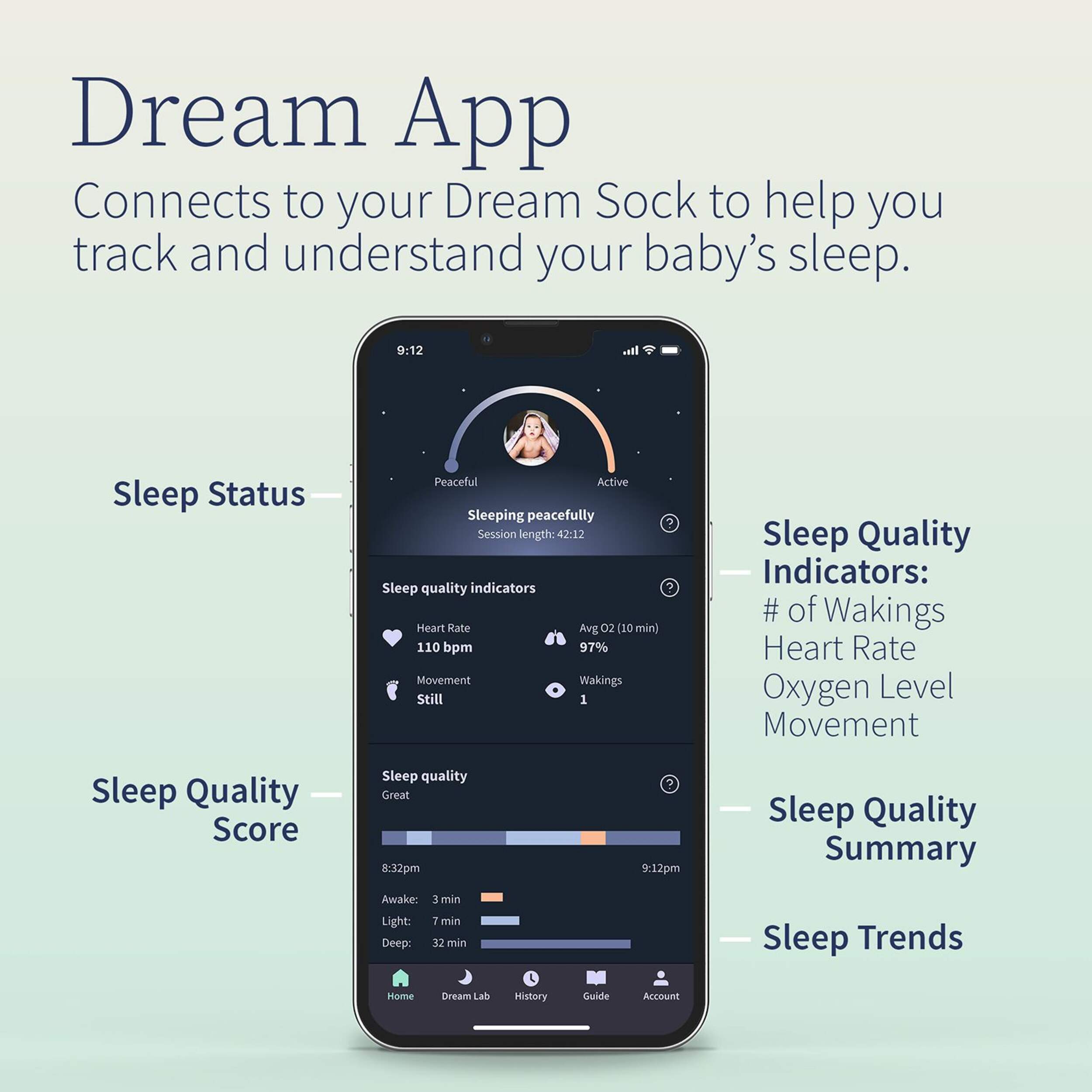 Track your baby’s sleep trends. The Dream Sock is worn for every nap and bedtime and uses award-winning technology to track your baby’s sleep, including wakings, heart rate, average oxygen level, sleep quality, and total hours slept