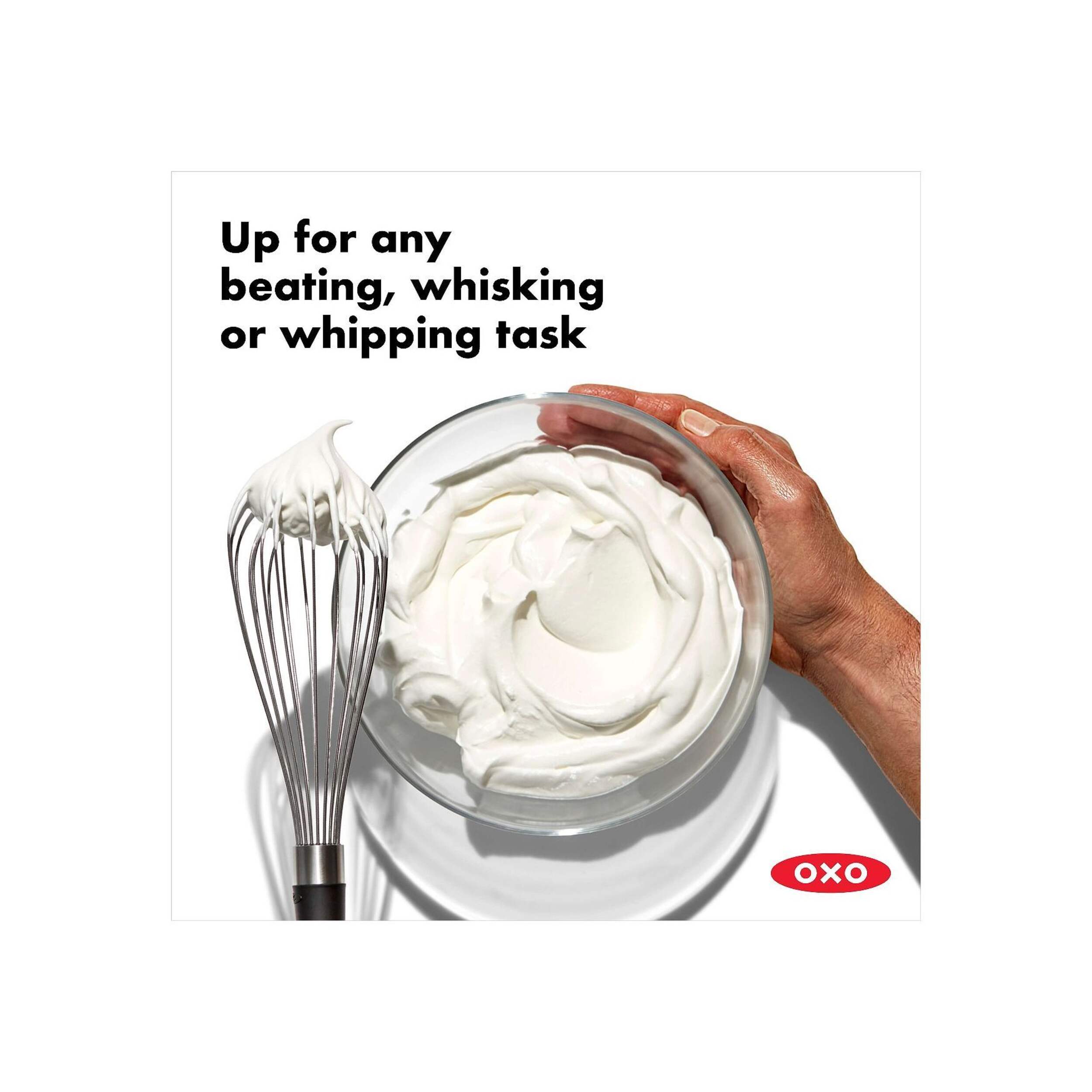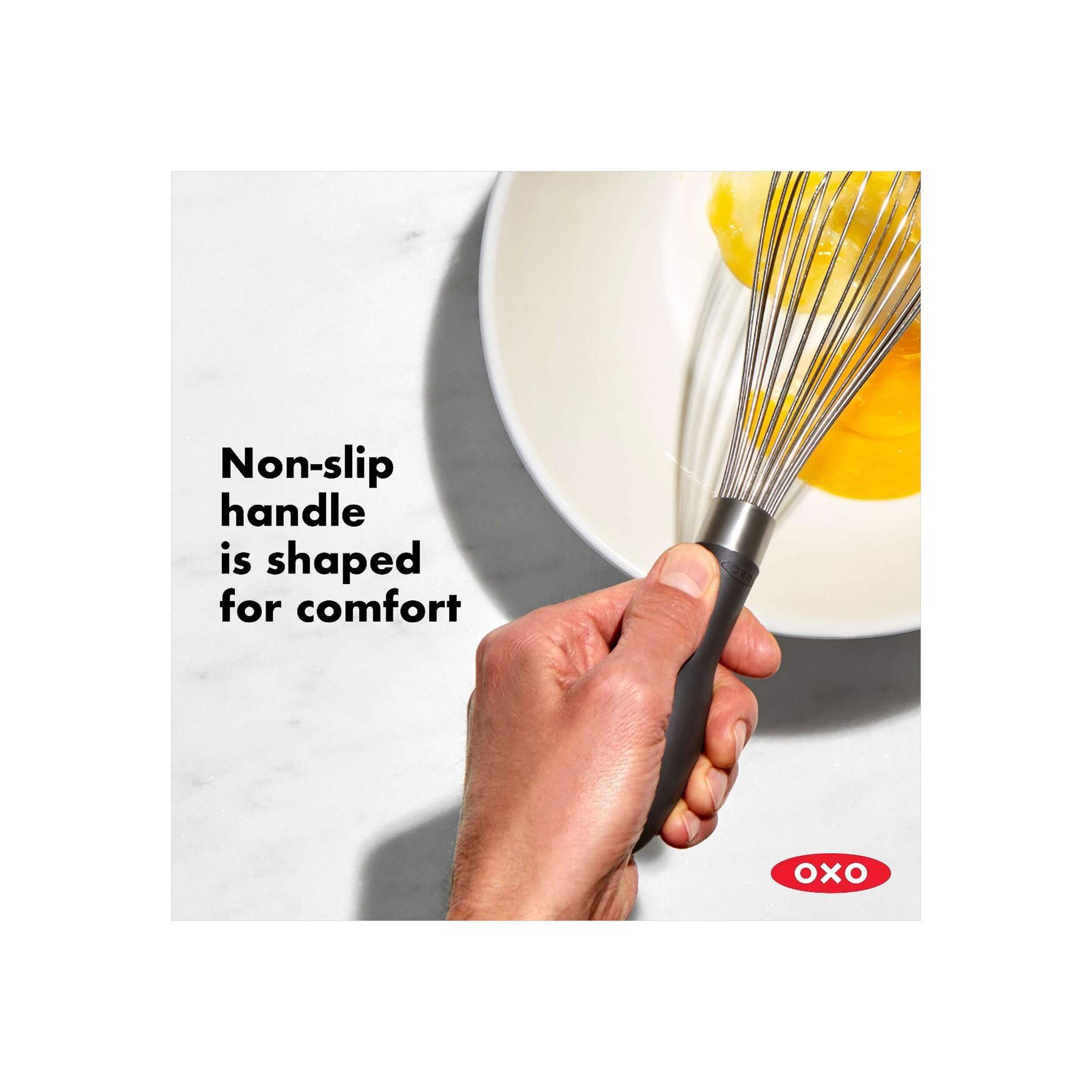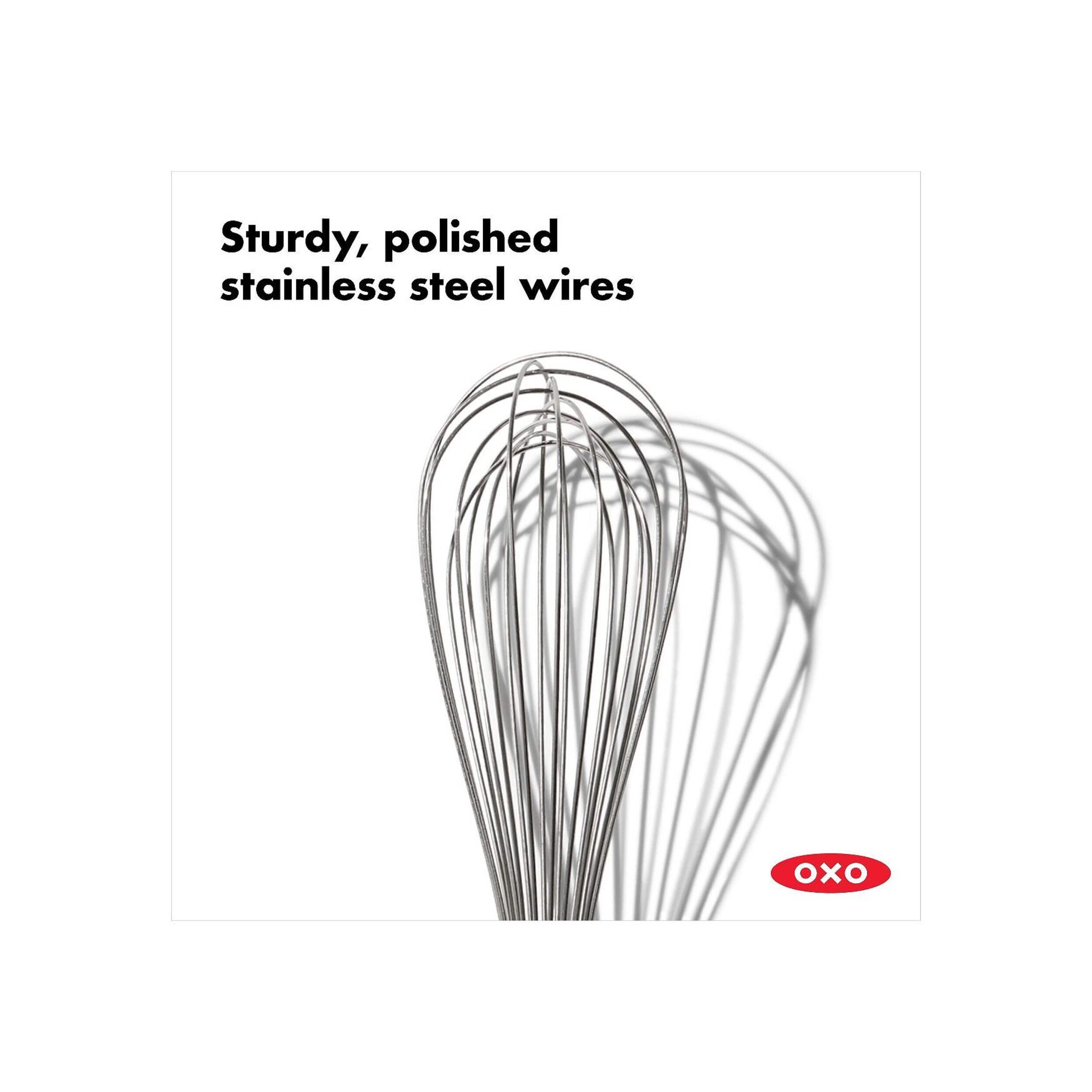 The OXO Good Grips Whisk Balloon whisk features polished stainless steel wires and a balloon-shaped head, designed for effortless whipping. Ideal for whipping cream, beating eggs, or blending batters, the OXO Good Grips Whisk Balloon offers exceptional performance and convenience in the kitchen. Its ergonomic design and high-quality construction make it a reliable and long-lasting kitchen tool.