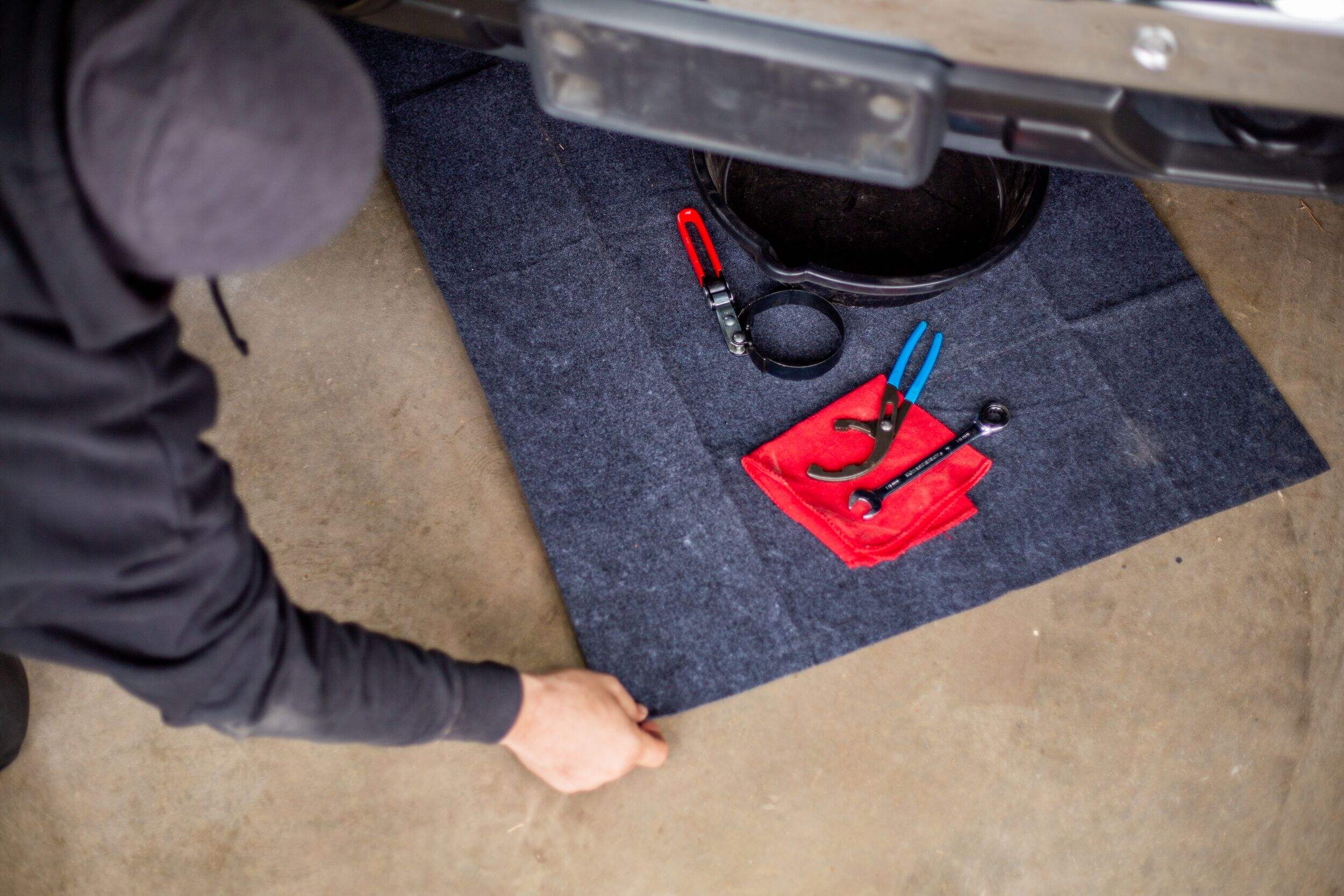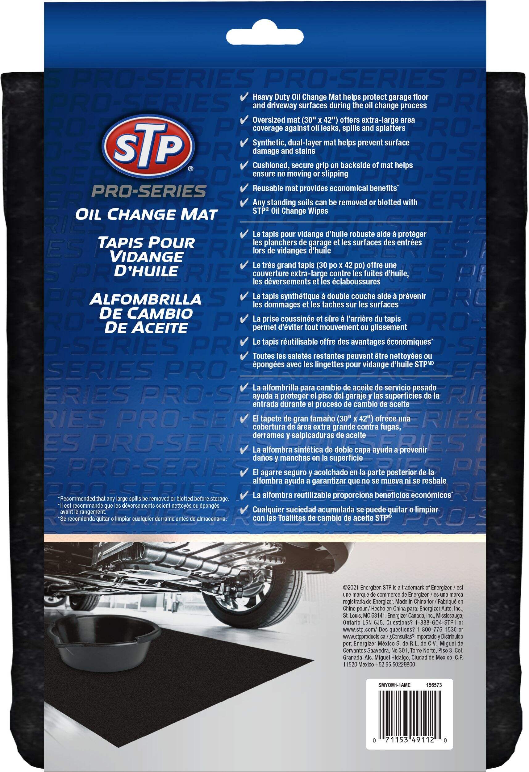 The STP Pro Series Heavy Duty Oil Change Mat helps protect garage floors and driveway surfaces during the oil change process. The oversized mat measures 30” by 42” to offer extra coverage against engine oil leaks, spills and splatters. This synthetic, dual-layer mat helps prevent surface damage and stains from motor oil and oil change tools by soaking up spills. Cushioned with a secure grip on the backside, this mat stays in place with no moving or slipping. Place the reusable mat down before you start your oil change. When you're done, wipe up any spills before storage. Remove or blot 5W30 motor oil or other spills with STP Oil Change Wipes.