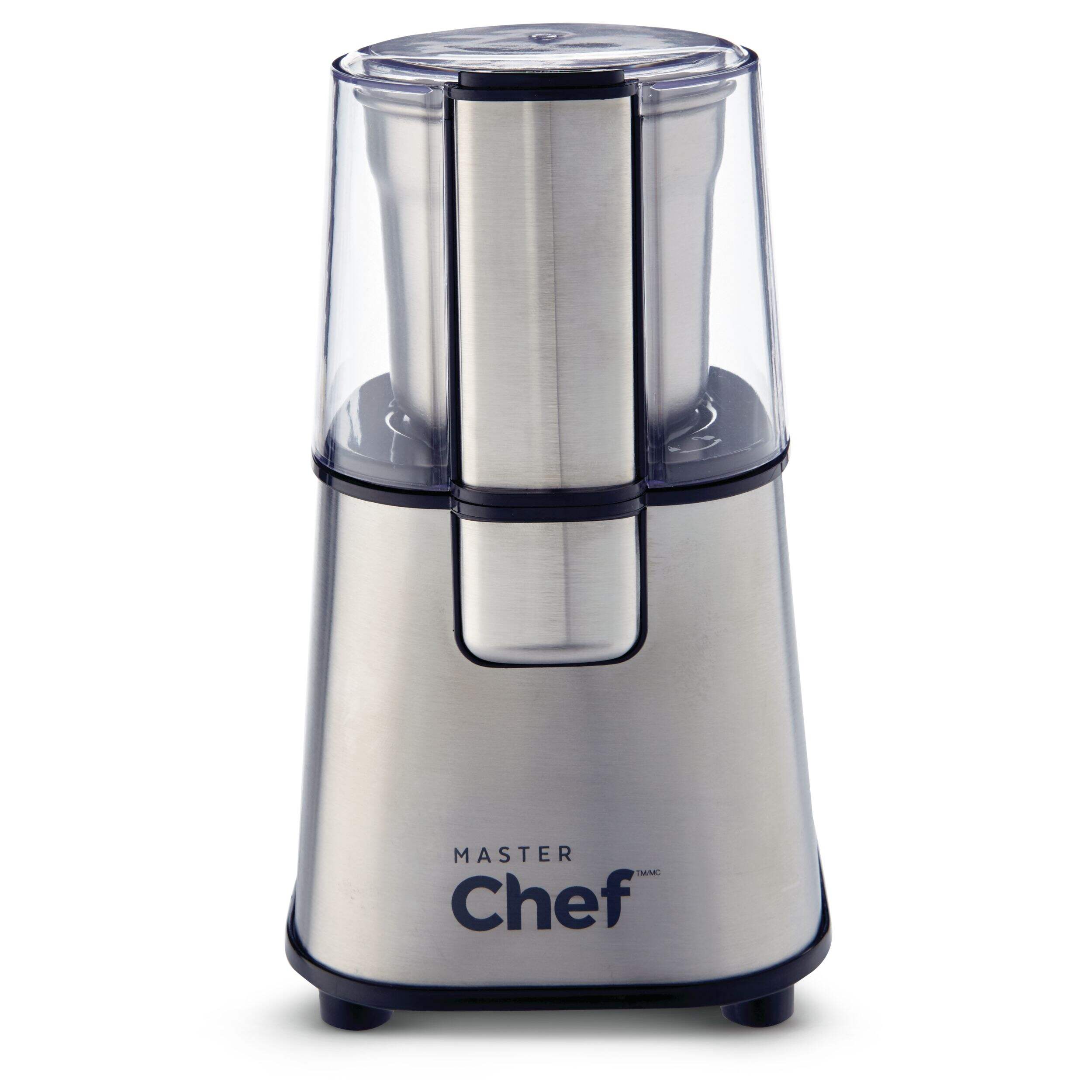 Quickly and easily grind coffee and spices with this easy-to-use coffee bean grinder. The MASTER Chef Elite Coffee Grinder features durable stainless steel blades that cut through coffee beans and hard spices to achieve the texture you're looking for – coarse or powdered. The lid is see-through, so you can fully observe the grind process during use. The coffee grinder machine also has a removable cup and safe lid design.