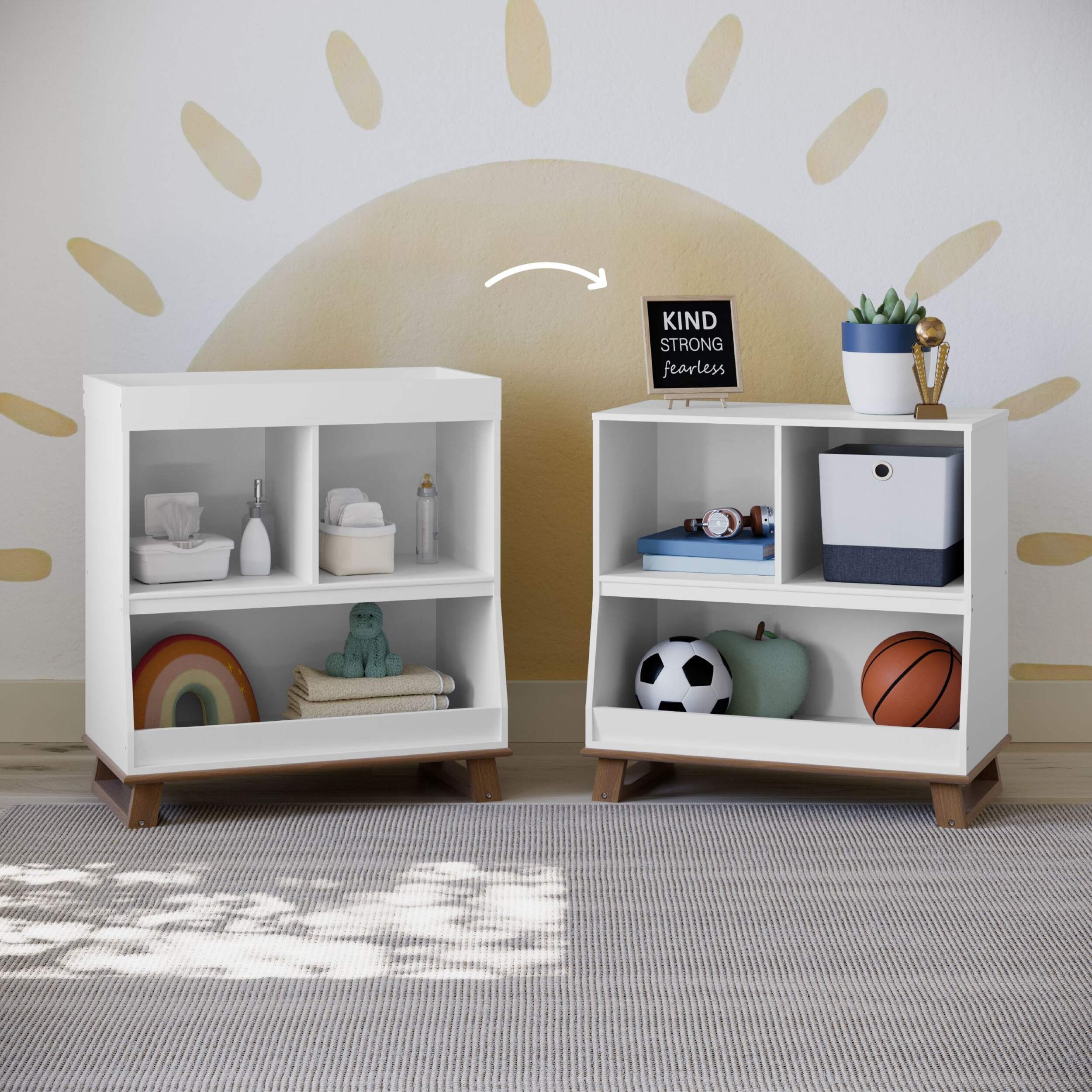 The Storkcraft Modern Pacific Change Table Storage adapts with your child, transitioning from nursery to bedroom. The removable changing topper allows you to convert the table into a storage unit as your baby grows. Multiple compartments help organize all of baby's essentials, with two open cubbies and a large bottom bin. This stylish, screened furniture piece provides ample storage now and in the future. As your child develops, the change table conveniently adapts into a bedroom storage unit with compartments galore.