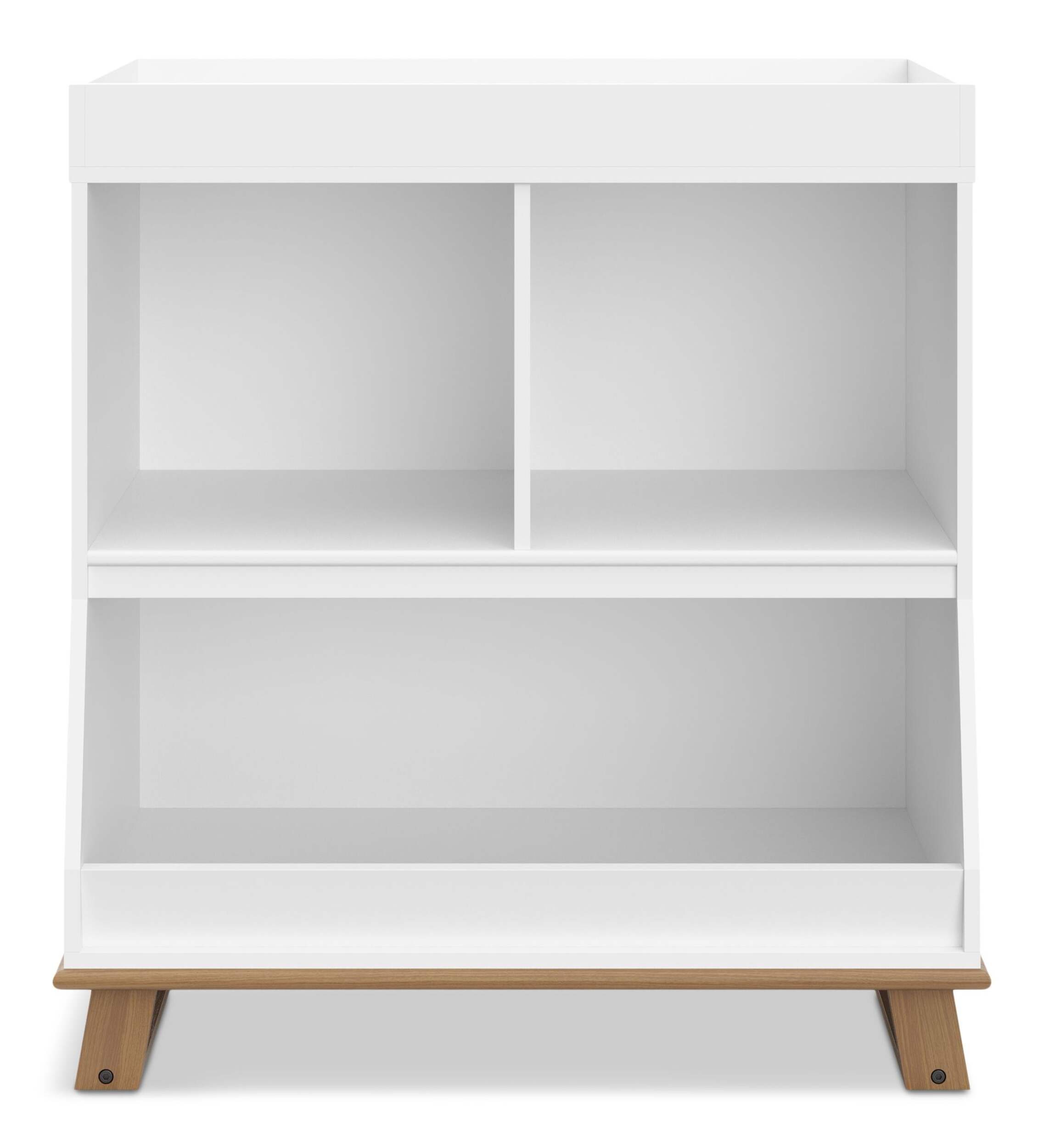 Features 2 open storage cubbies and 1 large, spacious bottom storage bin