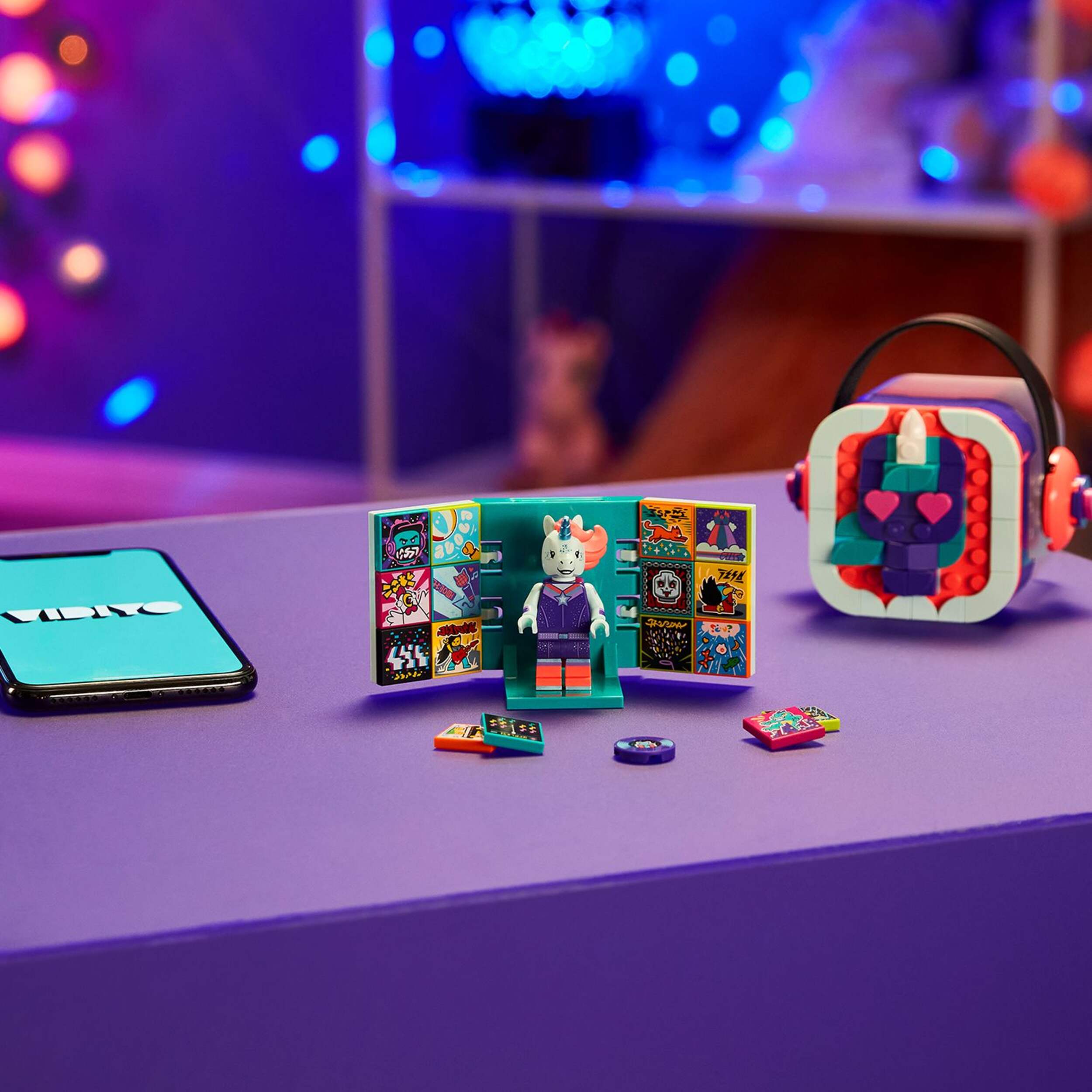 The LEGO® VIDIYO™ app is compatible with selected iOS and Android devices. Please check compatibility at www.LEGO.com/devicecheck. Children should ask parents' permission before going online.Open up the world of music video making for kids who love to dance and perform. This LEGO® VIDIYO™ Unicorn DJ BeatBox (43106) makes every playtime exciting. Download the free app to scan the music minifigure and reveal the unicorn DJ’s cool stage persona. Then scan the BeatBits to unlock special effects, challenges and more as kids produce their own unique music video, to share with other creators in the kid-safe social feed.Portable for fun on the move - Kids will love styling the BeatBox using the LEGO pieces. They can choose from a unicorn, DJ deck or rainbow cloud design – or make up their own. The BeatBox folds up with space to store the BeatBits and minifigure so it’s ideal for play on the go.Create music experiences - LEGO VIDIYO sets offer a safe social play experience, helping kids become directors, producers and stars of their own music videos. See their creativity grow as they produce videos packed with musical mash-ups, fun characters, songs, dance moves and amazing effects.
