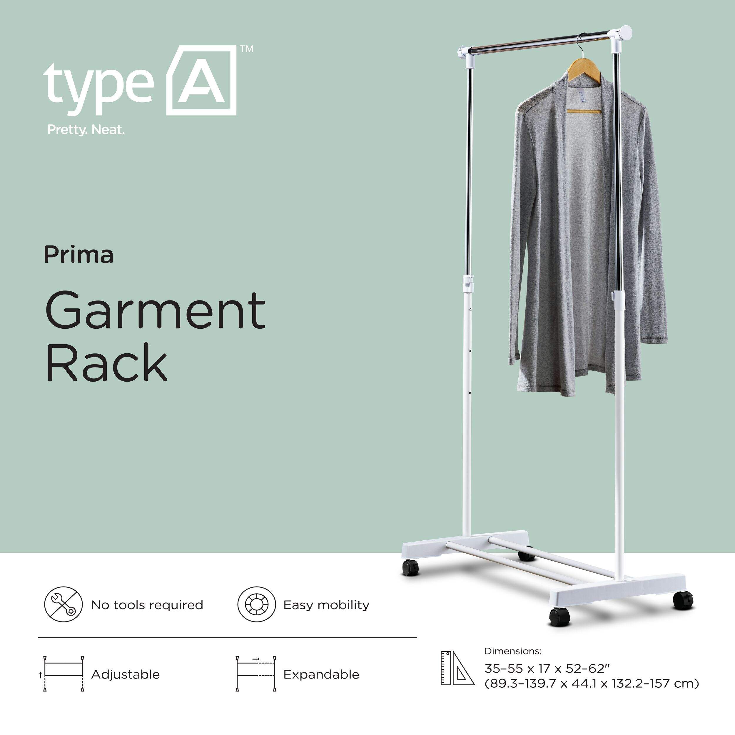 The type A Prima Freestanding Adjustable Clothing Rack is a practical and versatile solution for storing seasonal outfits or expanding closet space. With its tool-free assembly, you can easily set it up in minutes, making it ideal for renters, dorm rooms, or small apartments. This clothing rack features four swivel caster wheels for mobility, while its adjustable height allows you to hang a variety of garments, from shirts to long coats.
