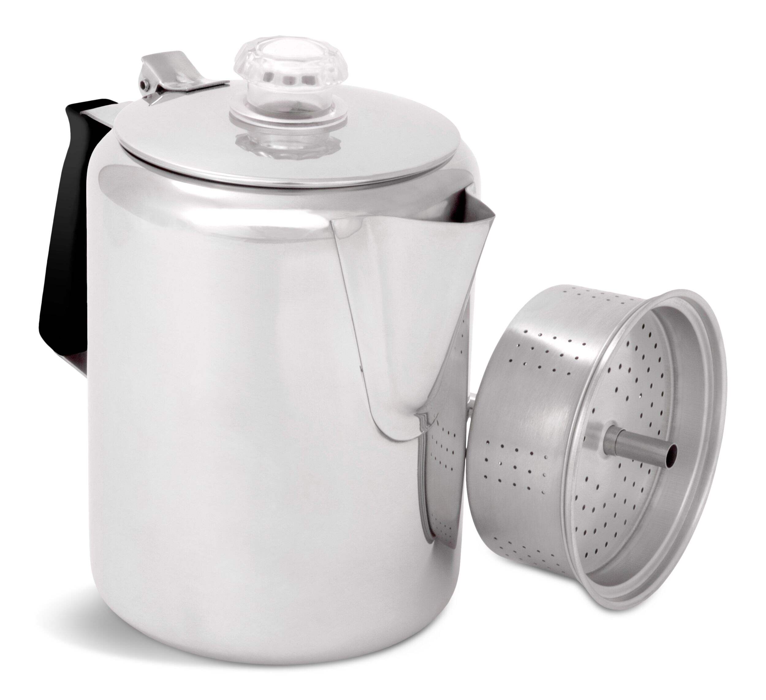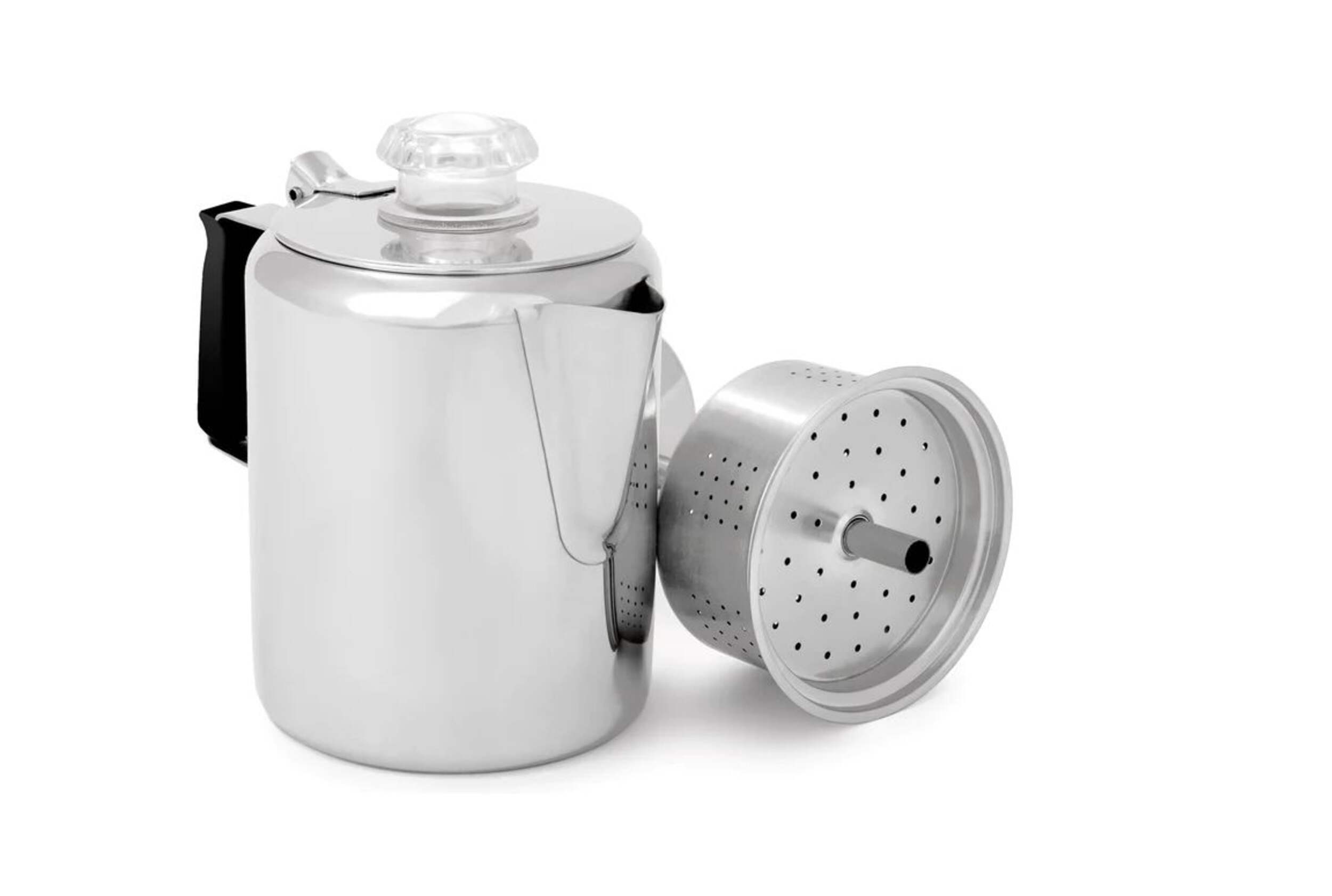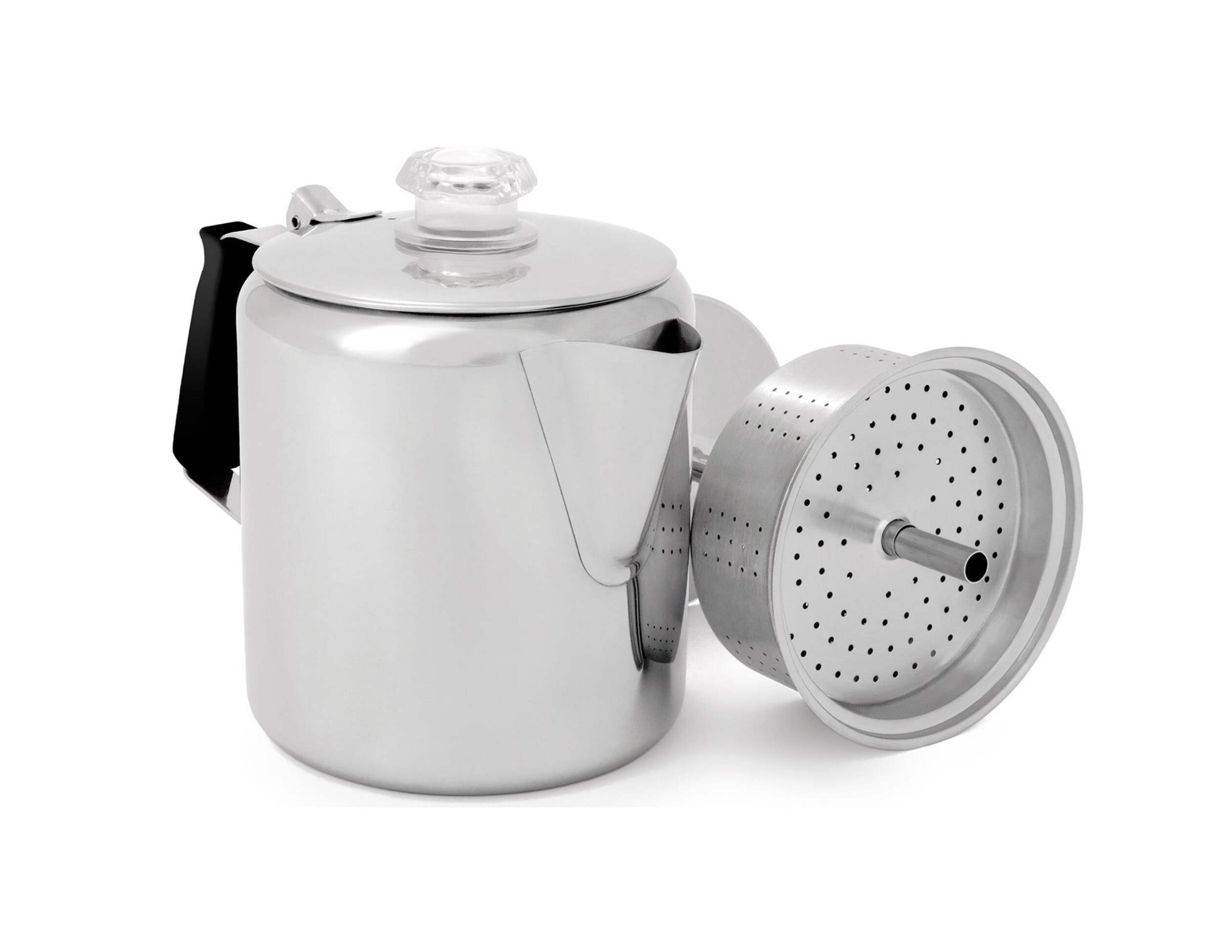 Ultra-rugged, Glacier Stainless stovetop coffee maker Perk up mornings at the campsite or cabin with the classic yet rugged stainless steel Glacier Perc coffee percolator from GSI Outdoors, great for use on stove tops. Features heavy-gauge 18/8 stainless steel construction that's resistant to corrosion and will withstand ground impacts and heat-resistant silicone handle that stays cool to the touch for safe and secure pouring, and a hinged lid that helps prevent misplacement. The PercView knob made of clear resin provides a view into brewing progress, and this three-piece percolator includes an inner basket with cover. The stove-top Glacier Perc is available in the following sizes: