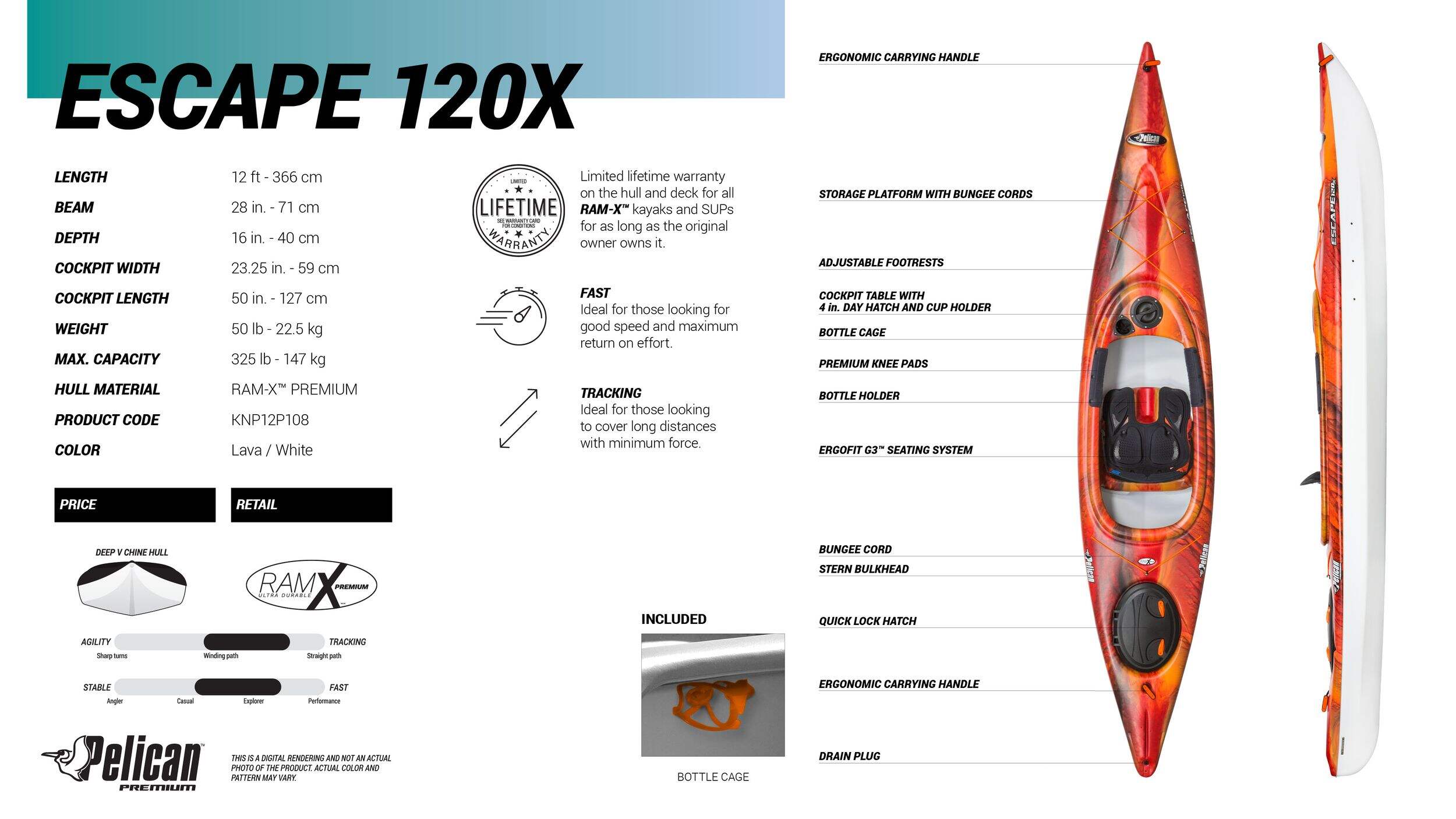 With its deep V-chine hull, the Escape 120X performance kayak is perfect for advanced paddlers seeking enhanced secondary stability. This recreational performance kayak offers a more efficient and effortless paddling experience with improved responsiveness to weight and position shifts. It provides a slightly higher load capacity, easily accommodating your gear. The kayak has convenient features like a 10cm day hatch and a bottle holder in the cockpit table, ensuring easy access to essential items. For additional storage, the rear quick-lock hatch provides a secure space for your belongings. The Escape 120X is the ultimate sit-in kayak for those eager to elevate their kayaking skills and embrace new challenges on the water.