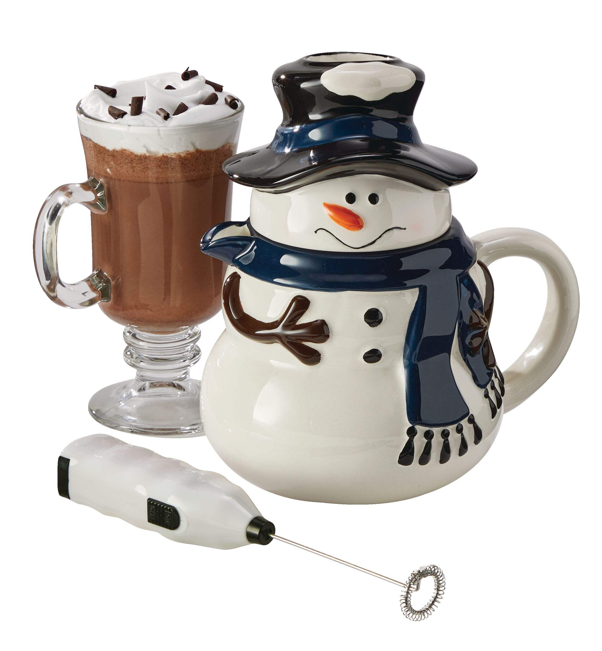 Snowman Carafe Hot Chocolate Maker w/ Mixer features a detailed snowman-shaped hot chocolate server with a lightweight battery-operated machine for mixing your beverage. Microwave safe and easy to clean, this hot chocolate maker is easy to use. Simply pour in your drink mix, blend with the mixer, and drink straight out of the snowman-shaped ceramic server. This hot chocolate machine and serving set is perfect for a cold winter day and has a 1-year warranty included.