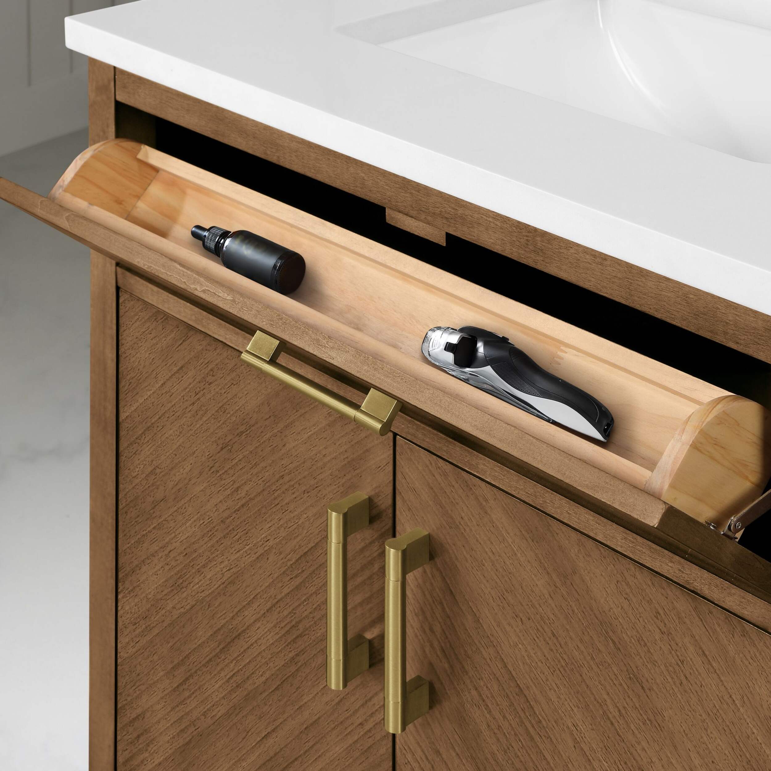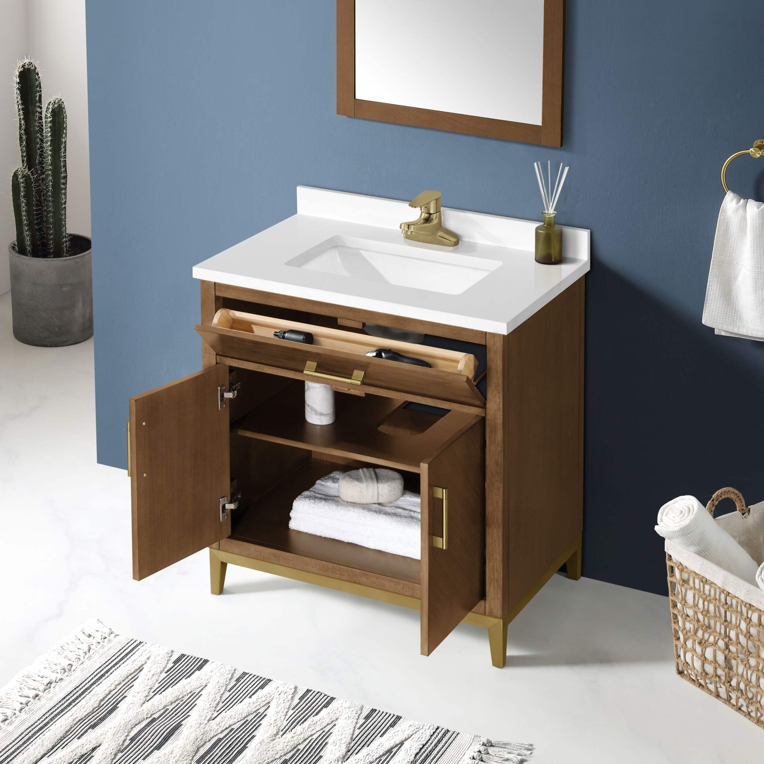 If you have been searching for the perfect piece to complete your bathroom renovation, look no further than the Diya vanity from Ove. It features a soothing Macchiato finish and stunning brushed gold accents to deliver a look that is on-trend yet timeless all at once. Well-suited for powder rooms and small bathrooms, do not let its small size fool you. Thanks to a tilt-down drawer and two-door cabinet, there is enough room to store your daily essentials neatly out of sight for a clutter-free environment. A white engineered stone countertop holds an undermount sink to complement this vanity's clean lines.