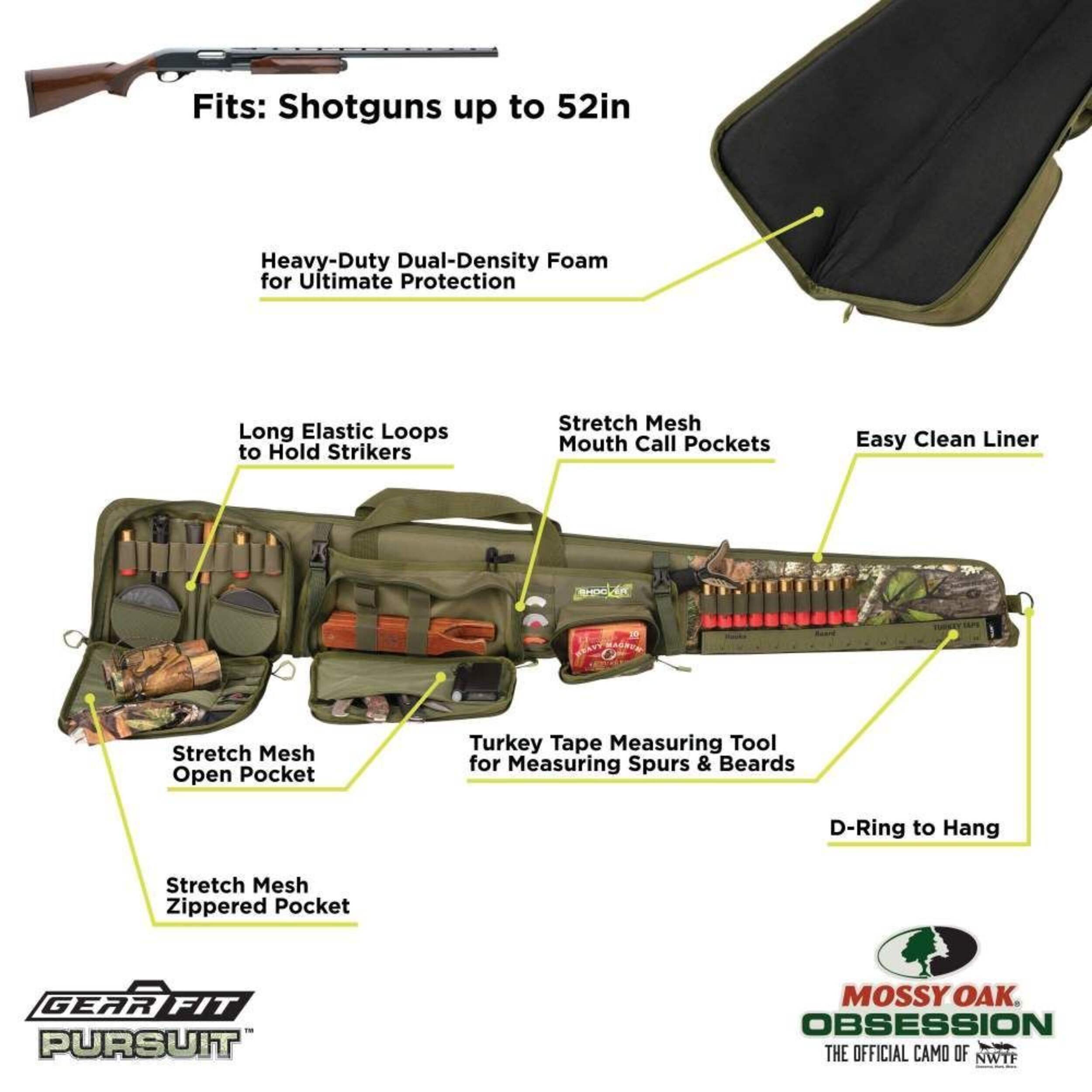 Turkey season awaits with the Shocker™ Turkey Shotgun case from the Gear Fit Pursuit™ line of gun cases. Purpose-driven and designed so you can bring all your turkey hunting essentials with you, from strikers and calls, to choke tubes and more. The Shocker™ case colors are Green with Mossy Oak® Obsession™ accents, the official camo of the National Wild Turkey Federation. This case fits shotguns up to 52-inches and features an integrated turkey beard and spurs tape. The front pocket has neoprene sleeves for your slate calls and customized pockets for your striker and box calls. The rear pocket has four slots for mouth calls and four choke tubes, plus room for other accessories, like gloves and a face mask. The inside of the case features a heavy-duty, dual-density foam for ultimate protection. The lining is easy to clean if you get mud or dirt in your case and the oversized zippers make it easy to open and close. The Shocker™ Turkey Shotgun case is lockable to help keep your shotgun safe.